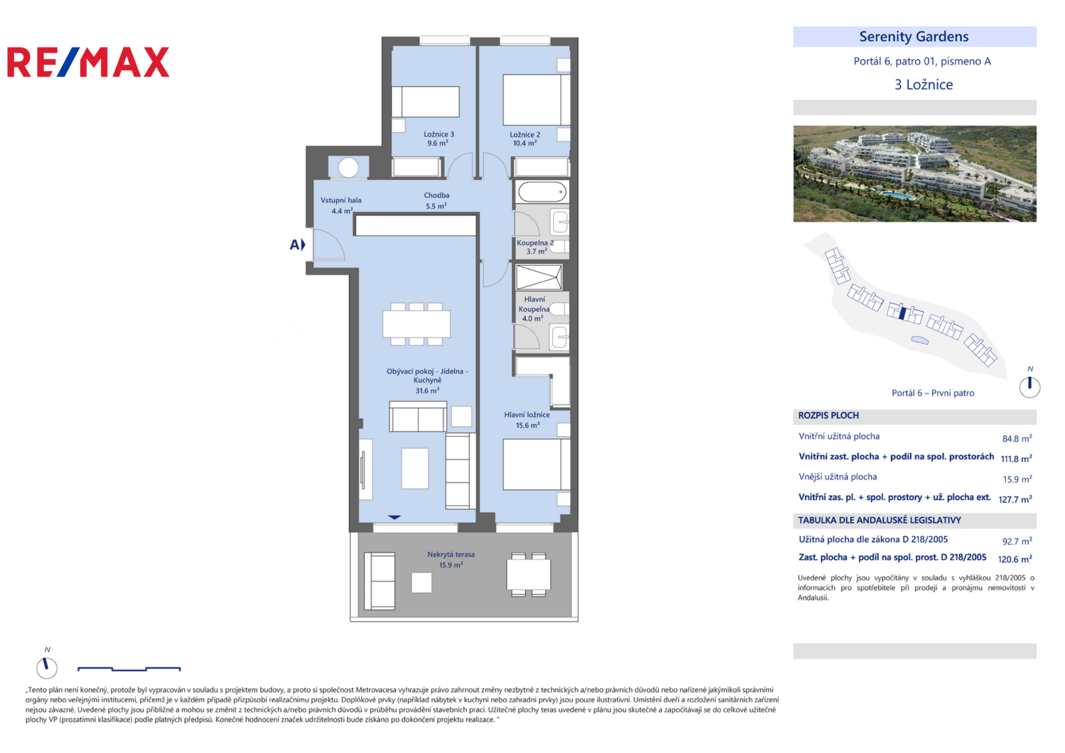 ✔ Apartmán: má rozlohu 84,8 m2 a přísluší k němu nekrytá terasa o velikosti 15,9 m2