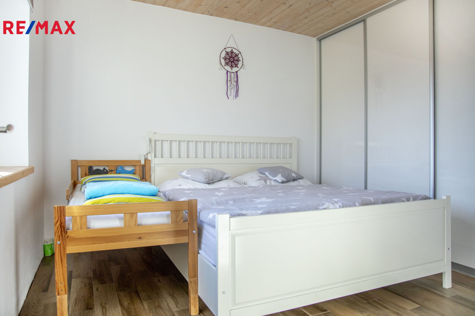 Výstup na terasu o výměře 35m2 je možný z dětského nebo z obývacího pokoje.
