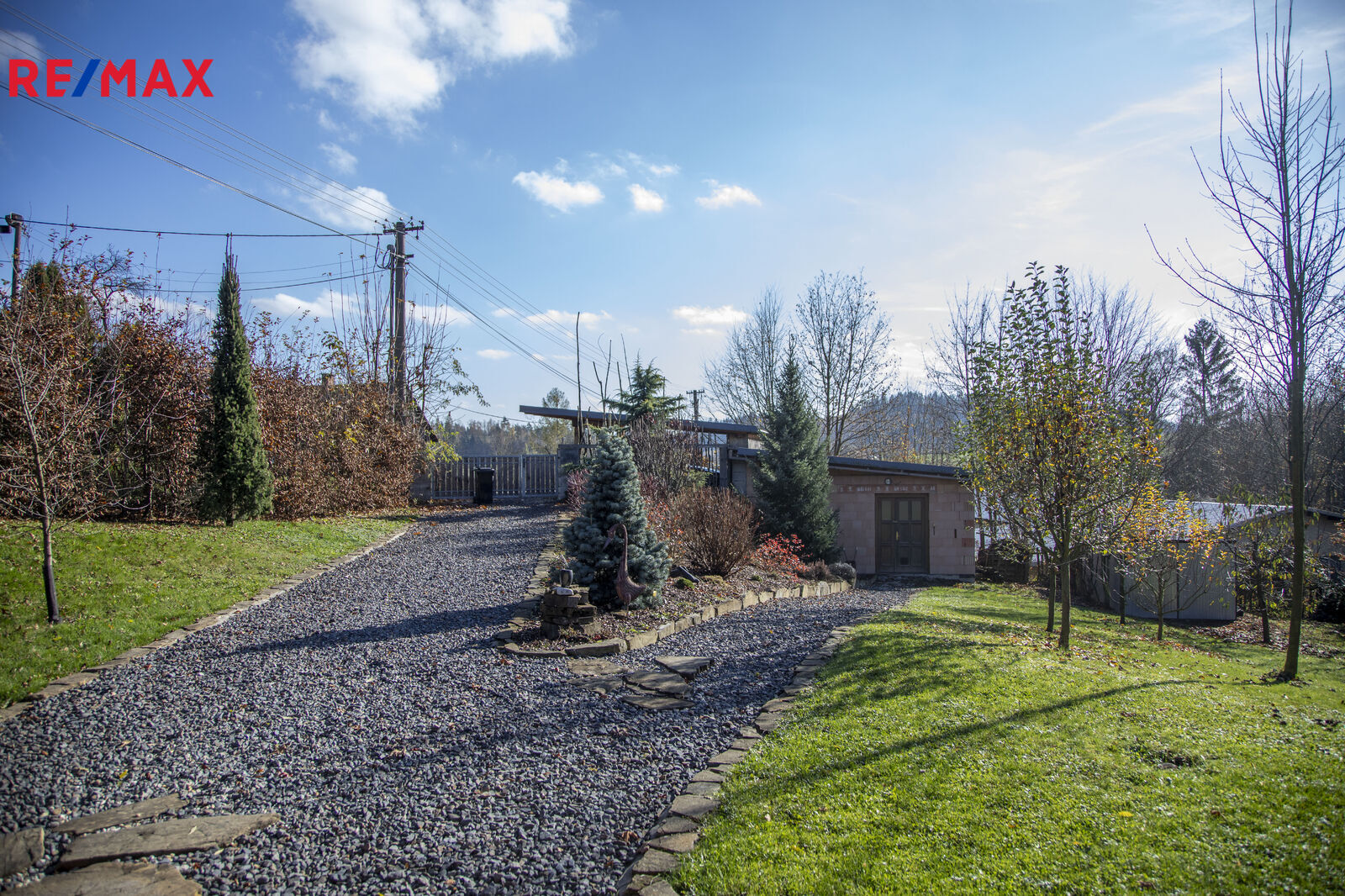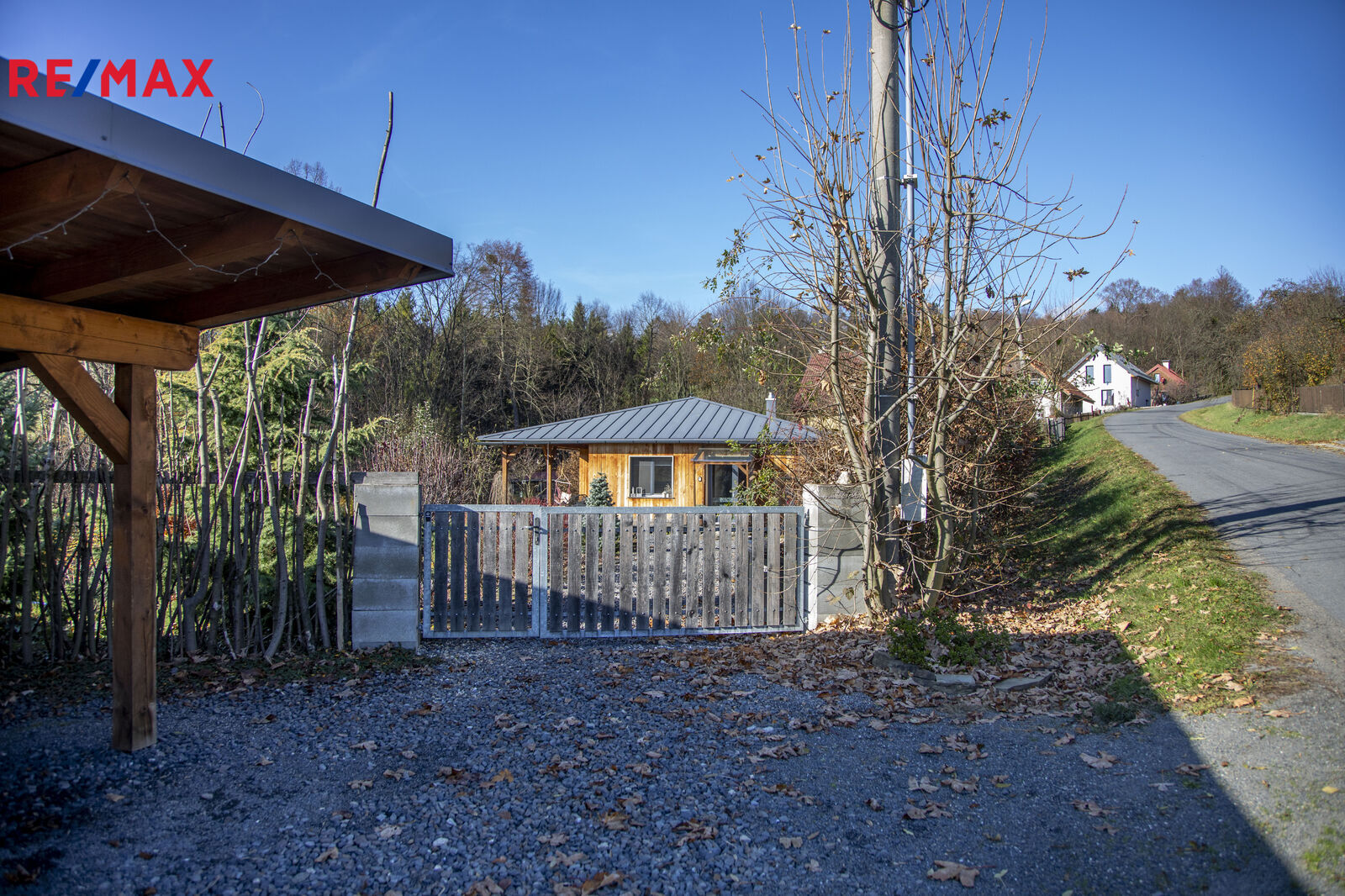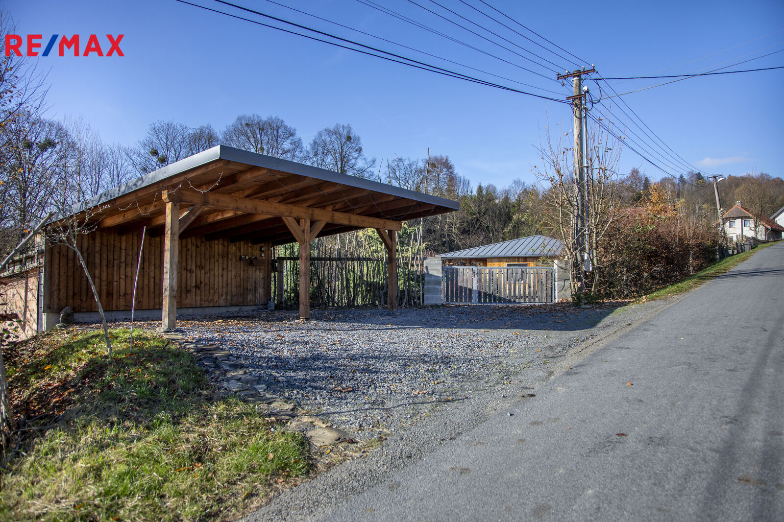 Příjezd k domu je po obecní komunikaci a kryté parkovací stání pro dvě auta na vlastním pozemku.