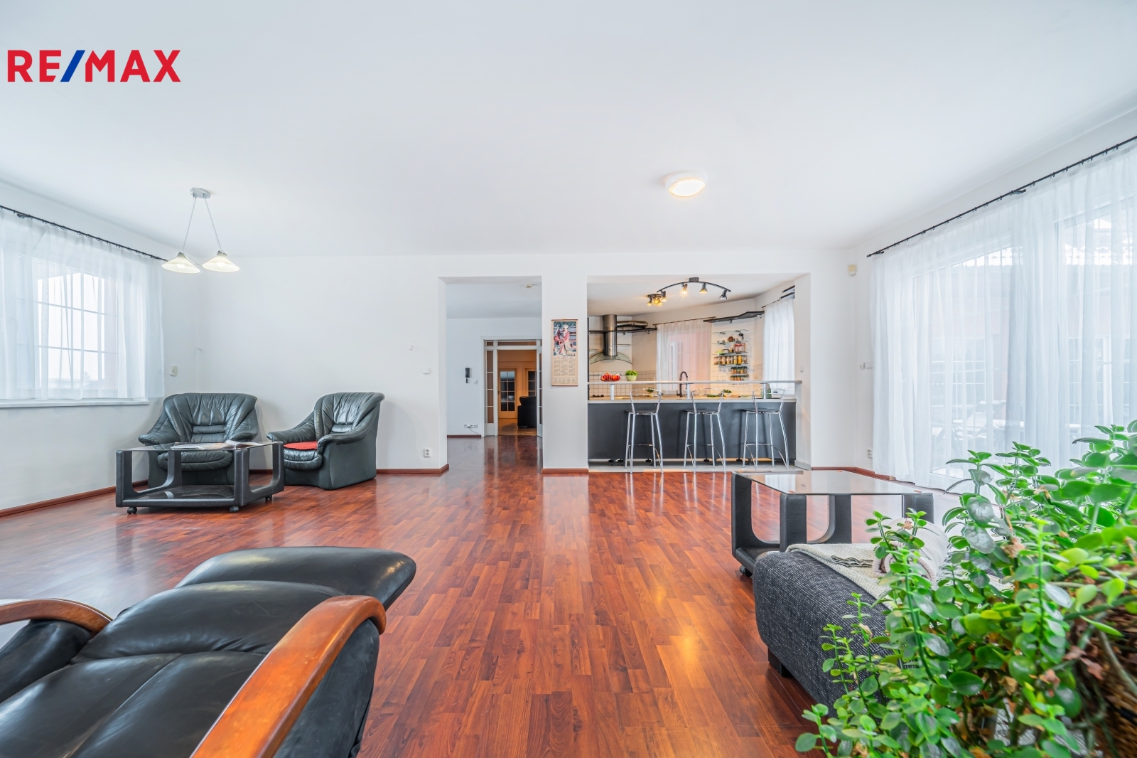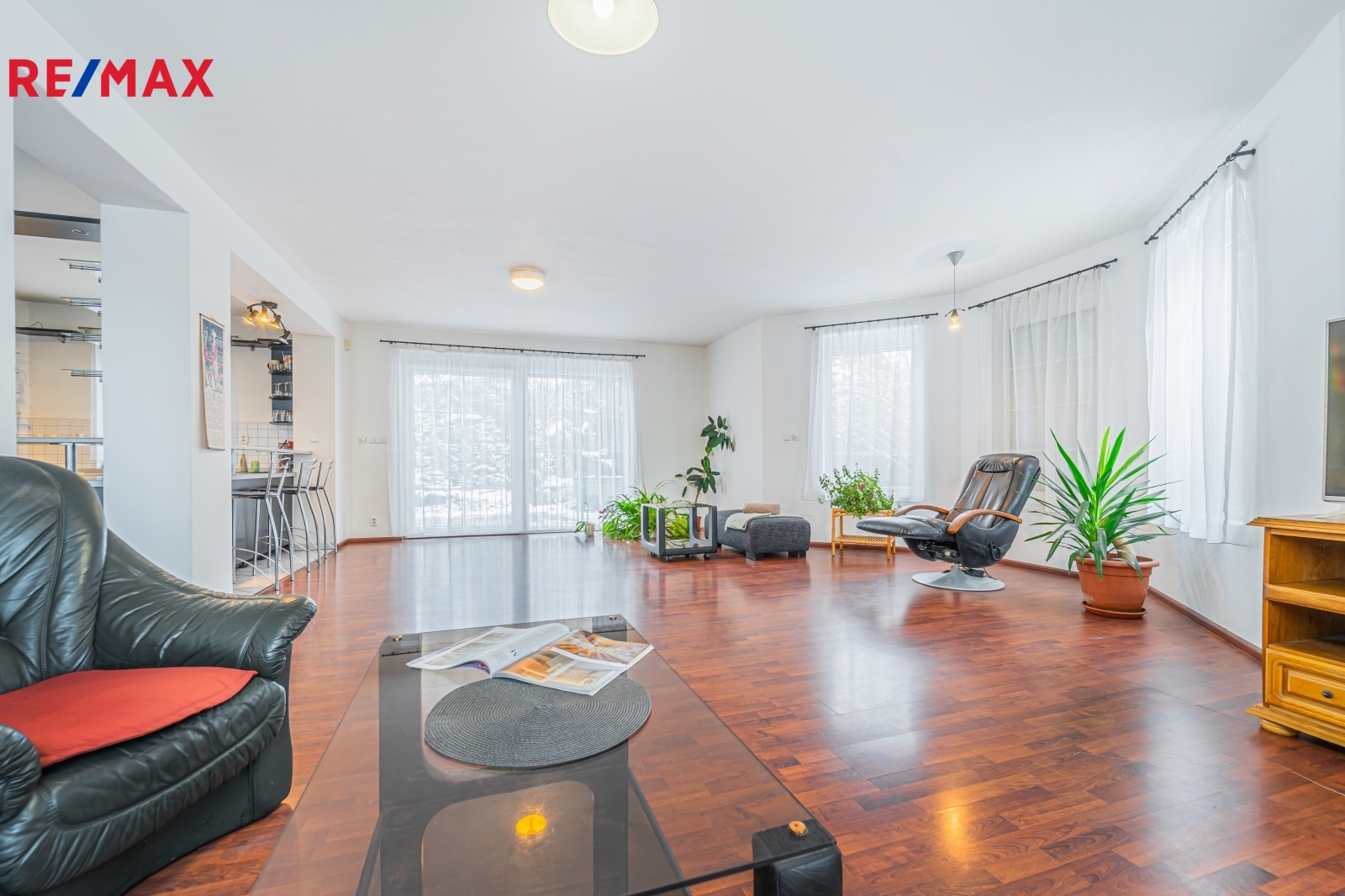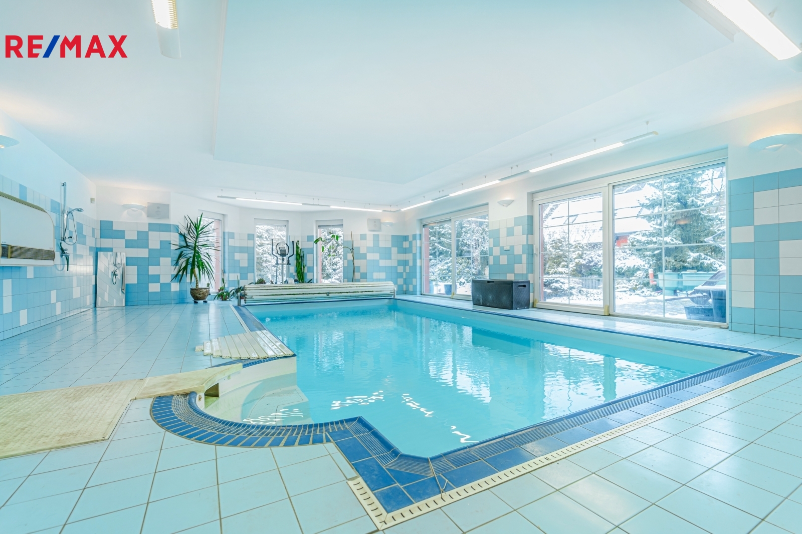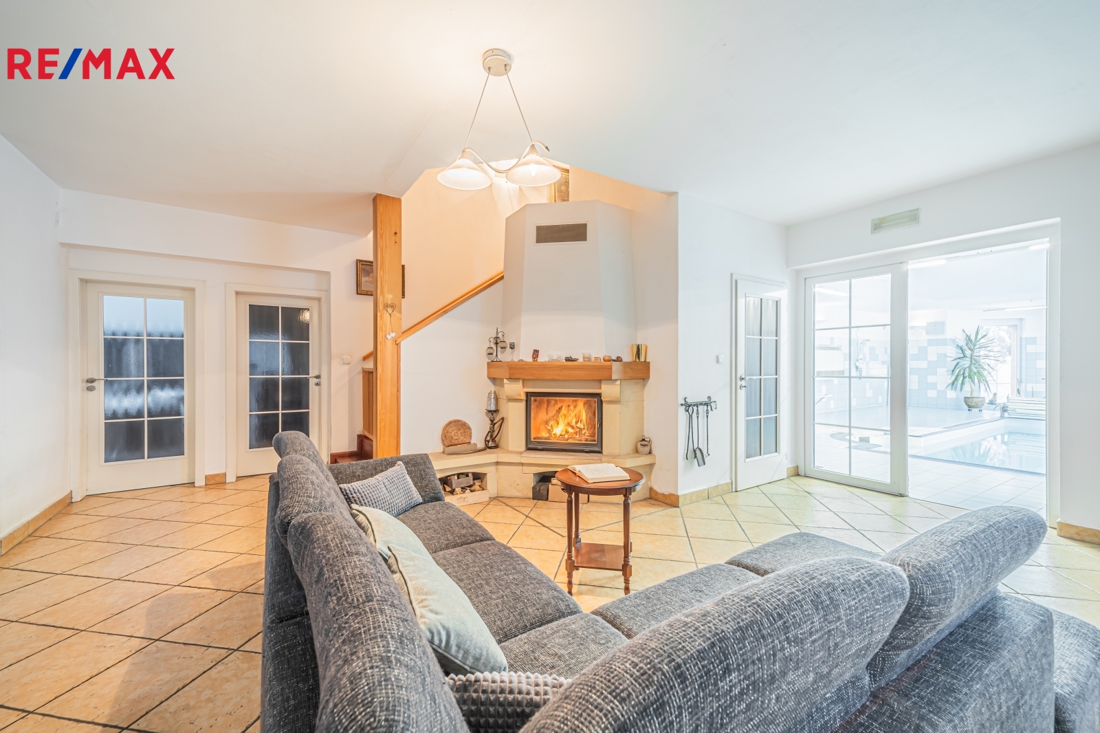 Nabízíme Vám ke koupi podsklepený rodinný dům 6+2 (774 m2) s vnitřním bazénem, garážemi až pro 6 automobilů a zahradou s okrasným jezírkem na velmi klidném místě v blízkosti lesa v obci Žilina (u Kladna).
