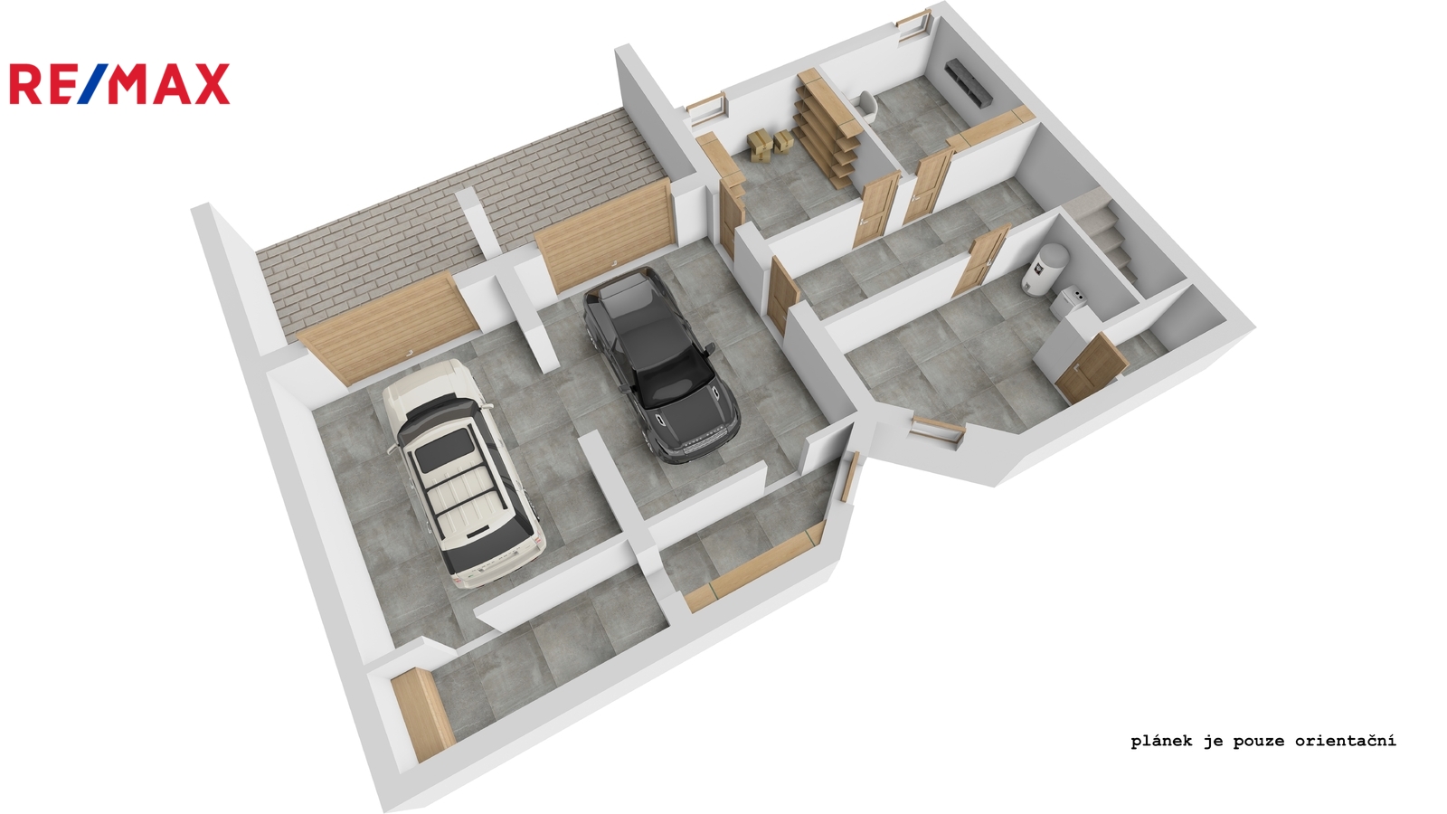 Sklepní prostory tvoří kotelna, úložné prostory a garáže pro dva až tři automobily. Na hranici pozemku je umístěna další samostatně stojící garáž pro další tři automobily.