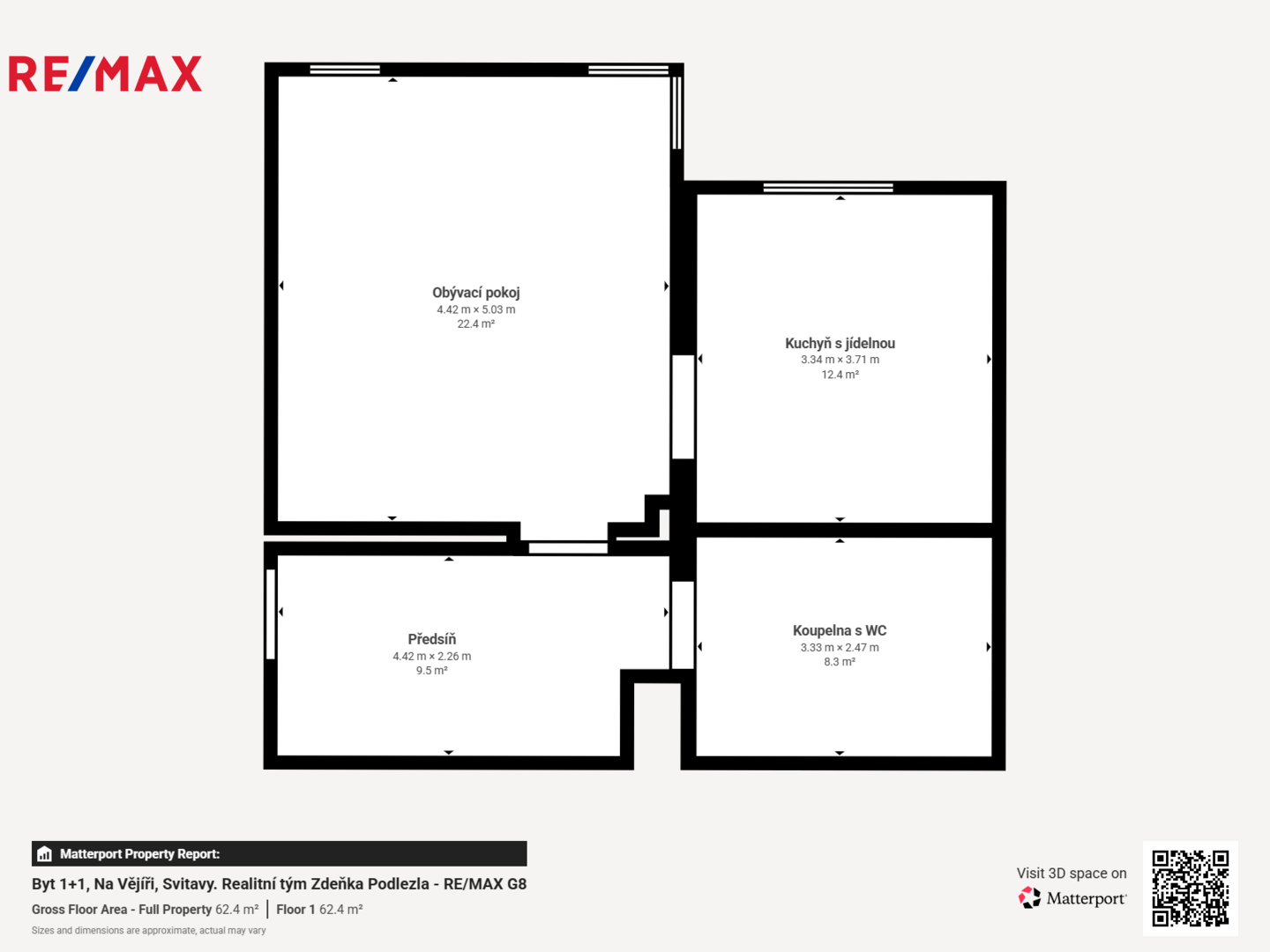 Plocha bytu je 59 m2 včetně zděného sklepa 3,8 m2, který je umístěn ve snížením přízemí. Byt je bezbariérový. Je umístěn v přízemí domu s přístupem bez nutnosti překonat výškovou překážku, má širší vstupní i interiérové dveře, prostorné zádveří a velkou koupelnu. Orientace bytu je na východ.
