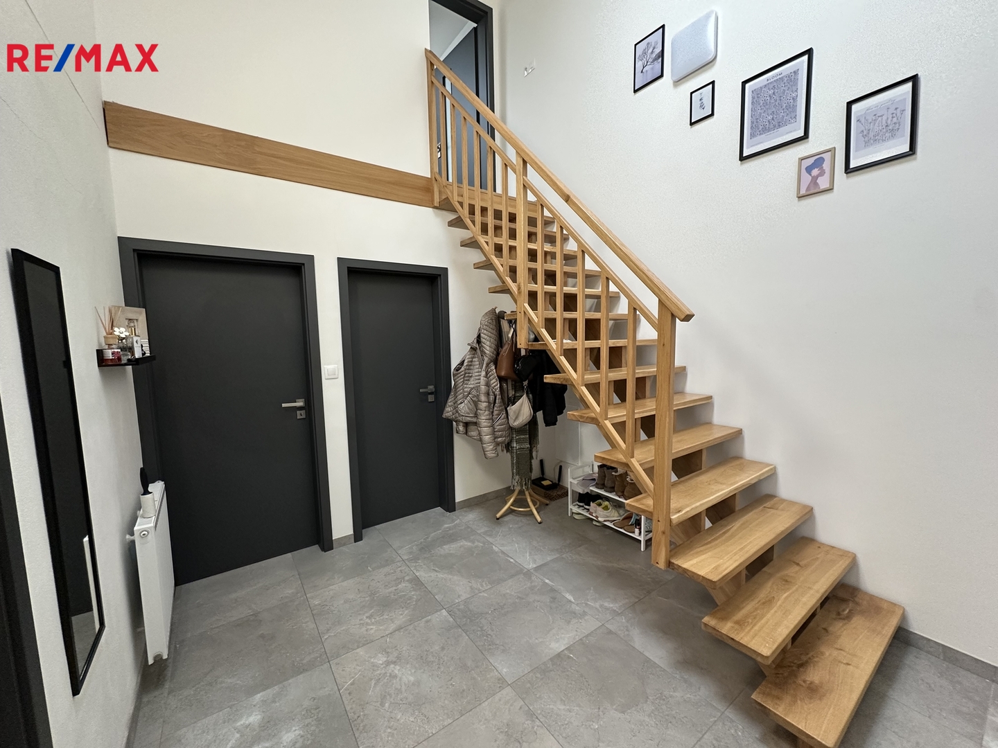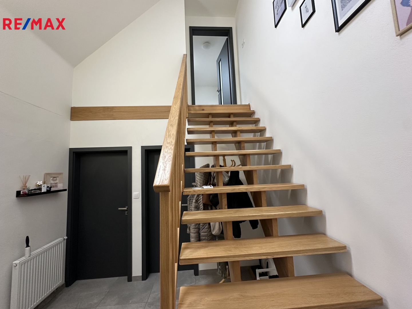 Do mezonetu s ložnicí vyjdeme po pohodlném dřevěném schodišti.