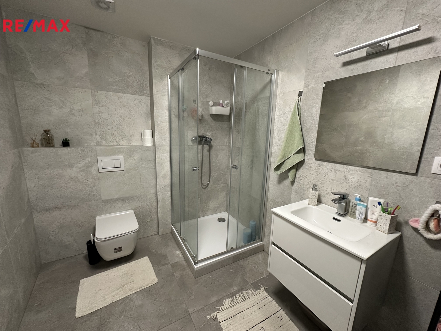 Do bytu vstoupíme přes prostornou předsíň, ze které jsou samostatné vstupy : do koupelny se sprchovým koutem, umývadlem se skříňkou a zrcadlem, toaletou, do šatny, ve které je umístěn plynový kotel a do obývacího prostoru s kuchyňskou linkou, která je vybavena sklokeramickou deskou, elektrickou troubou, lednici s mrazničkou a digestoří.