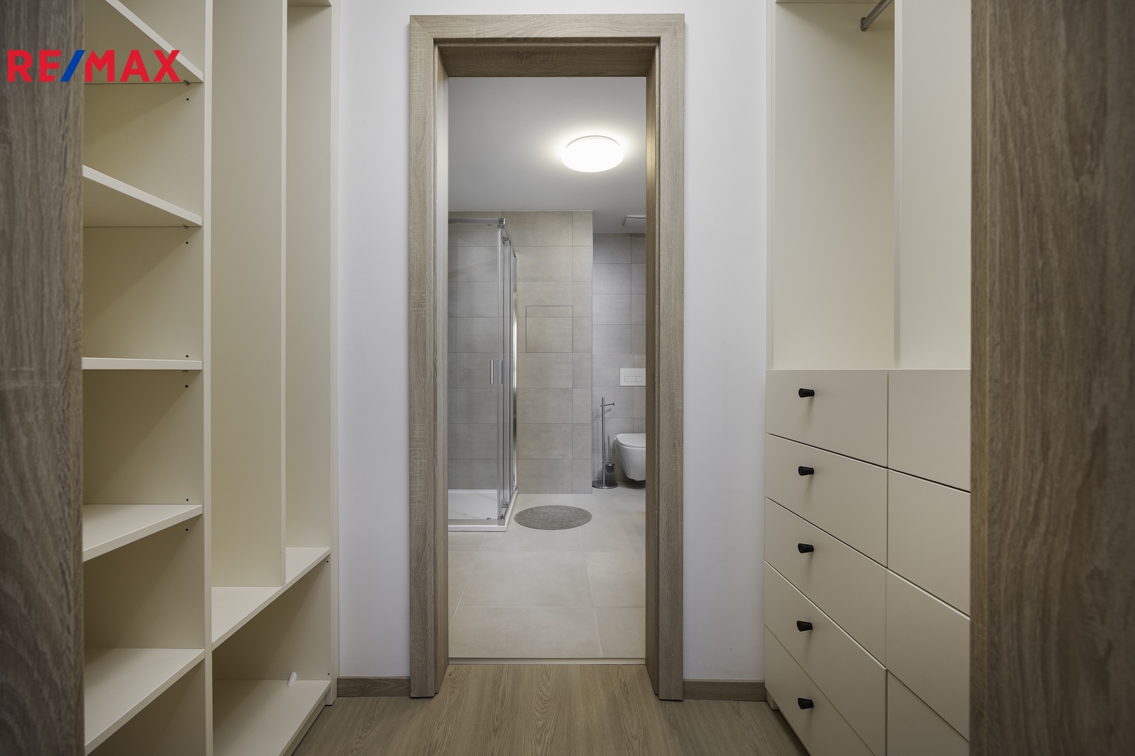Dispozice bytu nabízí obývací pokoj s kuchyňským koutem, ložnici se vstupem do koupelny s toaletou, šatnu + druhou toaletu s přístupem ze vstupní chodby bytu.