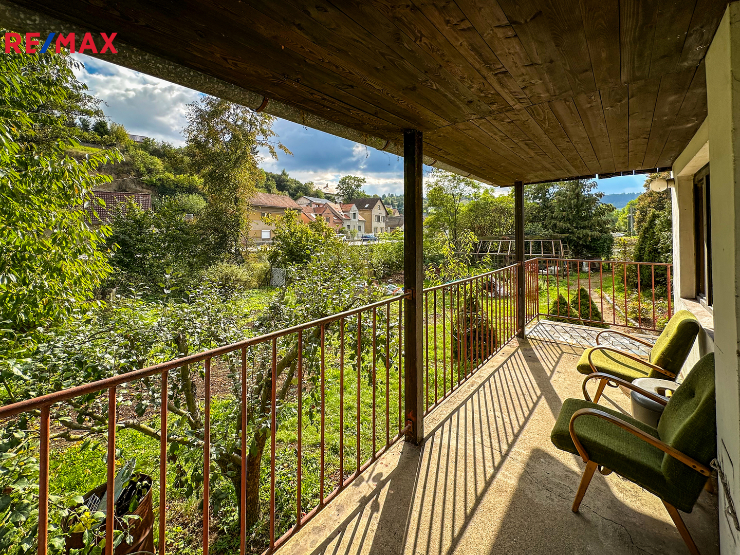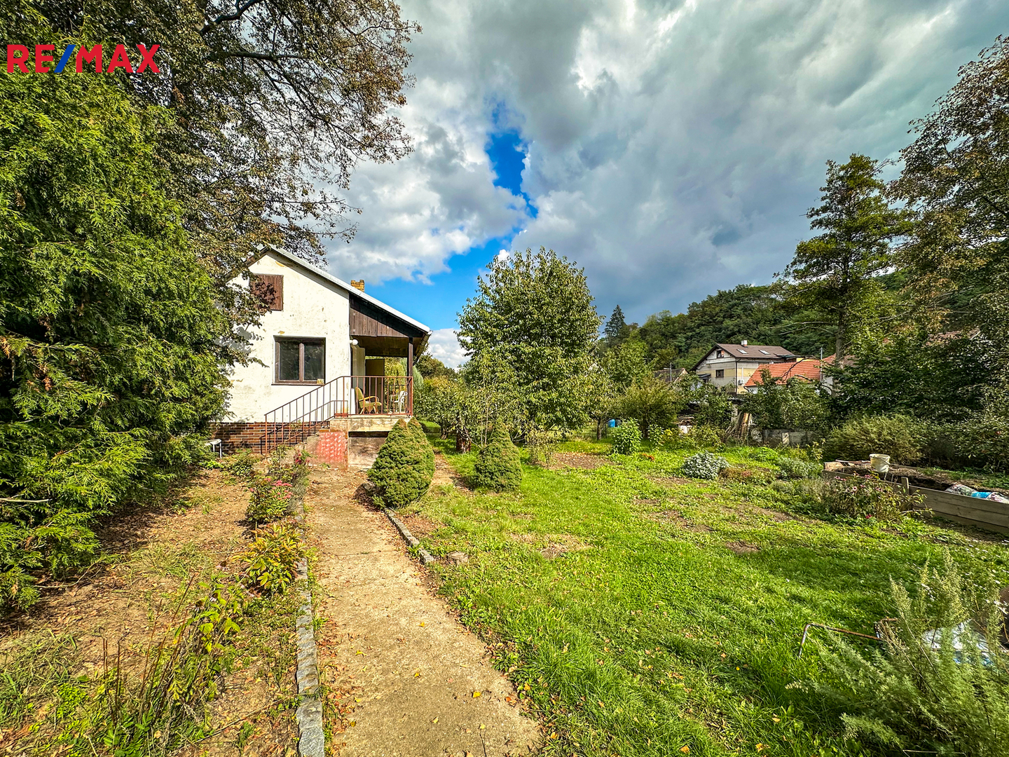 Na udržované zahradě jsou vzrostlé ovocné stromy a keře.