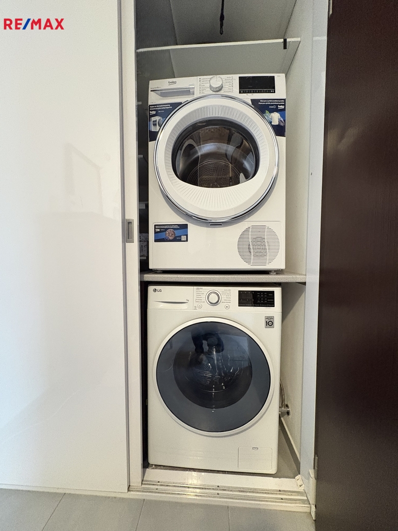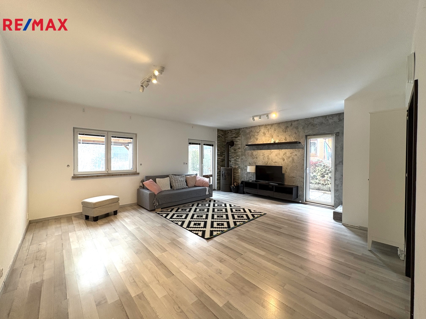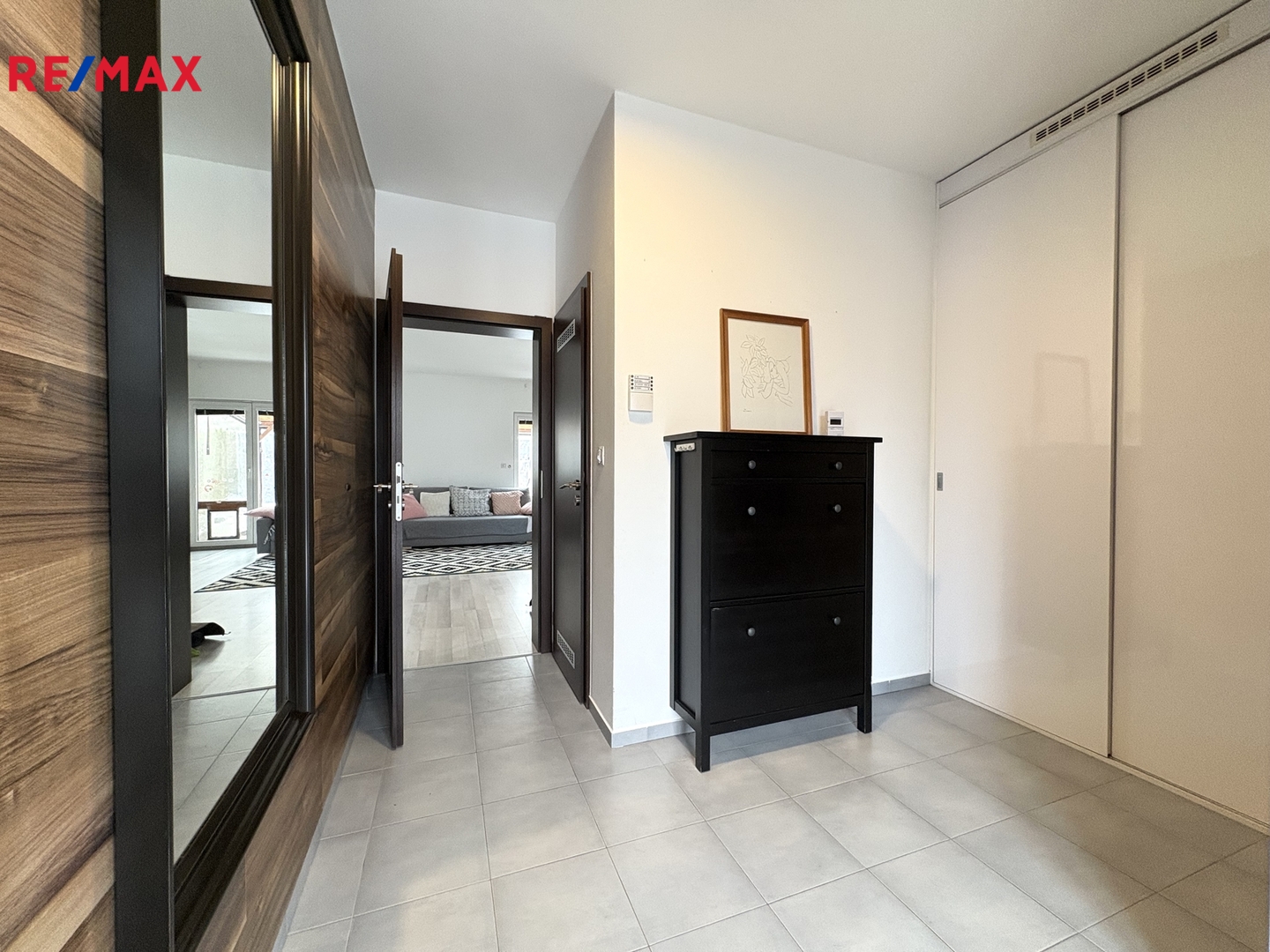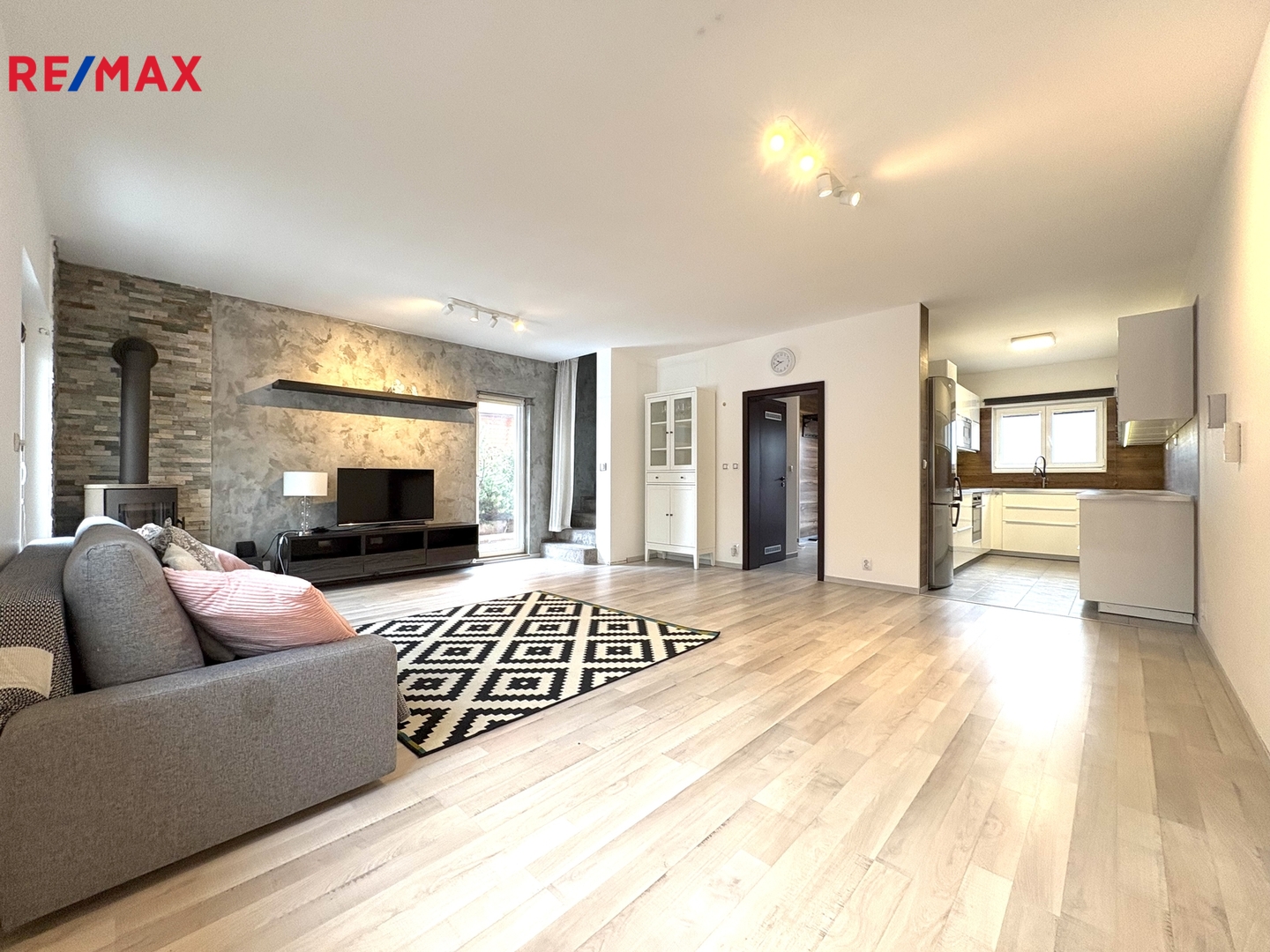 V přízemí se nachází prostorná předsíň s vestavěnou skříní, ve které je umístěný plynový kotel s boilerem, pračka a sušička, dále velký obývací pokoj s kuchyňským koutem (moderní designová kuchyňská linka s vestavěnými spotřebiči – indukční varná deska, elektrická trouba, mikrovlnná trouba, myčka nádobí, lednice s mrazákem, digestoř) a vstupem na terasu s uzavíratelnou pergolou a zahradu, toaleta s umyvadlem a komora.