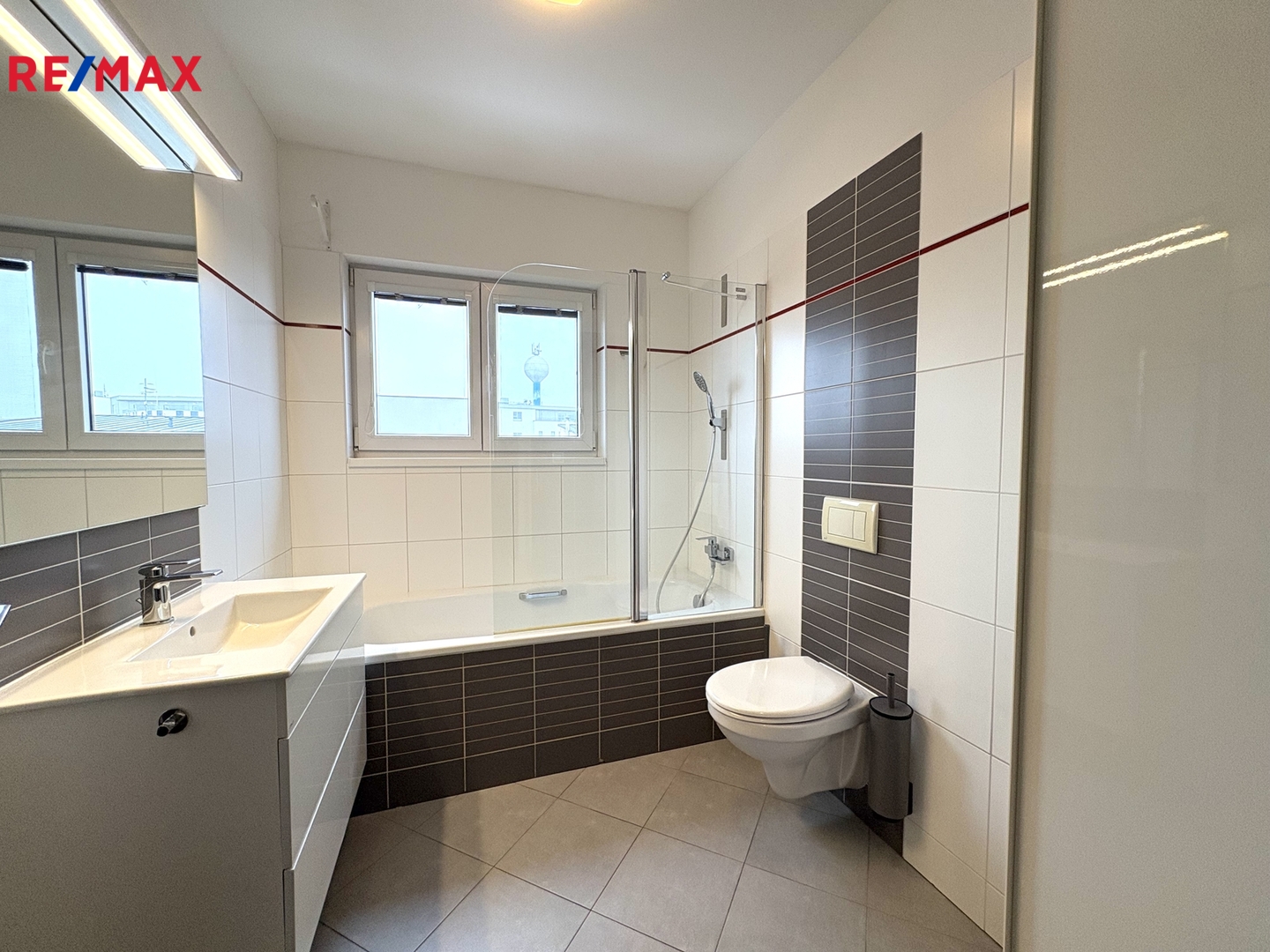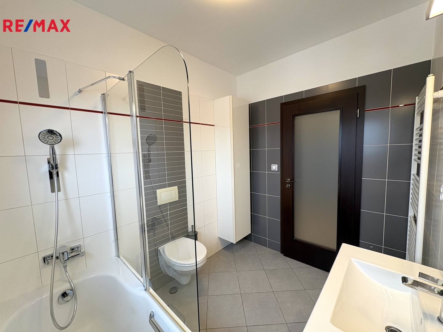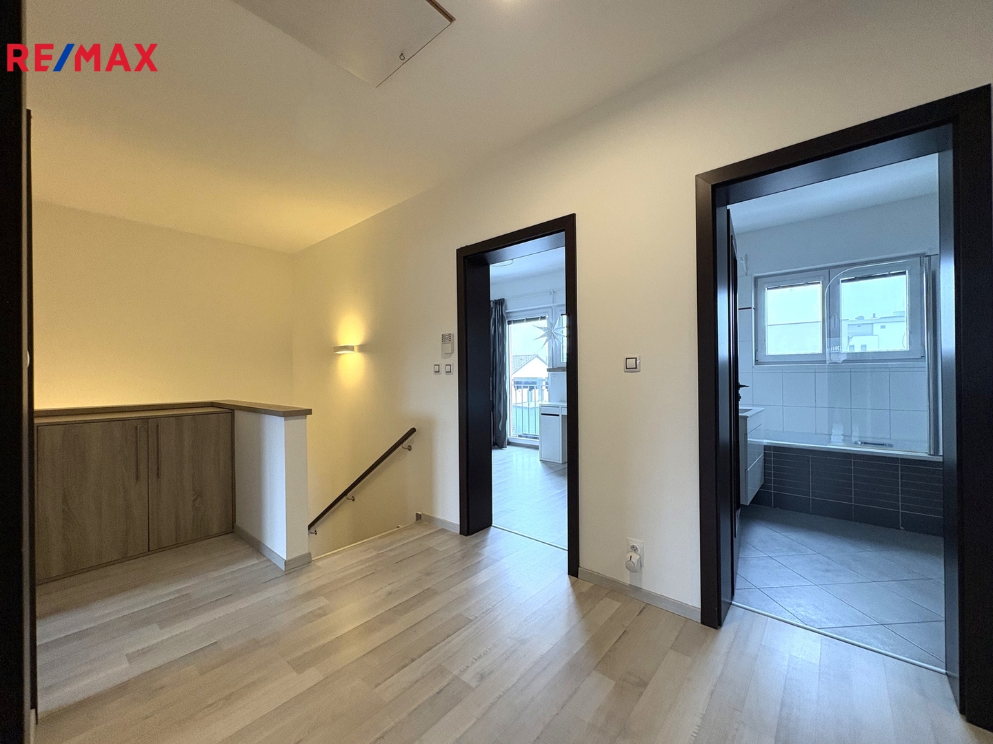V 1. patře se nachází 3 samostatné pokoje, centrální chodba s vestavěnou skříní a velká koupelna s vanou, umyvadlem a toaletou.