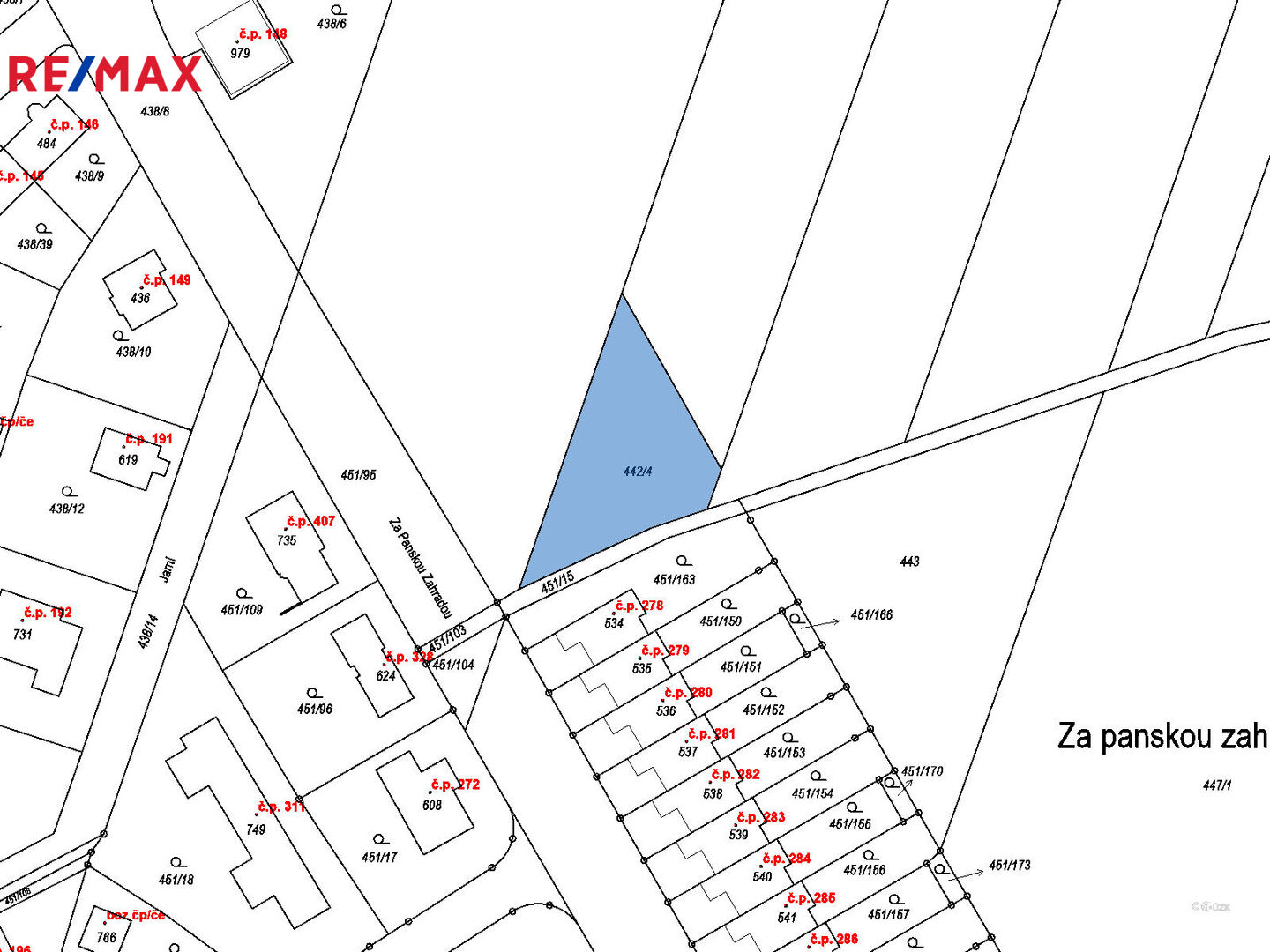 Pozemek má trojúhelníkový tvar, přičemž nejdelší strana měří 52 metrů. Leží v blízkosti zástavby řadových domů, což zajišťuje příjemné sousedství a zároveň dostatek prostoru pro soukromí. Inženýrské sítě jsou pod komunikací přímo u pozemku.