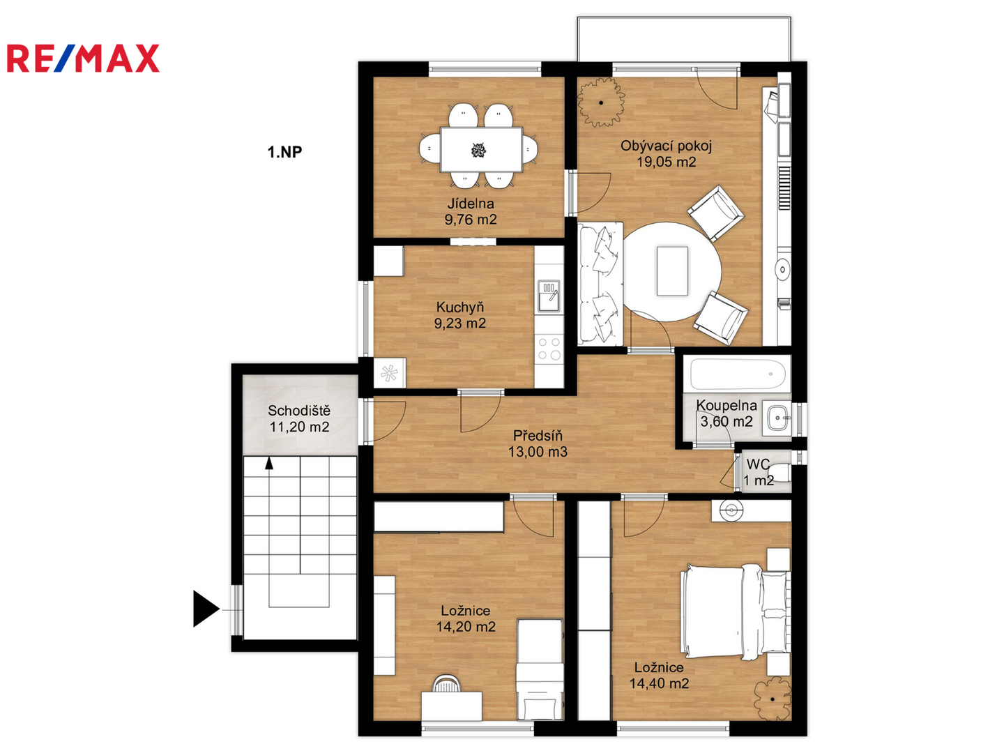 I. NP. s podlahovou plochou 84 m2 – předsíň, koupelna s vanou, samostatné WC, spíž, kuchyň se vstupem do jídelny, prostorný obývací pokoj, ložnice, pokoj.