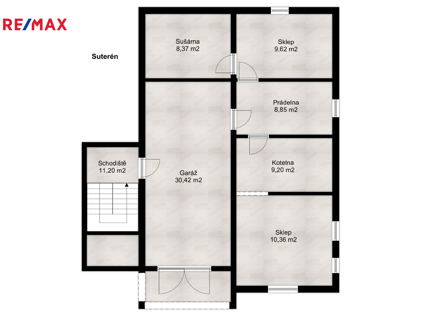 Suterén - s podlahovou plochou 88 m2 - garáž, kotelna, prádelna, sušárna, sklepy a schodiště.