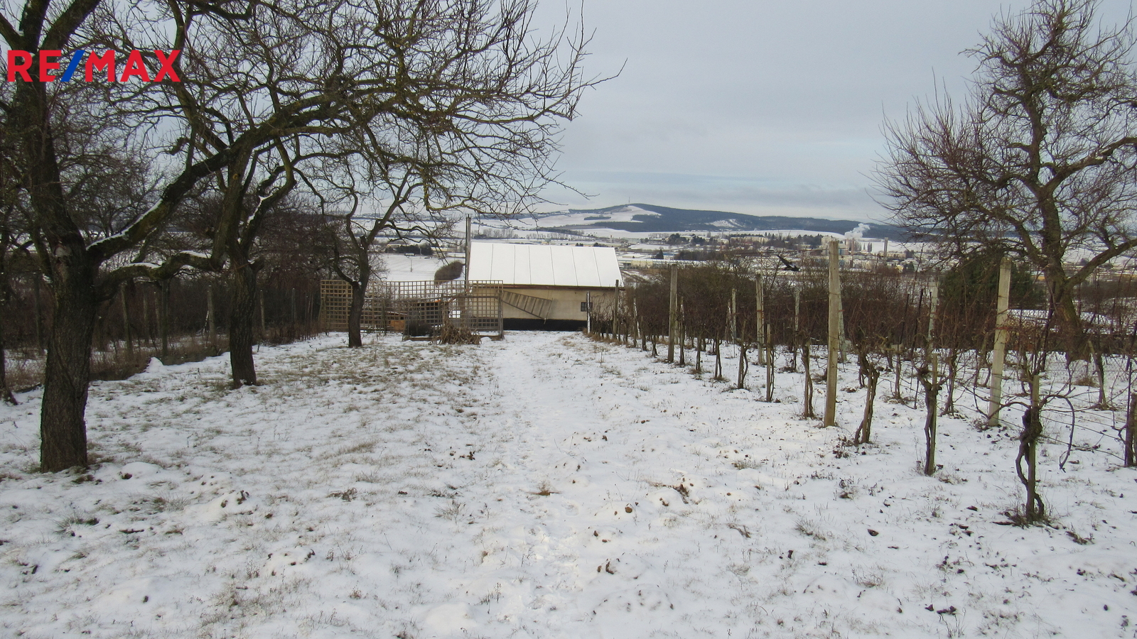 V horní části pozemku s krásným výhledem na Kyjov a okolí je postavena zděná chatka (6 m x 4 m).
