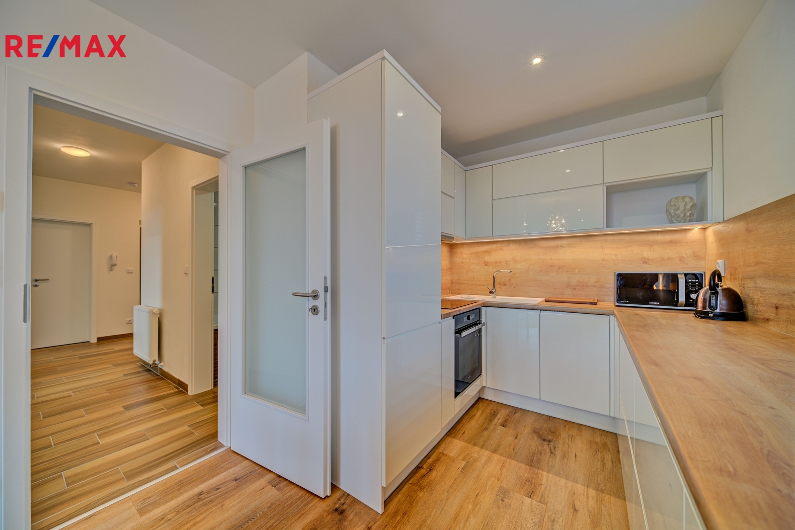 Dominantou bytu je světlý obývací pokoj s kuchyňským koutem o velikosti 21,48 m², kde je pro maximální tepelný komfort instalována termoizolace v podhledech, která přispívá k příjemnému klimatu po celý rok. Kuchyň je vybavena kvalitní kuchyňskou linkou s vestavěnými spotřebiči a drtičkou bioodpadu, což podtrhuje praktický a moderní charakter bydlení.
