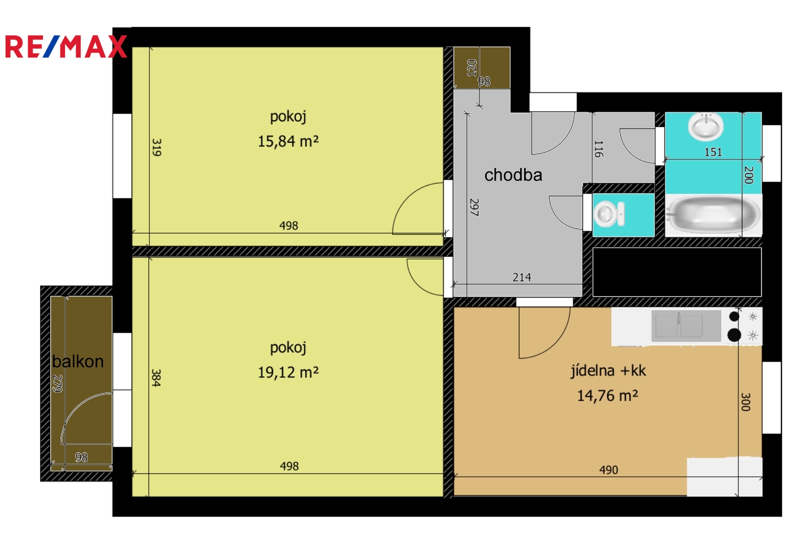 Dispozice bytu nabízí dva prostorné pokoje o velikosti 19,12 m² a 15,84 m², jídelnu s kuchyňským koutem o výměře 14,76 m², koupelnu se sprchovým koutem, samostatné WC a komoru. Součástí bytu je rovněž sklep v suterénu domu.