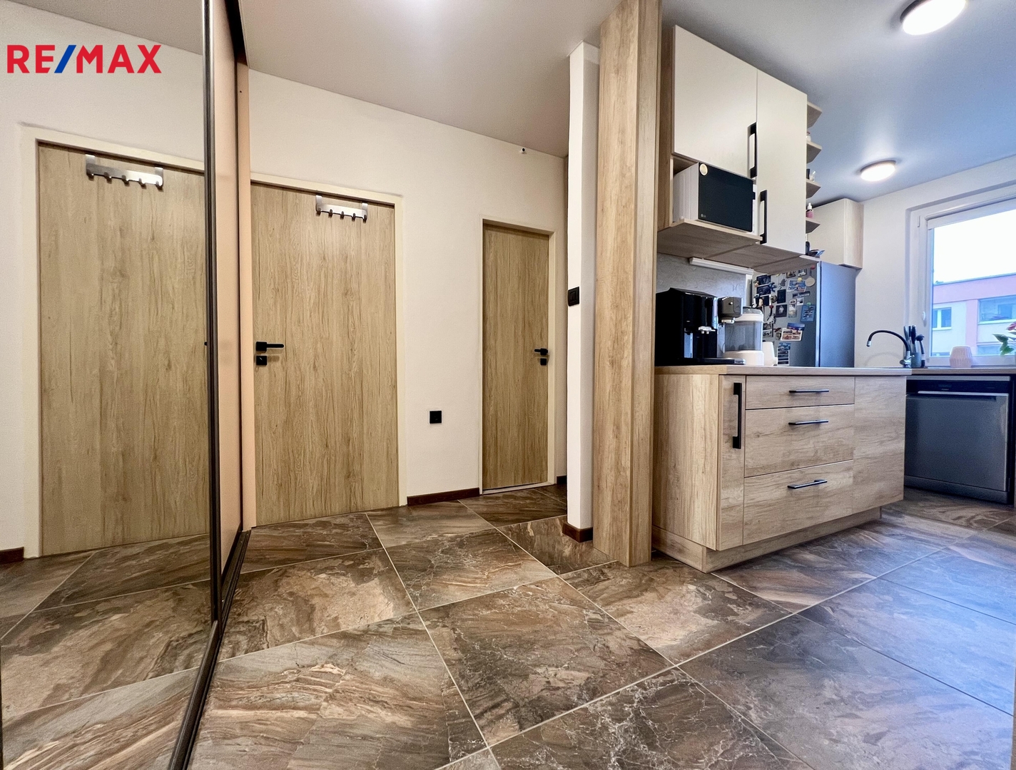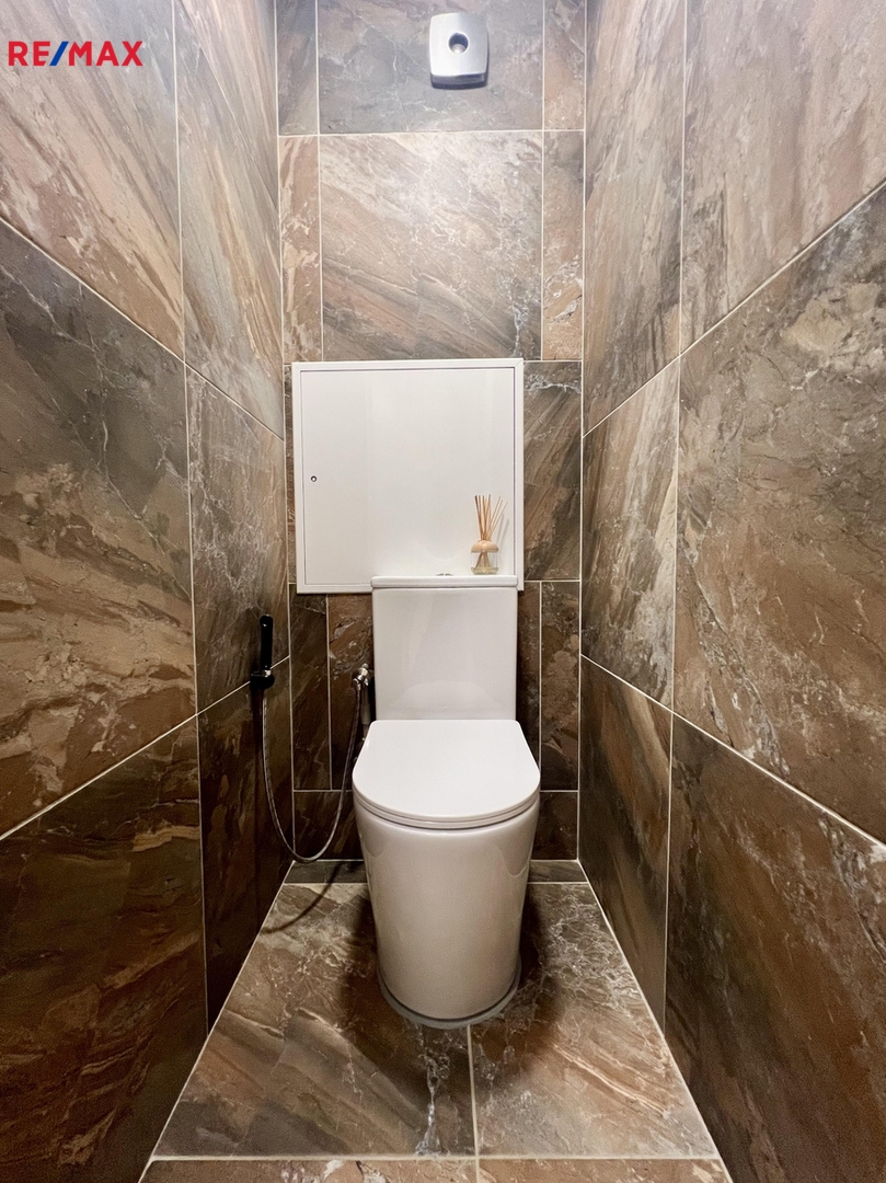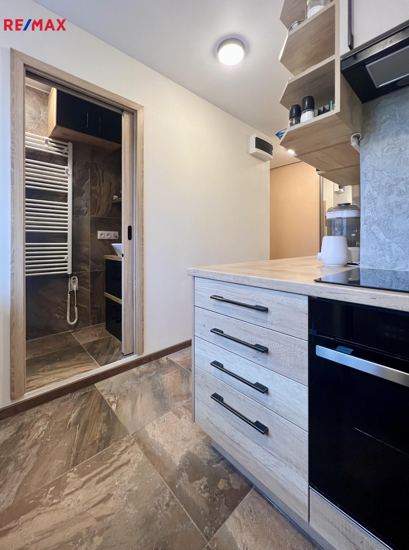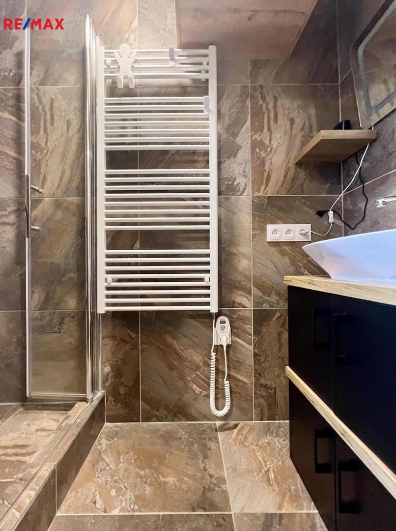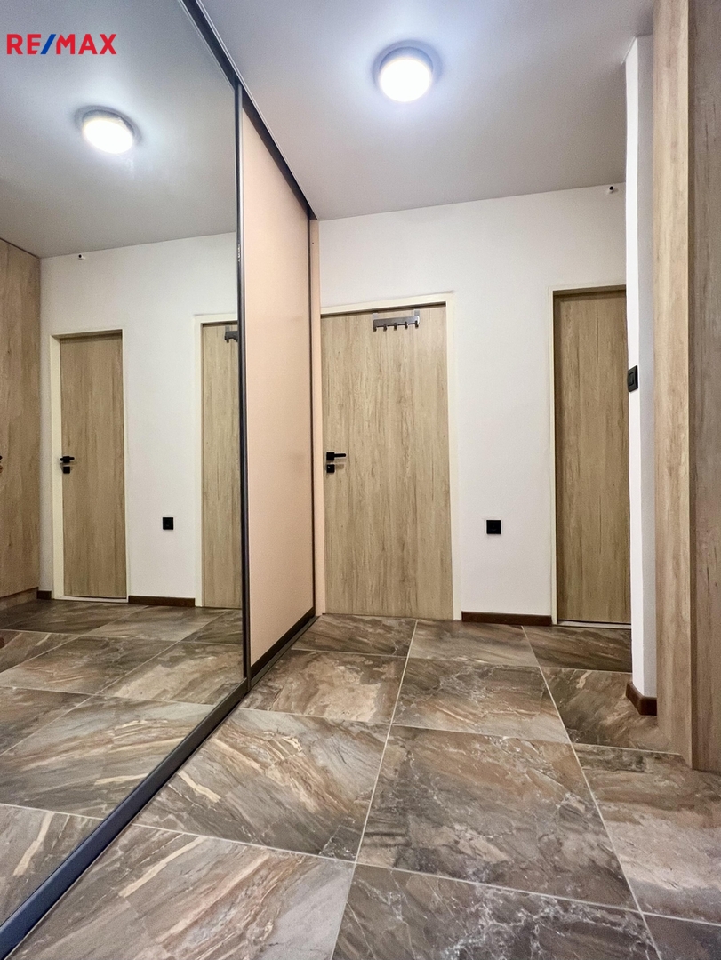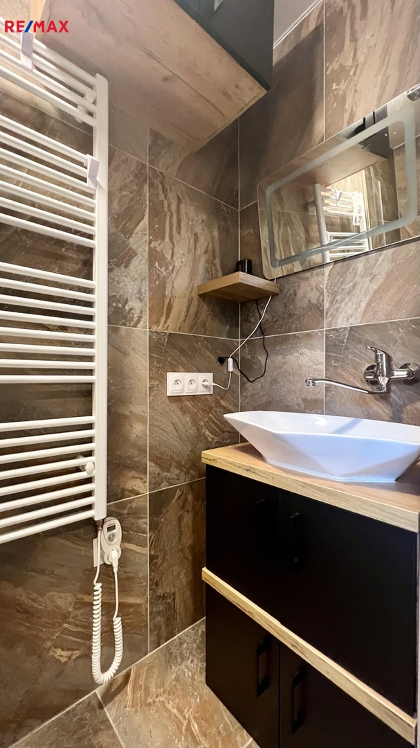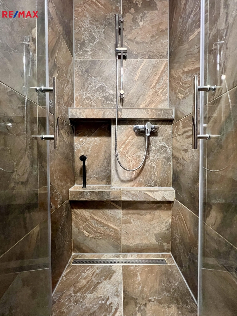 Celý byt prošel, v nedávné době kompletní zdařilou rekonstrukcí - nová elektroinstalace, voda + odpady, nová krásná koupelna s prostorným sprchovým koutem, samostatné WC, nové kompletní podlahy (renovované parkety, dlažba), nová kuchyňská linka s elektrospotřebiči, velká vestavná zrcadlová skříň, nové speciální povrchy stěn, zašupovací kazetové dveře do koupelny, nové vstupní bezpečnostní (protipožární) dveře - barva na zakázku.