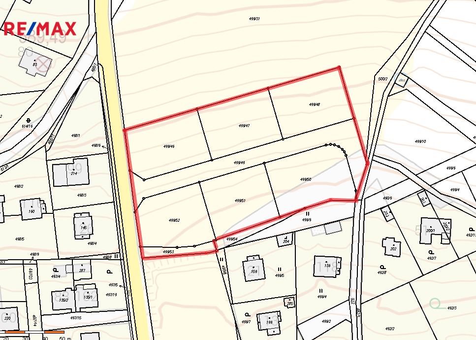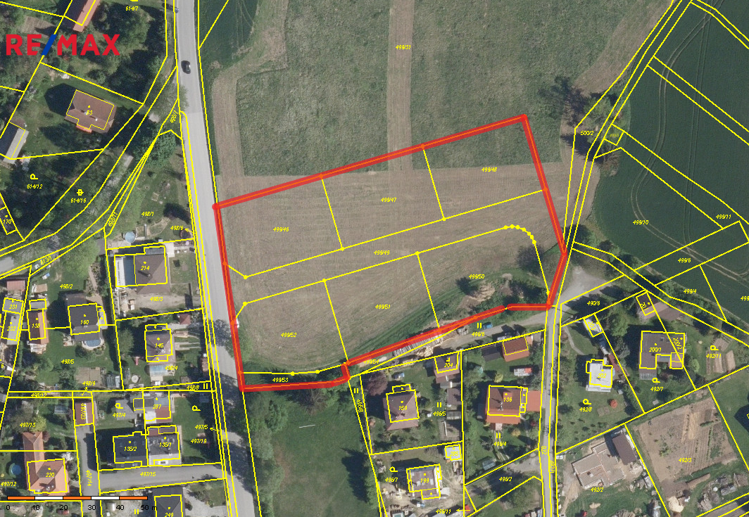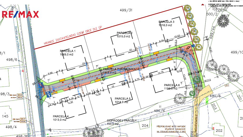 Pozemek vhodný pro menší developerské projekty (je nyní rozdělen na šest parcel, s výměrami mezi 1.082 m2 až 1.204 m2 a cestu mezi parcelami).