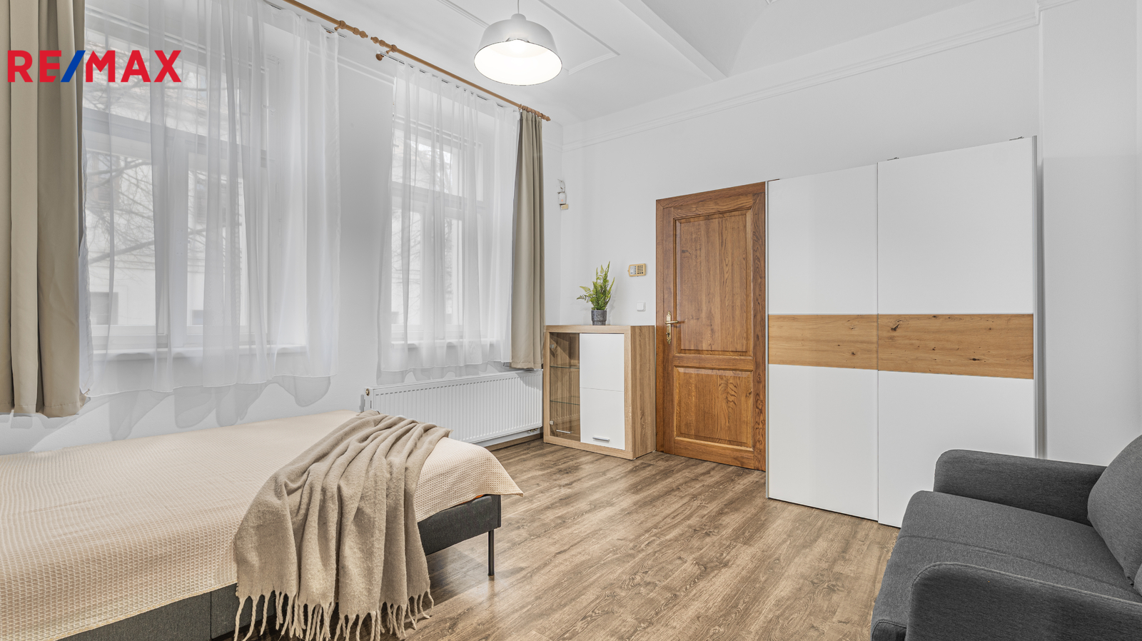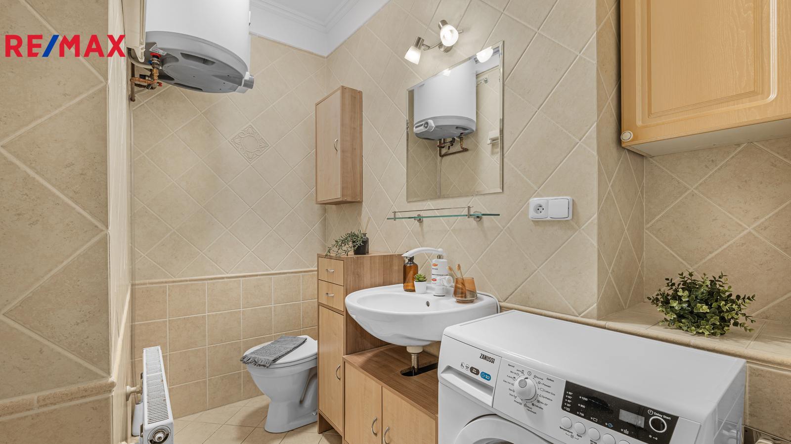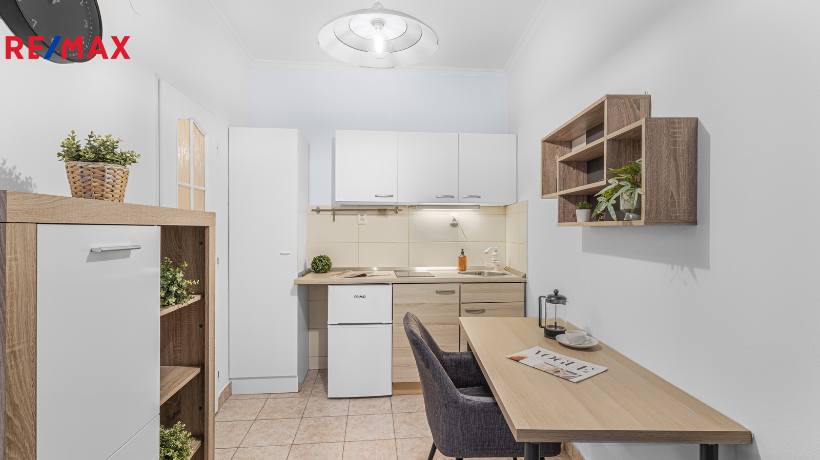 Byt je pronajímán zařízený. Veškeré vybavení, které vidíte na fotografiích, bude novému nájemci plně k dispozici. Kuchyňský kout je vybavený sklokeramickou varnou deskou a menší lednicí. V koupelně se nachází sprchový kout, toaleta a nechybí zde ani pračka.