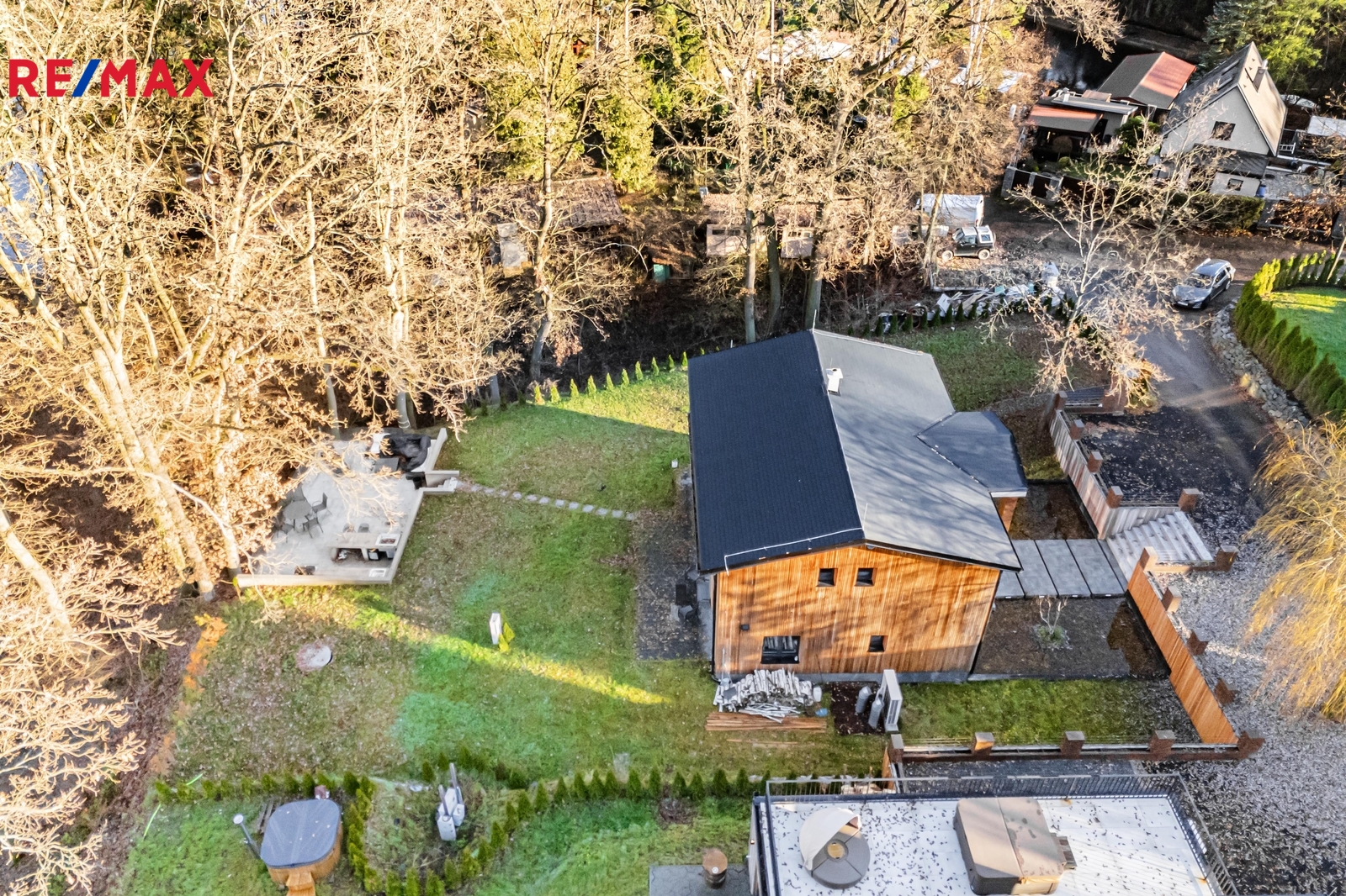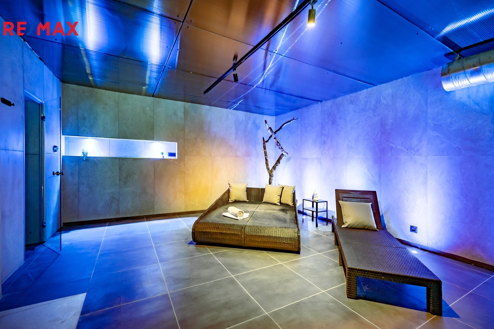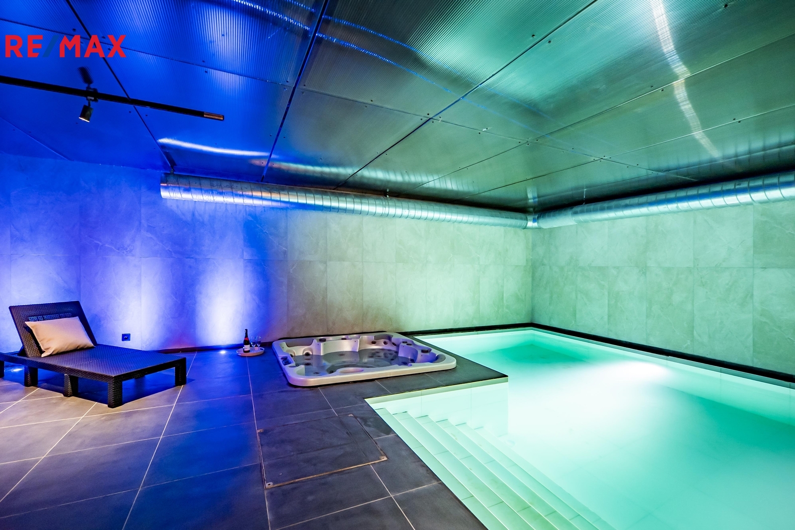 Velkým benefitem této nemovitosti je privátní wellness zóna, která zahrnuje saunu, vířivku a bazén o rozměrech 6 × 3 m s pískovou filtrací a automatickým dávkováním chemie ASEKO. Na venkovní terase navazuje kompletní venkovní kuchyně a zahradní krb, ideální pro letní posezení a společenské akce.