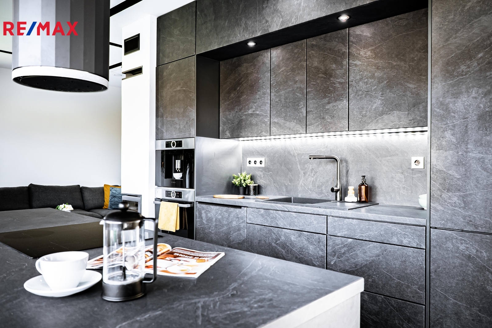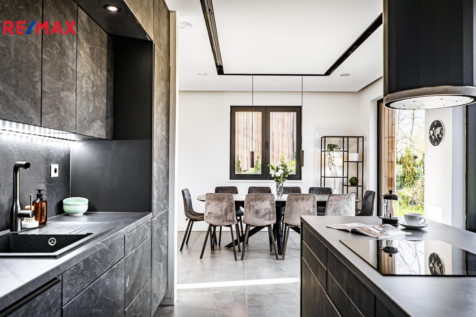 Kuchyně je plně vybavena moderní kuchyňskou linkou se spotřebiči značky Bosch, včetně indukční varné desky, vestavné trouby, vestavného kávovaru, myčky a digestoře. Otevřený koncept obytného prostoru vytváří ideální místo pro společné chvíle s rodinou a přáteli.