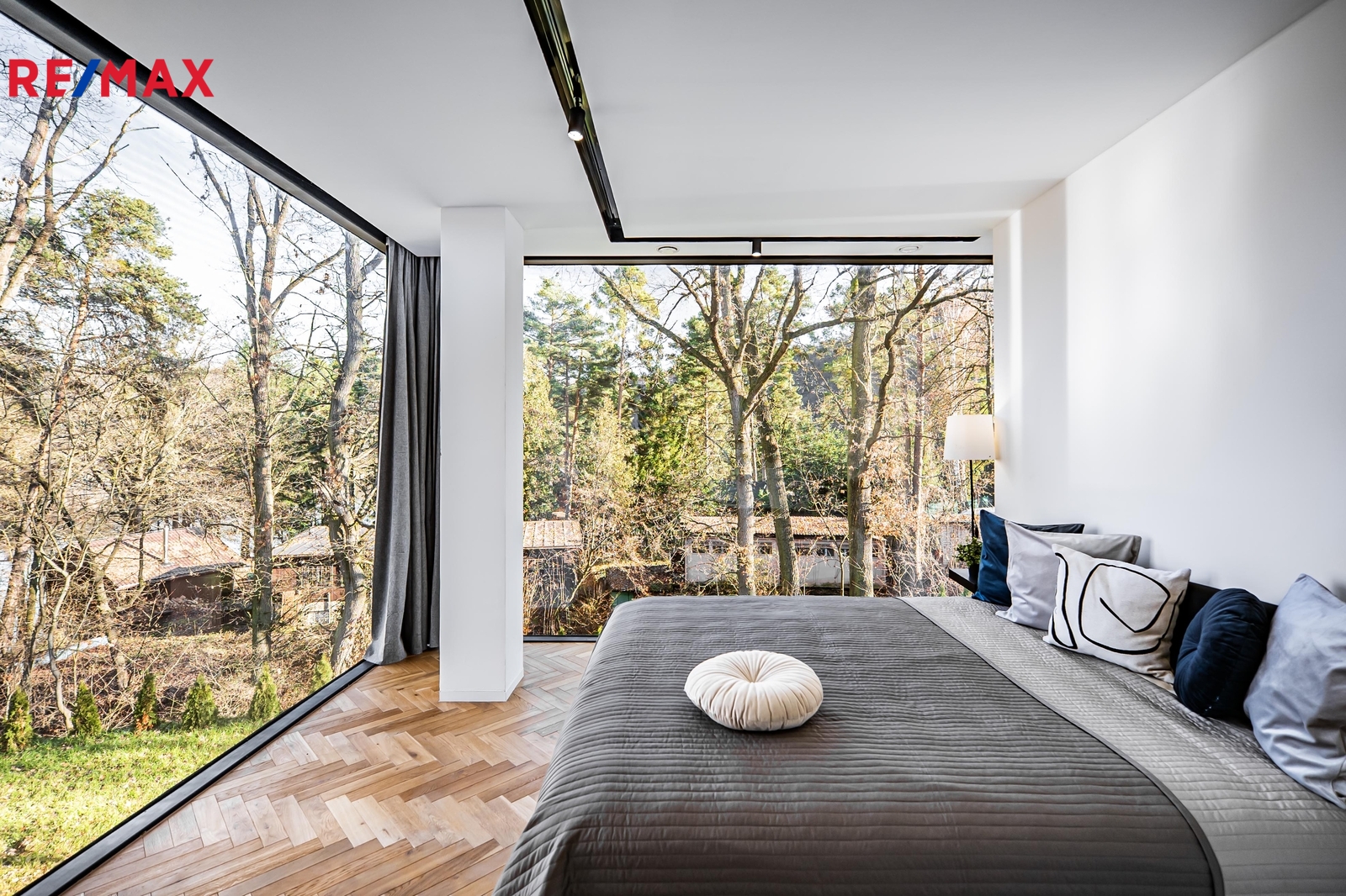 Interiér je navržen v moderním, nadčasovém stylu s důrazem na kvalitní materiály a detail. Podlahy obytných místností tvoří parkety v rybinovém vzoru, ostatní prostory jsou řešeny velkoformátovou dlažbou. Hliníková okna s trojskly zajišťují výborné tepelně-izolační vlastnosti i dostatek denního světla. Skryté zárubně a bezfalcové dveře podtrhují čistý architektonický výraz interiéru.