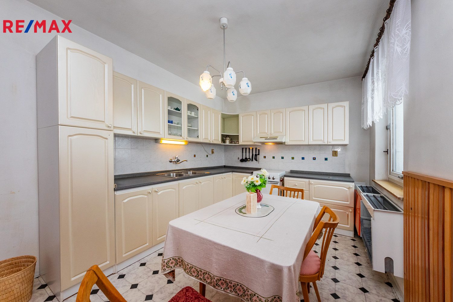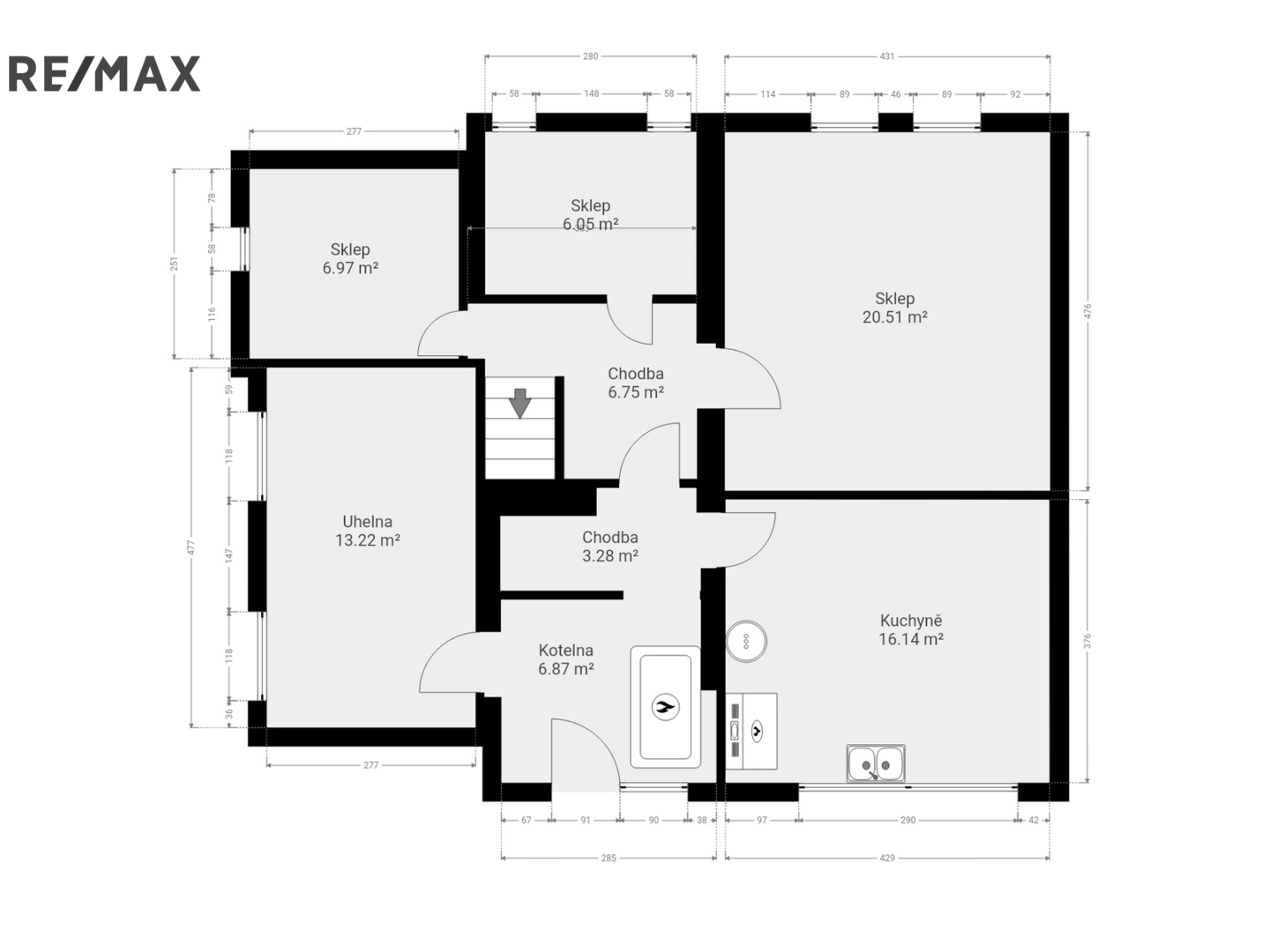 Suterén (80 m2): chodba a 6 místností – černá kuchyně, kotelna, sklad uhlí a další skladové prostory.