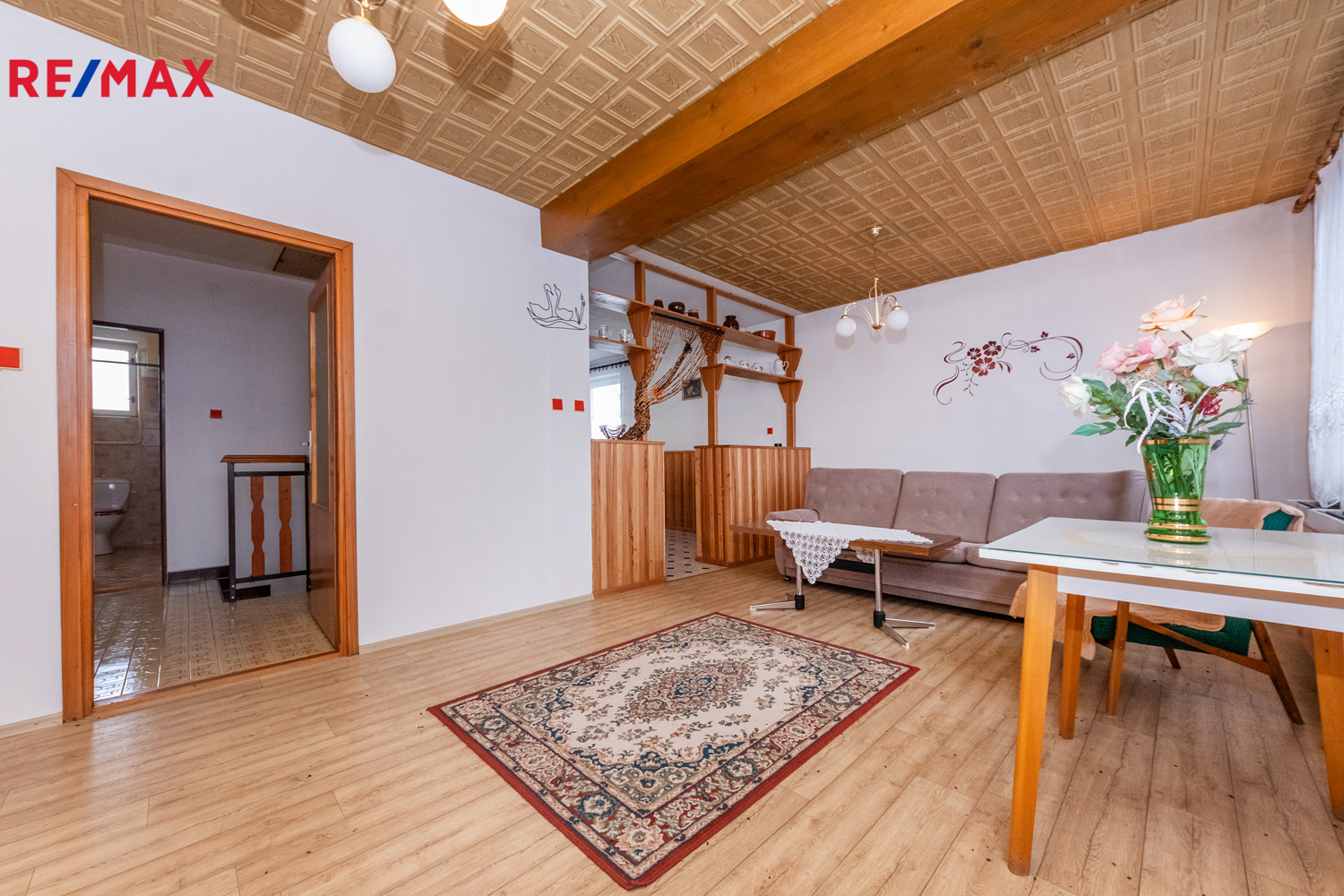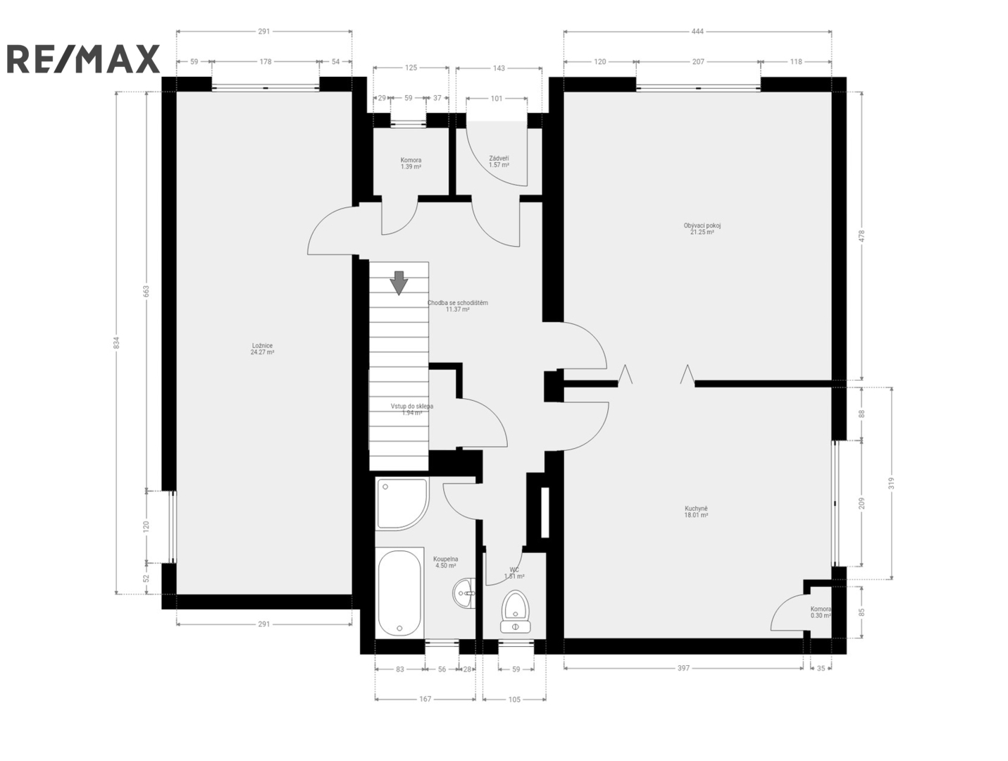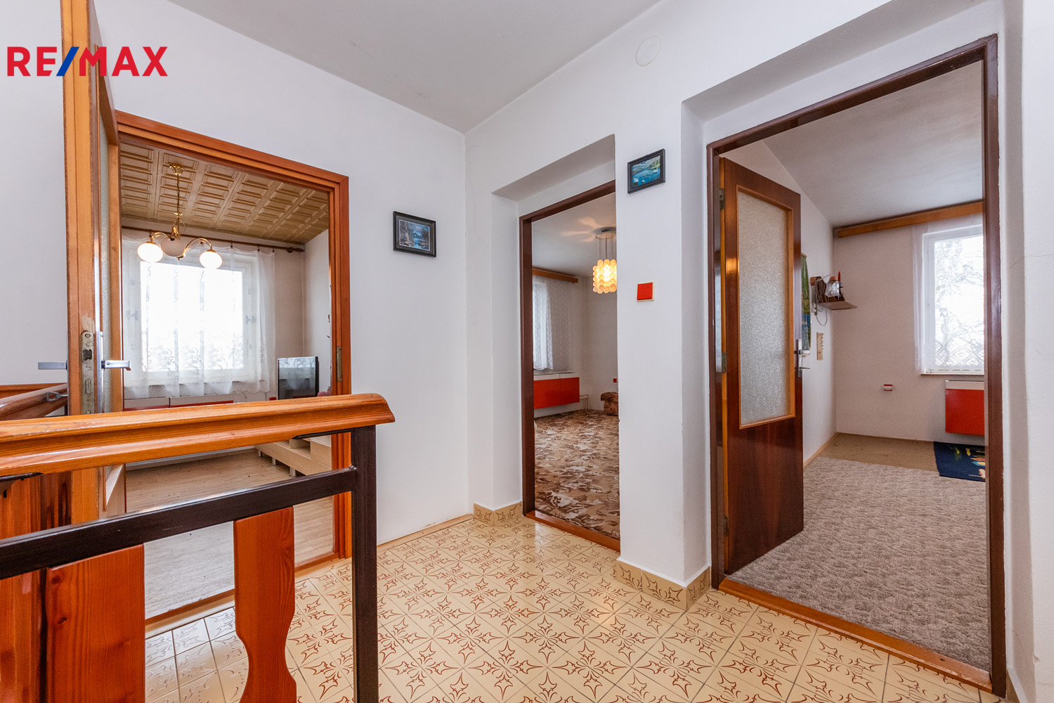 Přízemí (84 m2): veranda, centrální chodba se schodištěm, kuchyň, obývací pokoj, velký pokoj, komora, samostatné WC, koupelna s vanou i sprchovým koutem.