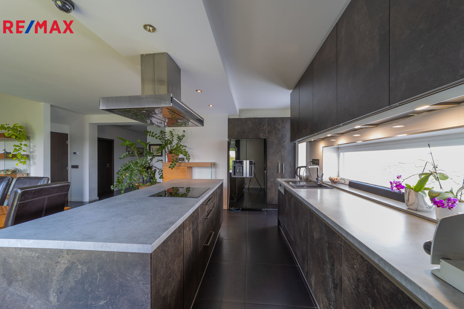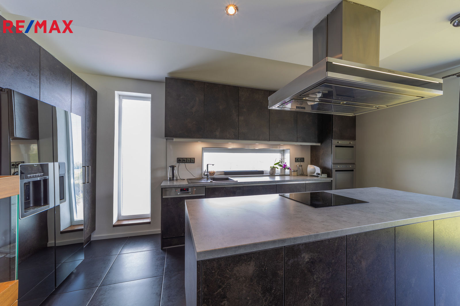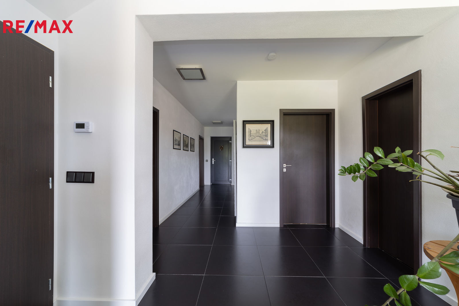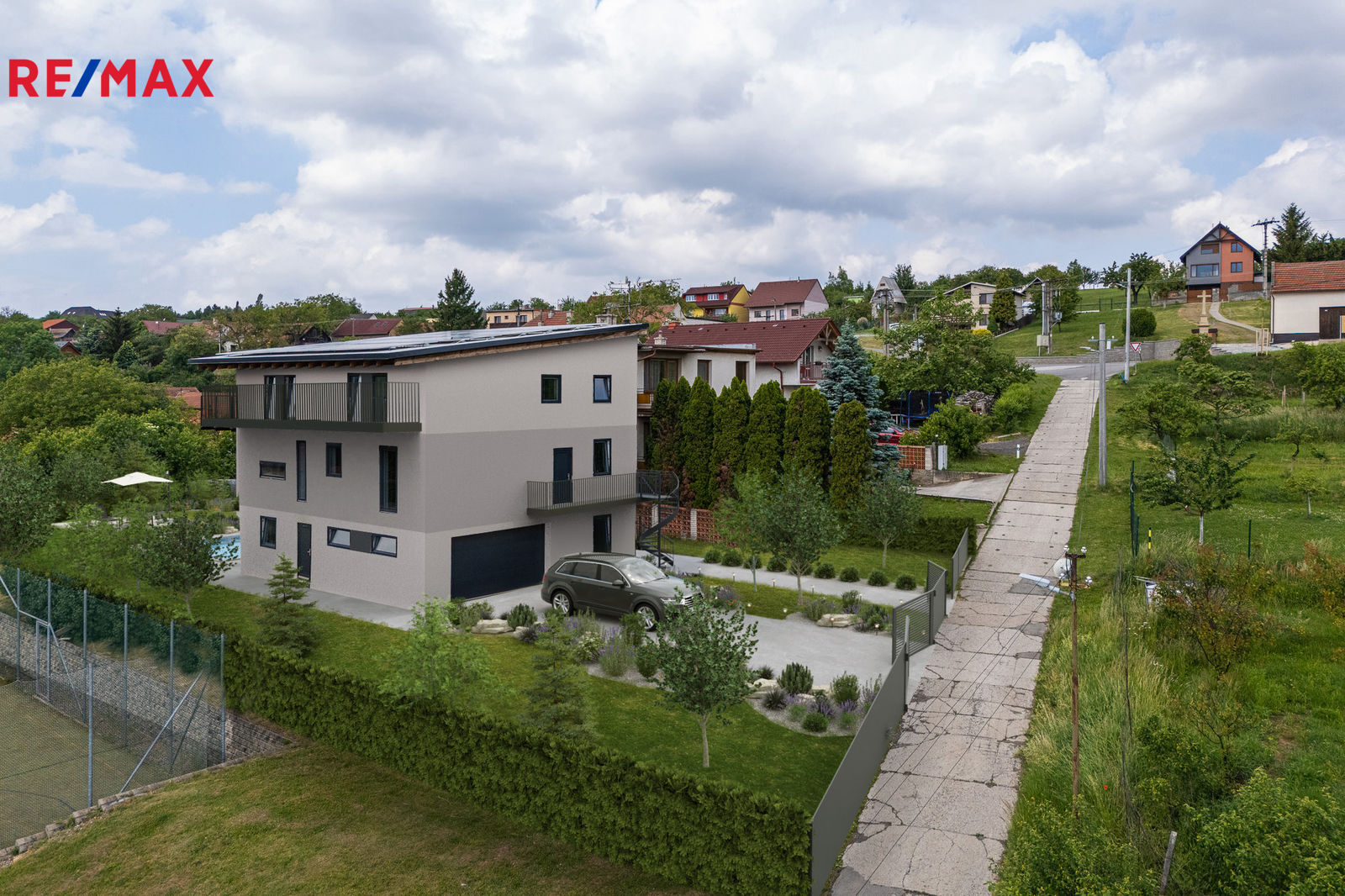 V přízemí domu je samostatná bytová jednotka 1kk včetně koupelny a samostatného wc. Dále je zde prostorná dvougaráž, dílna, sklad na sportovní potřeby a technická místnost, ve které se mimo jiné nachází řídící jednotka fotovoltaické elektrárny umístěné na střeše domu s výkonem 20 kw. Ve druhém a třetím podlaží se nachází opravdu nadstandardně řešený byt 7kk. Při vstupu do tohoto bytu máme hned v prostoru zádveří pracovnu a šatnu, dále se pak otvírá obrovský prostor, který propojuje kuchyň s varným ostrůvkem, jídelnu a obývací pokoj, který je otevřený do galerie do dalšího podlaží. Na tomto patře se dále nachází master bedroom s privátní koupelnou a také samostatná toaleta pro návštěvy. Po vzdušném a světlém schodišti vystoupáme do horního podlaží, kde se nachází soukromá zóna majitelů, kde máme k dispozici krom již zmíněné prostorné koupelny s vanou a sprchovým koutem také další šatnu a 4 pokoje. V tomto podlaží mají téměř všechny pokoje včetně koupelny přes francouzská okna přístup na balkóny, obepínající celou jihozápadní stranu domu.