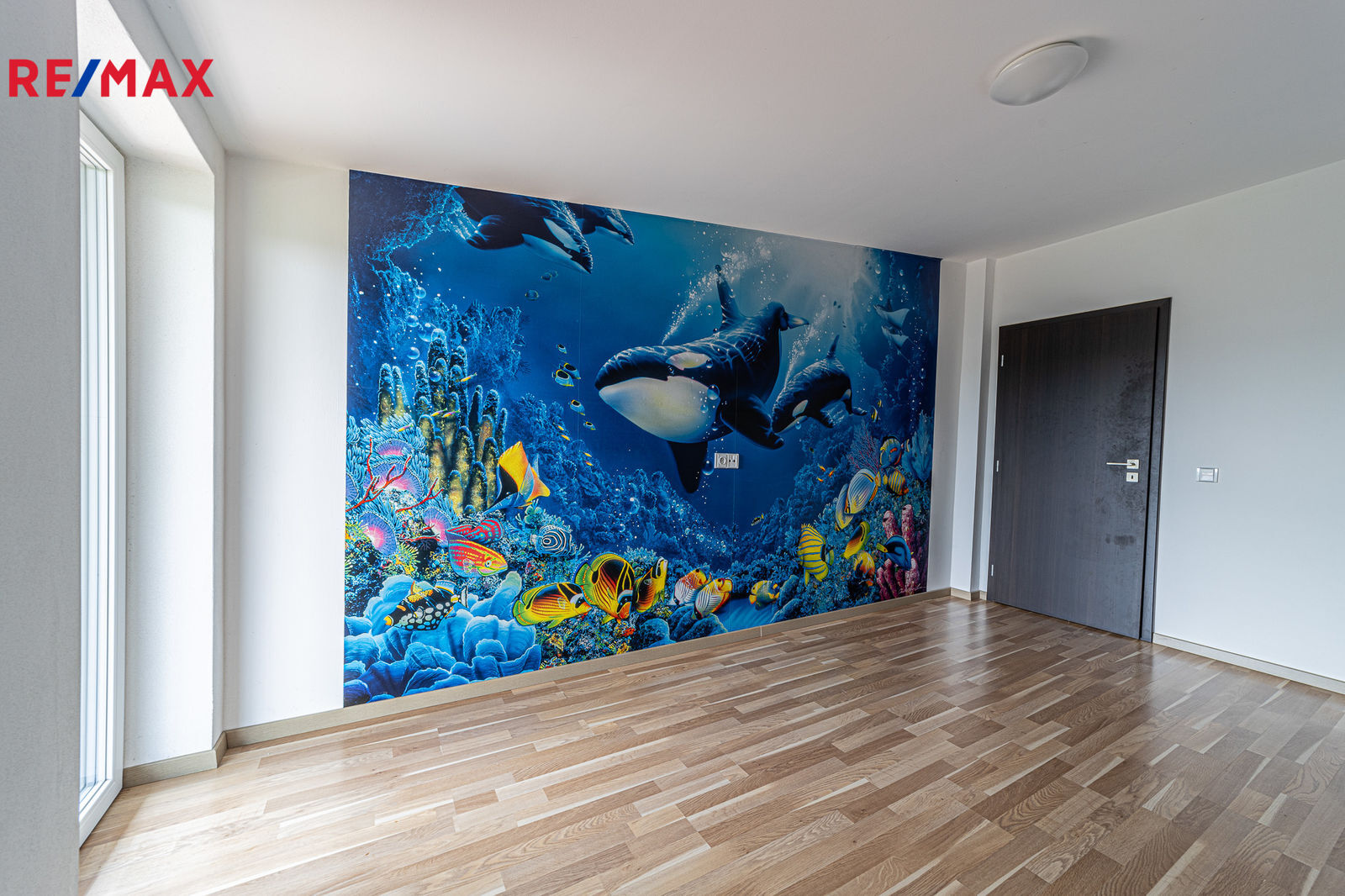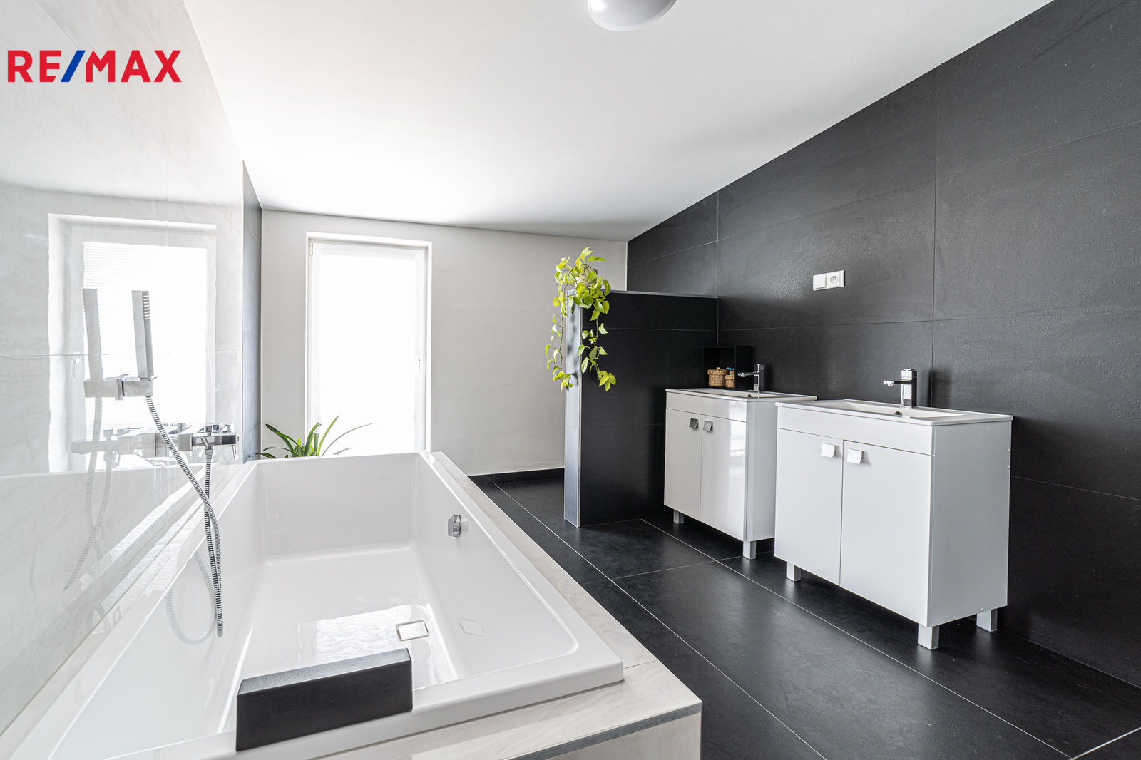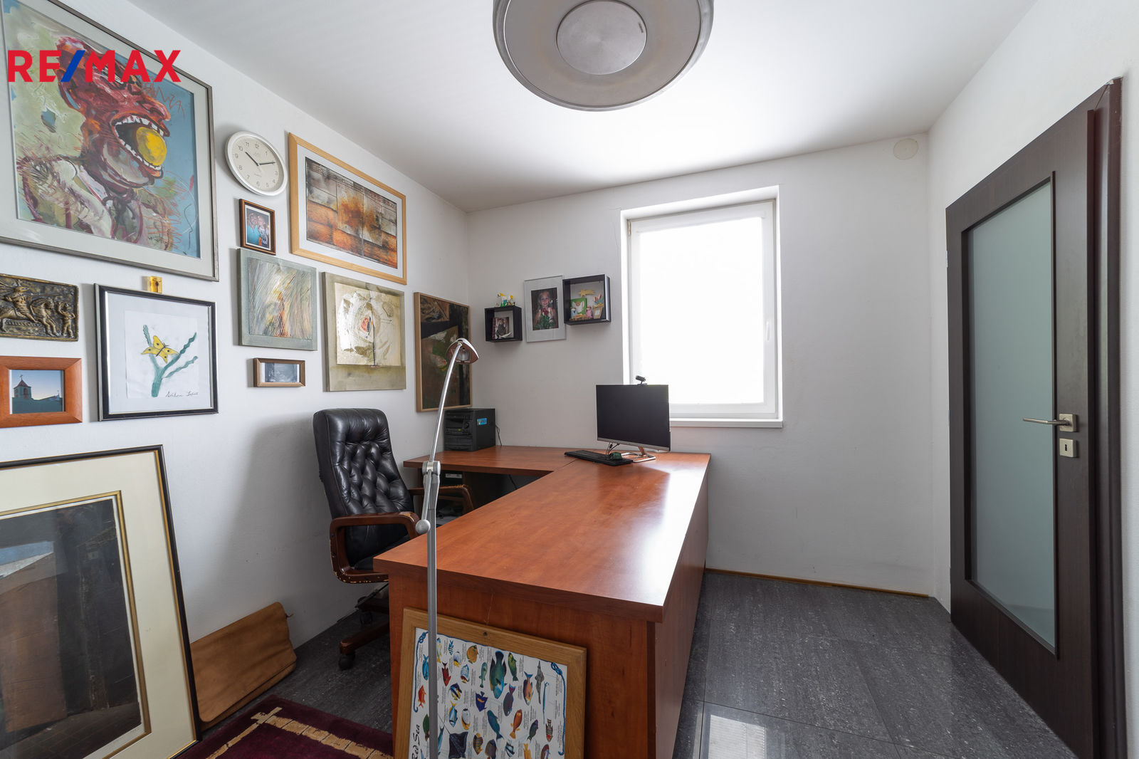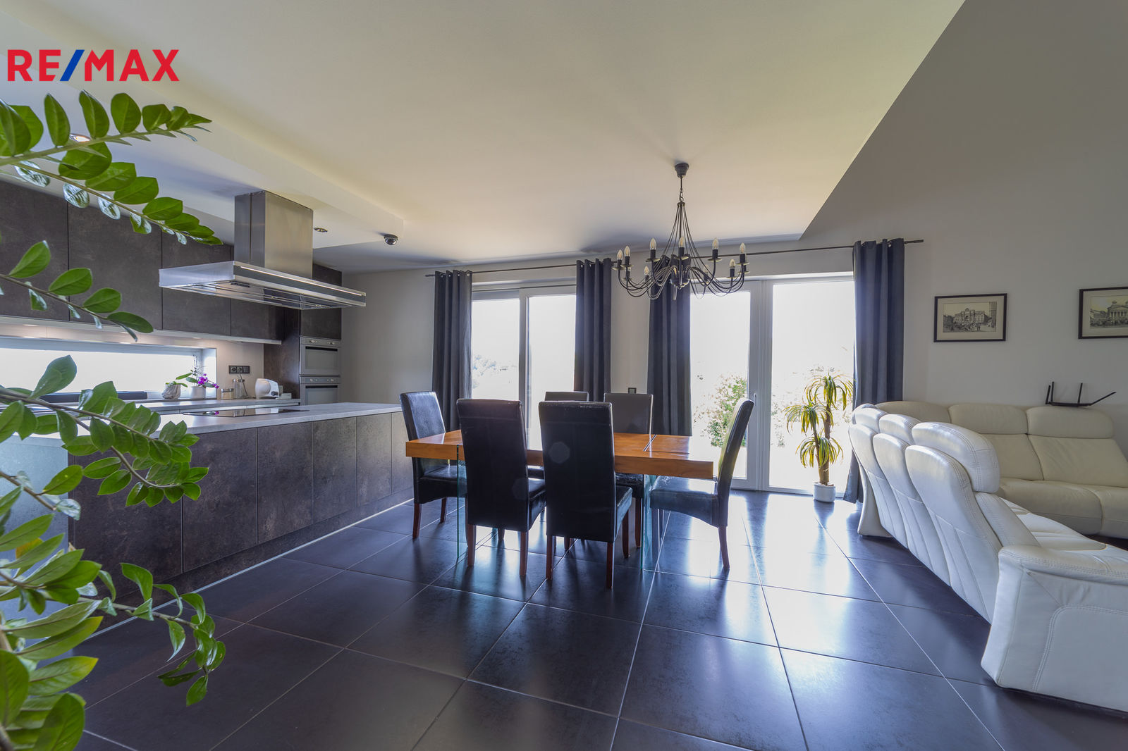 V přízemí domu je samostatná bytová jednotka 1kk včetně koupelny a samostatného wc. Dále je zde prostorná dvougaráž, dílna, sklad na sportovní potřeby a technická místnost, ve které se mimo jiné nachází řídící jednotka fotovoltaické elektrárny umístěné na střeše domu s výkonem 20 kw. Ve druhém a třetím podlaží se nachází opravdu nadstandardně řešený byt 7kk. Při vstupu do tohoto bytu máme hned v prostoru zádveří pracovnu a šatnu, dále se pak otvírá obrovský prostor, který propojuje kuchyň s varným ostrůvkem, jídelnu a obývací pokoj, který je otevřený do galerie do dalšího podlaží. Na tomto patře se dále nachází master bedroom s privátní koupelnou a také samostatná toaleta pro návštěvy. Po vzdušném a světlém schodišti vystoupáme do horního podlaží, kde se nachází soukromá zóna majitelů, kde máme k dispozici krom již zmíněné prostorné koupelny s vanou a sprchovým koutem také další šatnu a 4 pokoje. V tomto podlaží mají téměř všechny pokoje včetně koupelny přes francouzská okna přístup na balkóny, obepínající celou jihozápadní stranu domu.
