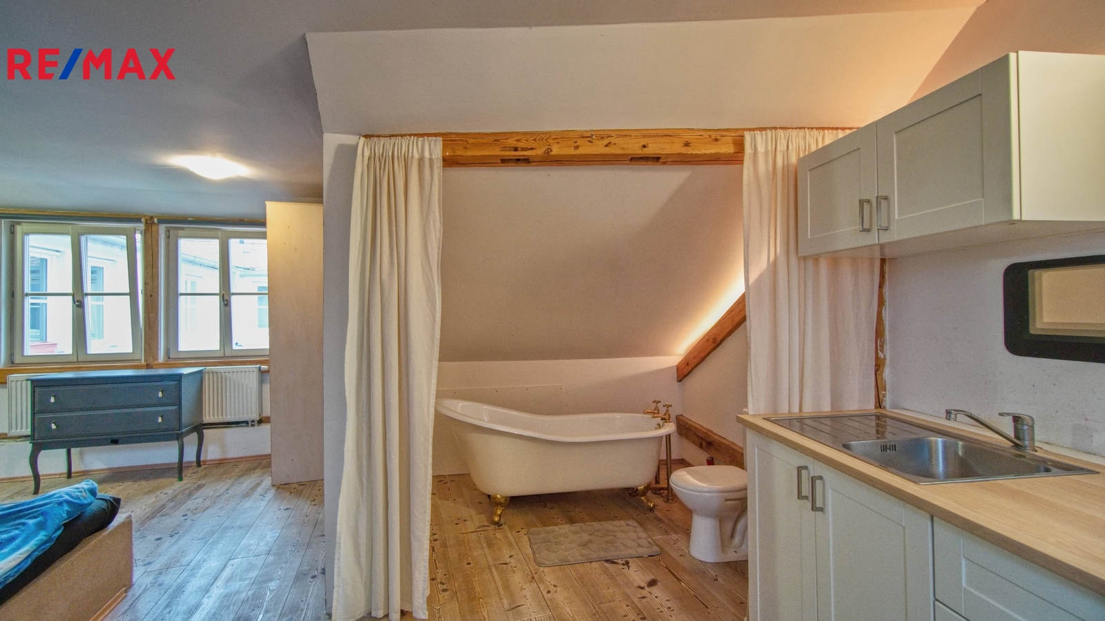 I když jsme v historické zástavbě, byt nabízí vše potřebné pro moderní život. V koupelně na vás čeká samostatně stojící vana – ideální místo pro relaxaci po procházce v Gránicích. Velkým plusem je, že celý dům i byt prošly v minulosti rekonstrukcí. Navíc díky umístění v posledním patře máte jistotu, že vám nikdo nebude „dupat“ nad hlavou.