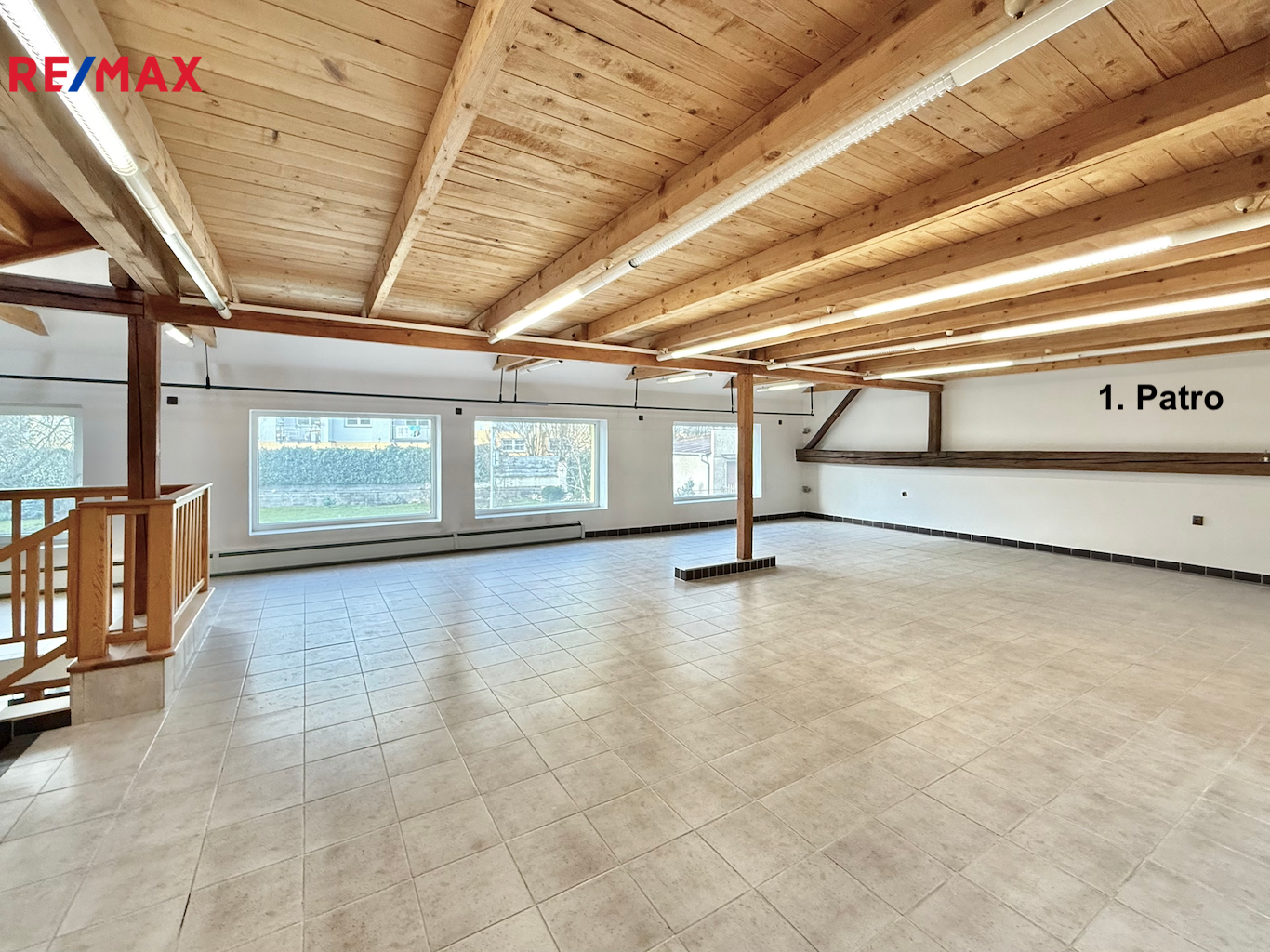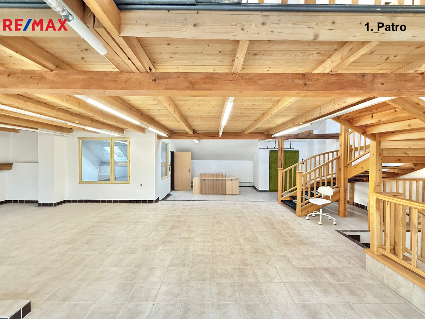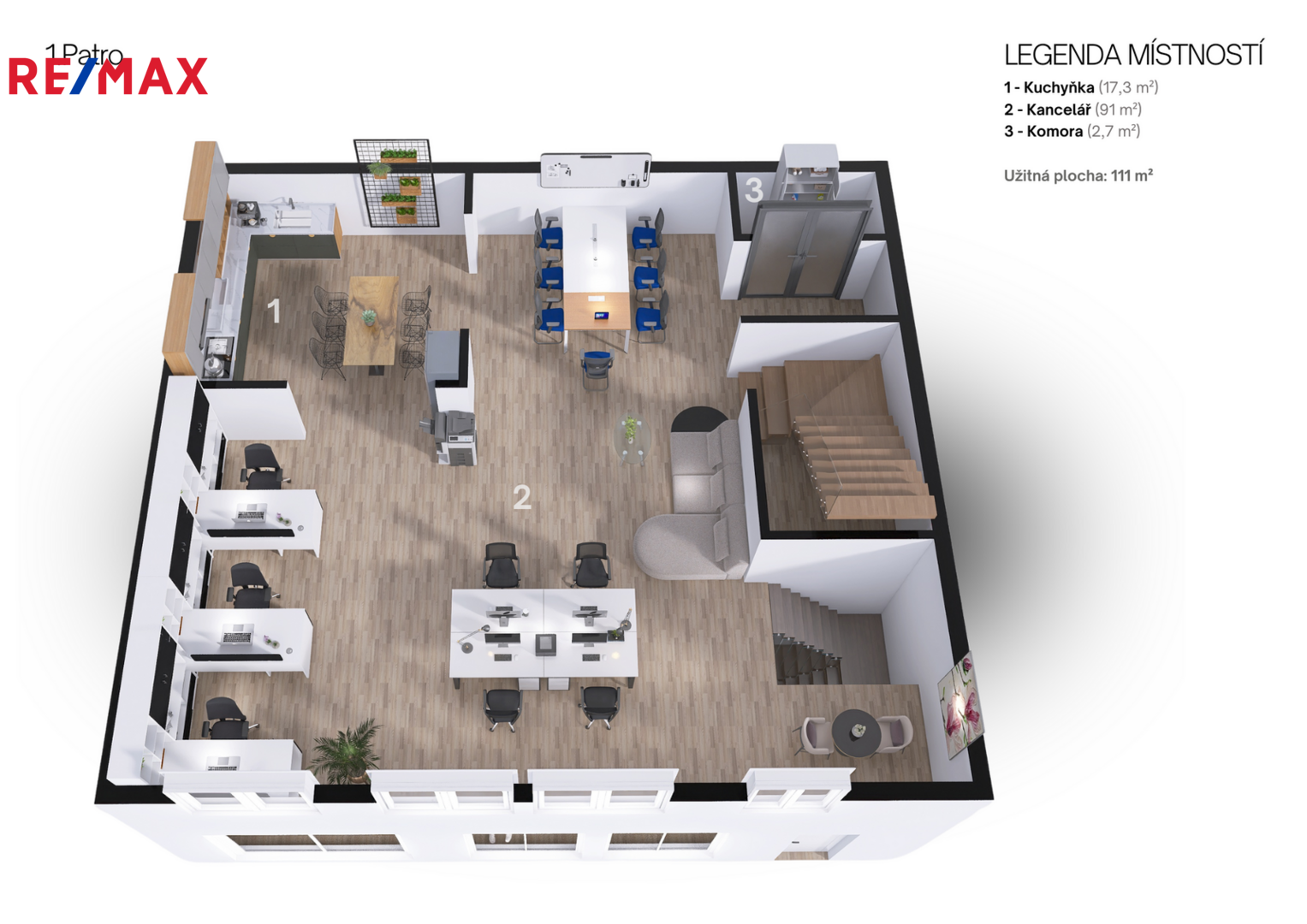 1. patro (111 m²): hlavní prostor (91 m²) vhodný jako kancelář, open space nebo poradenské centrum, dále samostatná místnost s umyvadlem (17,3 m²) využitelná jako kancelář nebo kuchyňka a komora (2,7 m²) s možností instalace nákladního výtahu.