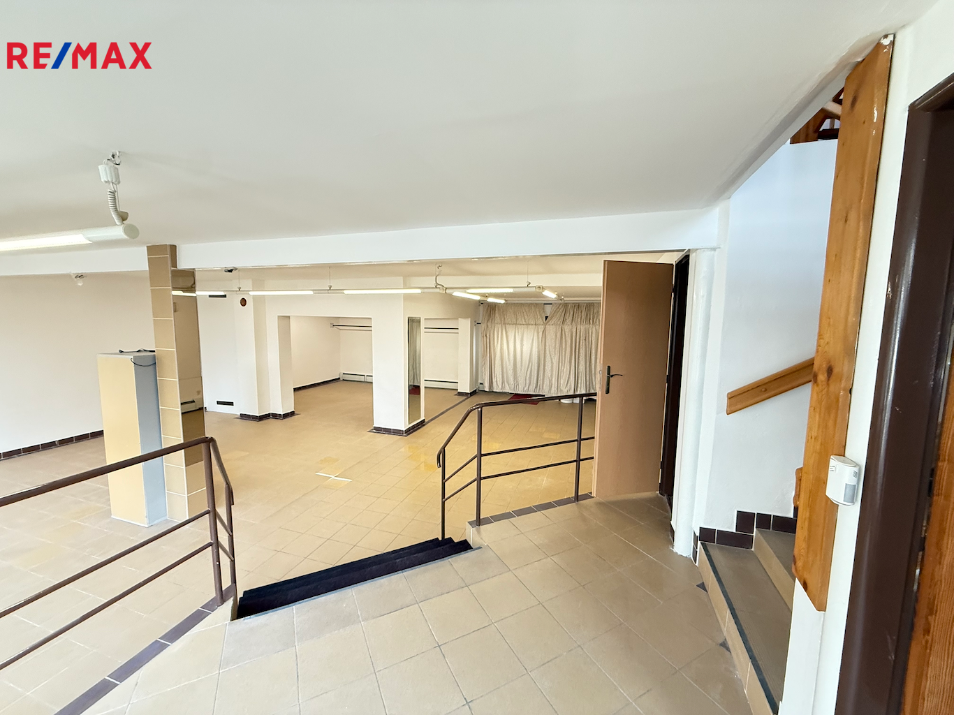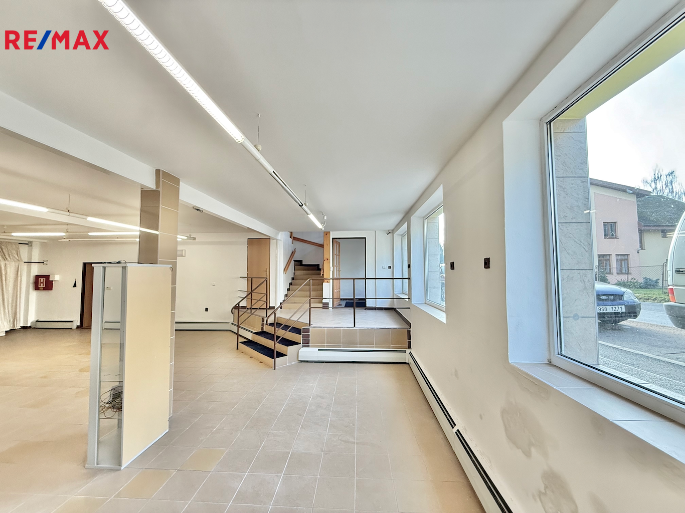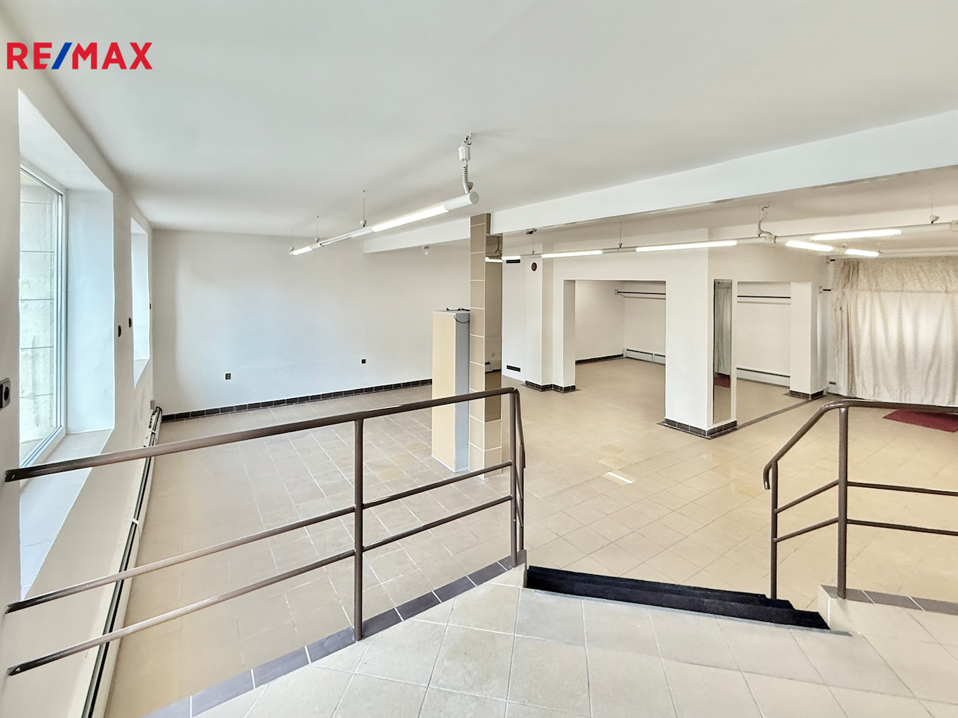 1. patro (111 m²): hlavní prostor (91 m²) vhodný jako kancelář, open space nebo poradenské centrum, dále samostatná místnost s umyvadlem (17,3 m²) využitelná jako kancelář nebo kuchyňka a komora (2,7 m²) s možností instalace nákladního výtahu.