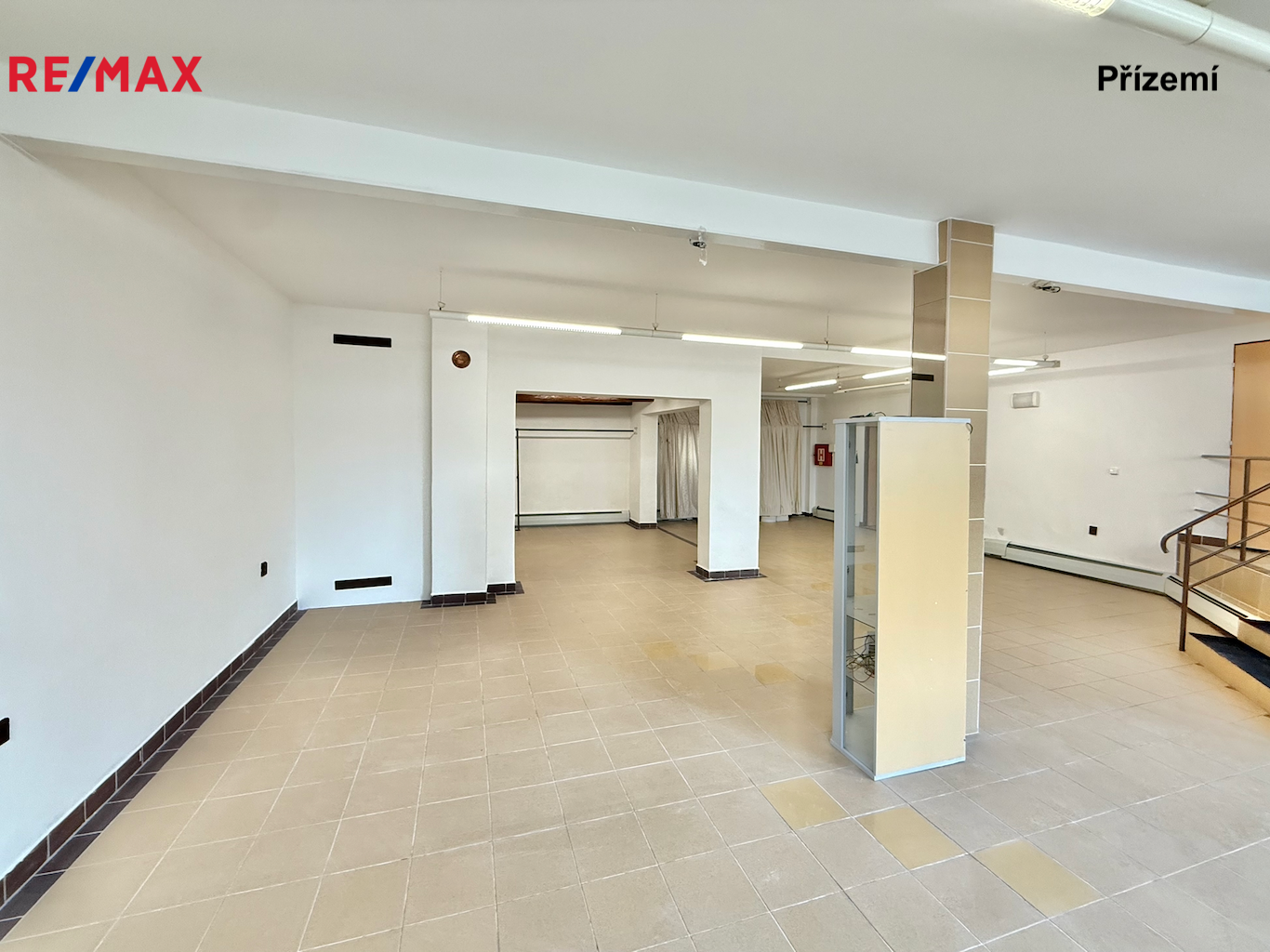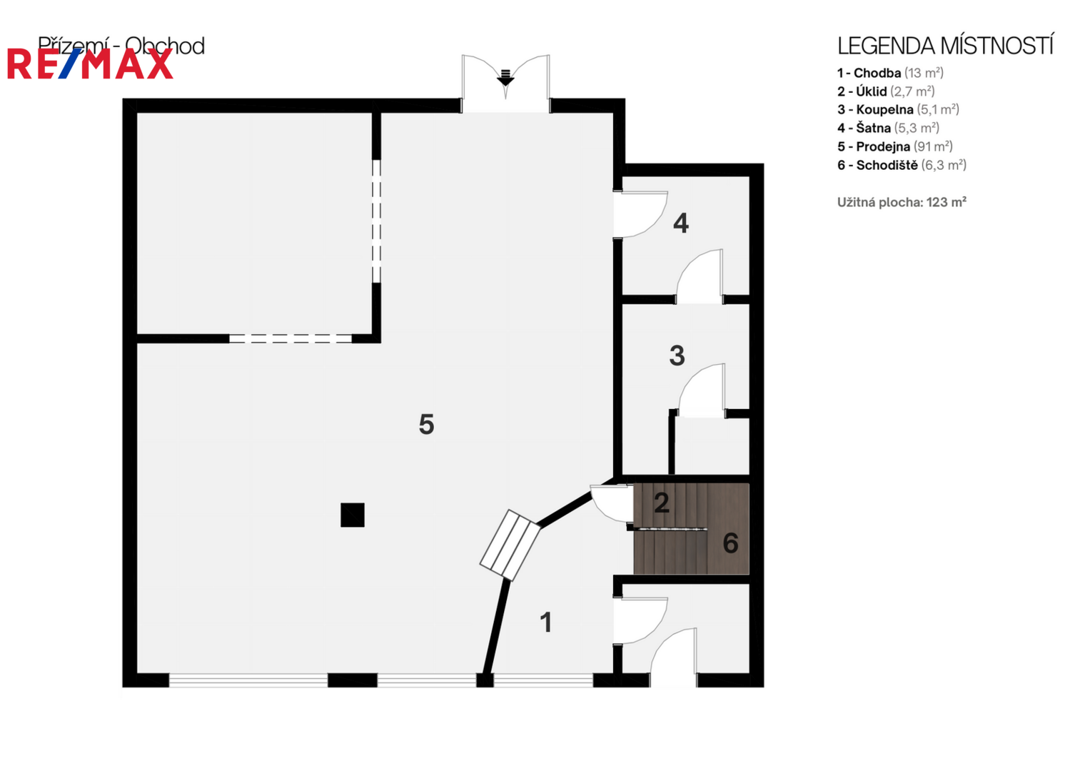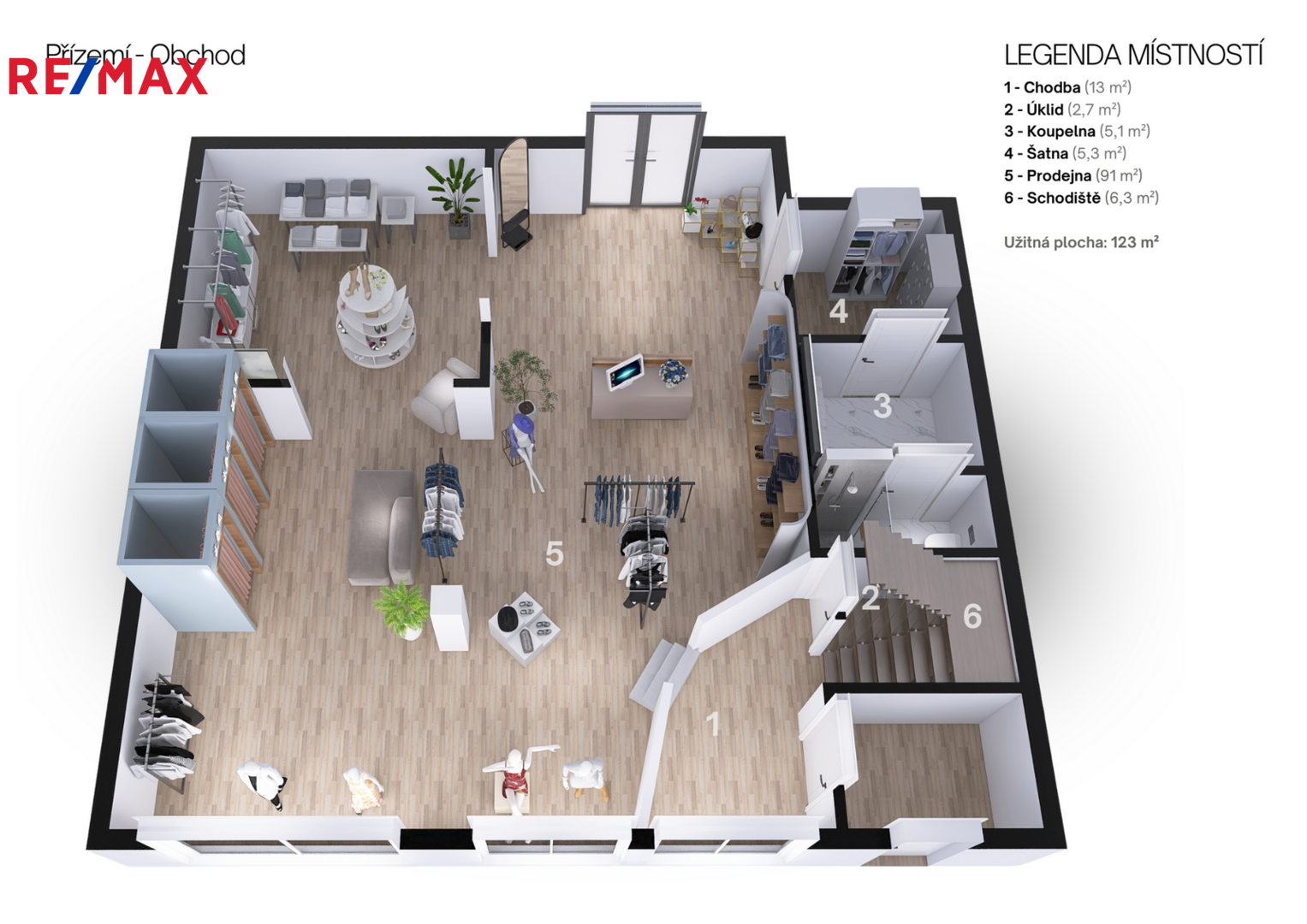 Přízemí (123 m²): zádveří, chodba, hlavní obchodní prostor (91 m²), zázemí vhodné jako šatna nebo sklad (5,3 m²), koupelna se sprchovým koutem a WC (5,1 m²) a úklidová místnost s umyvadlem (2,7 m²).