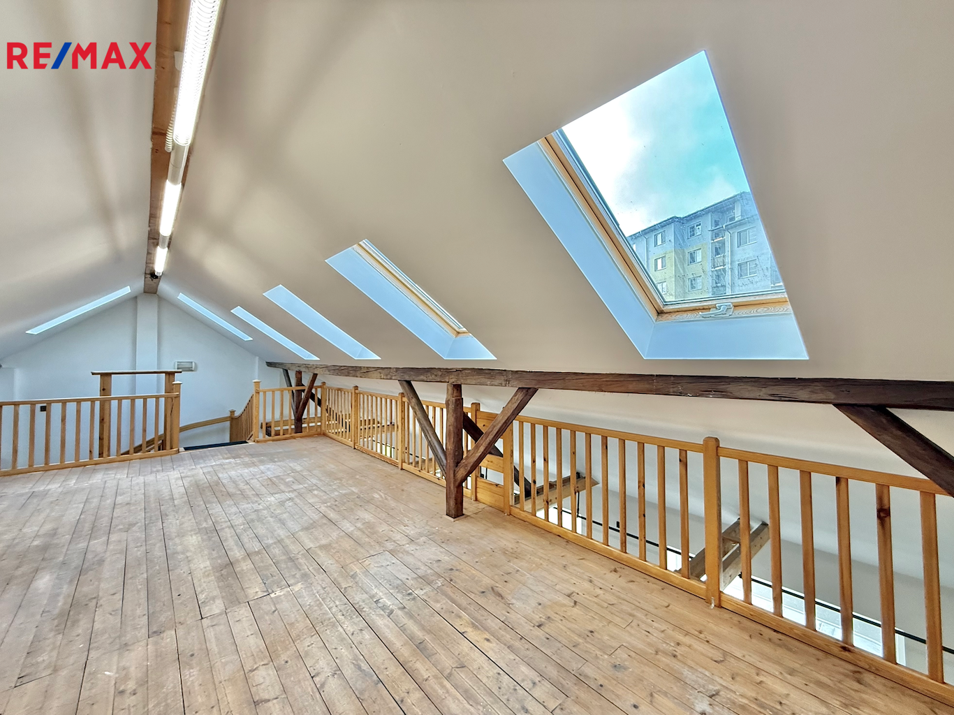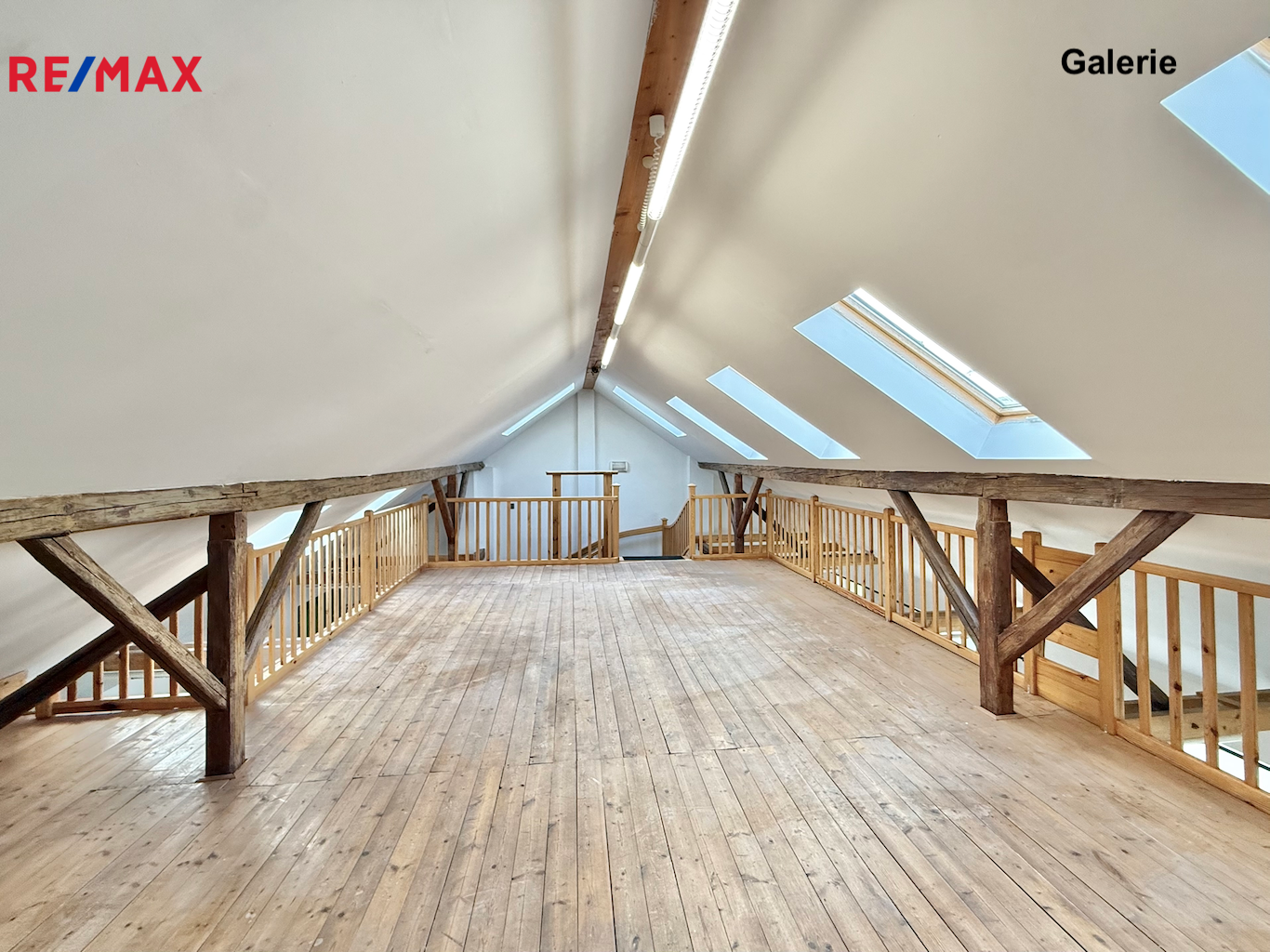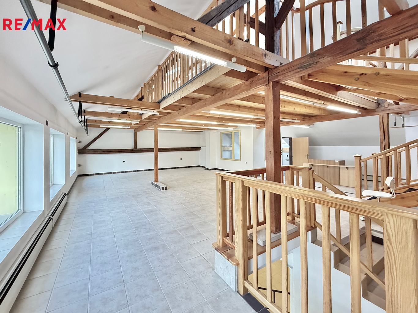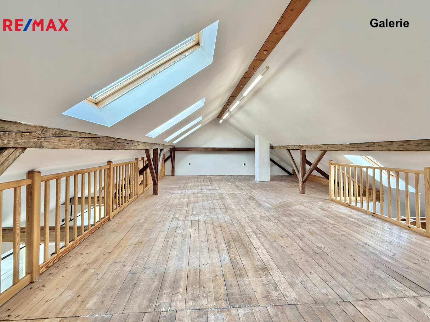 Galerie (45 m²): světlý a reprezentativní prostor ideální jako výstavní, prezentační nebo klidová pracovní zóna. Galerie je vhodná pro individuální využití, není určena pro vyšší zatížení.