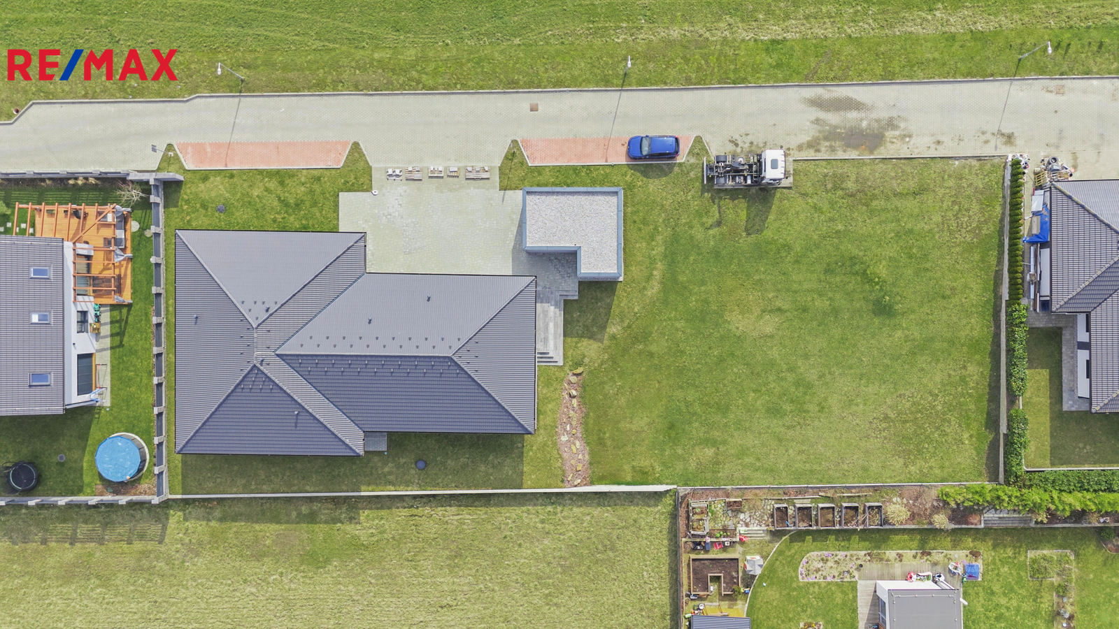 Exteriér nabízí dvě zastřešené terasy s přímým vstupem na pečlivě udržovanou zahradu, která poskytuje dostatek prostoru pro relaxaci i rodinná setkání. Na zahradě je umístěna betonová jímka na dešťovou vodu s čerpadlem a rozvodem do dvou míst zahrady, nechybí ani venkovní kohoutky na fasádě domu.