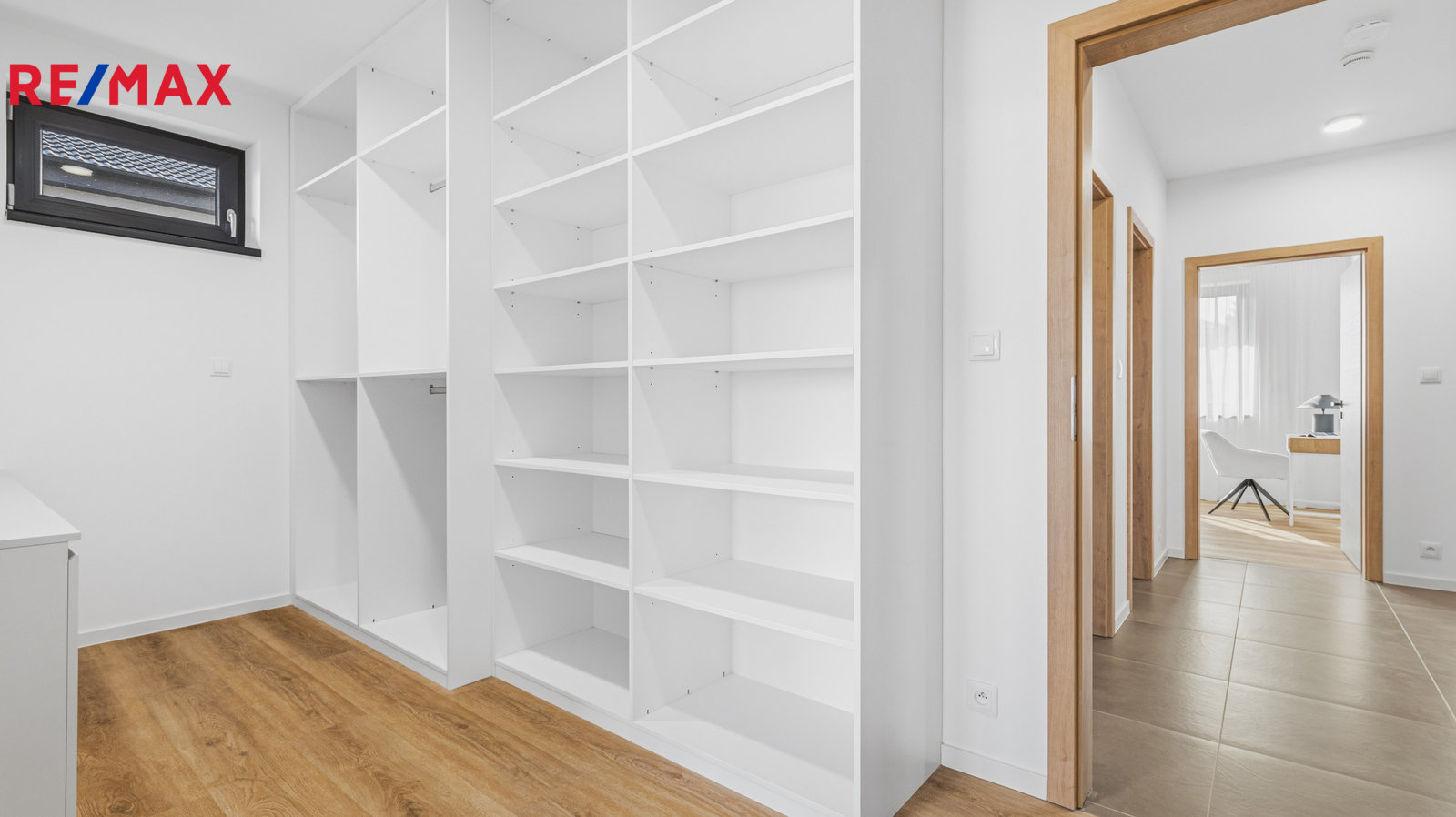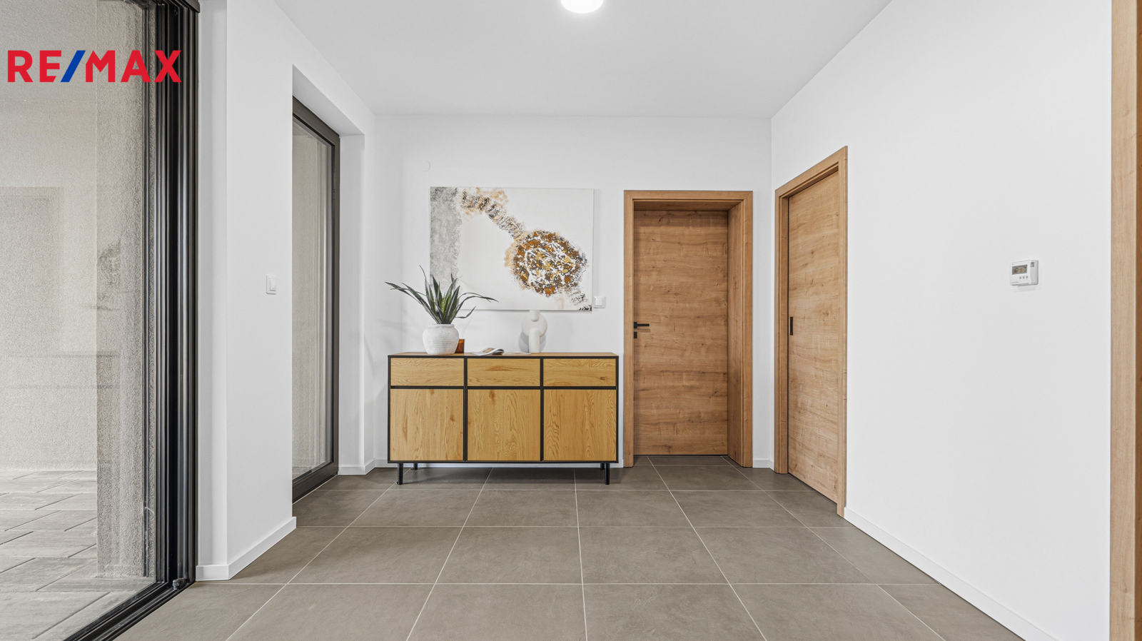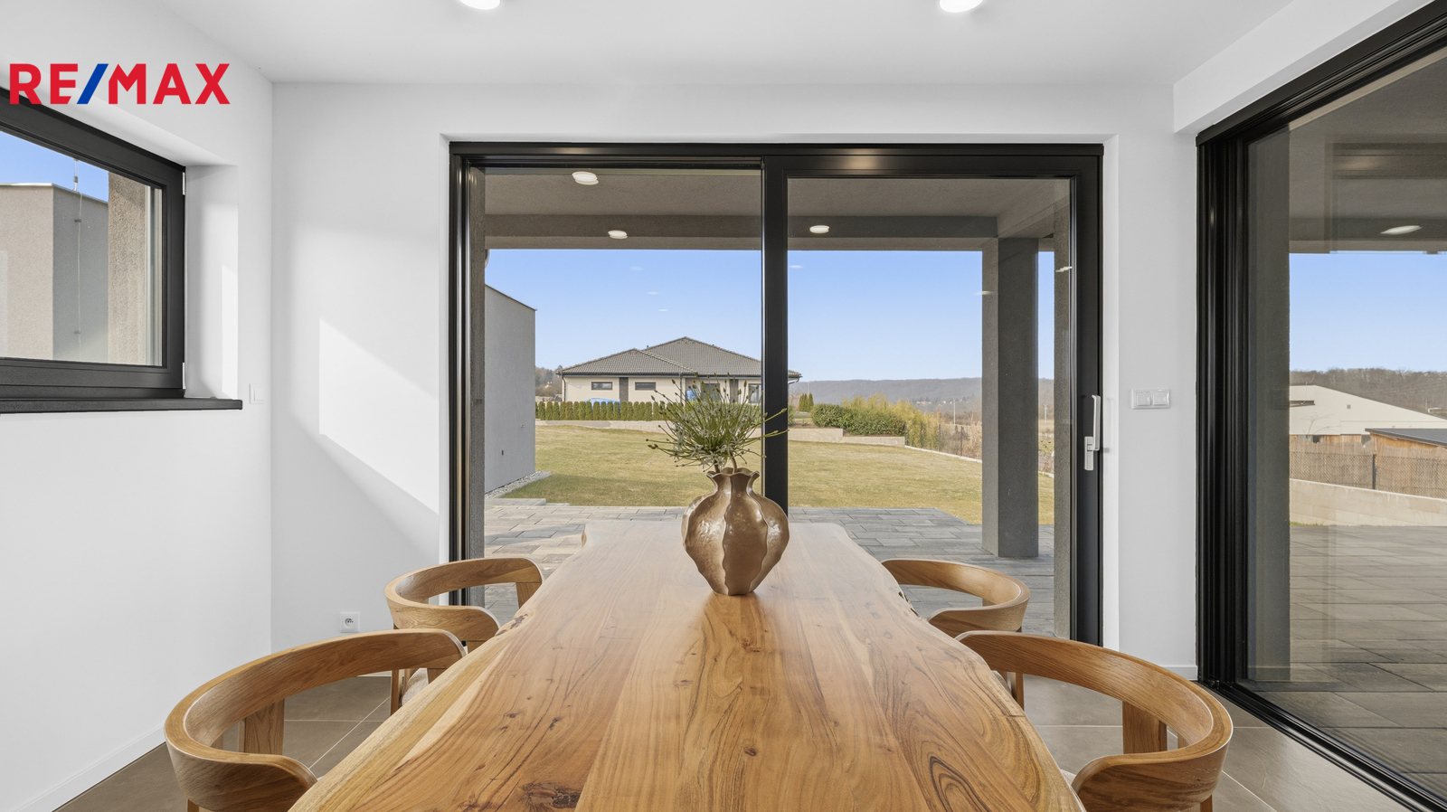 Interiér domu je laděn v moderním stylu, podlahy tvoří kombinace lepeného vinylu a velkoformátové dlažby a příjemnou tepelnou pohodu zajišťuje podlahové vytápění. Design doplňují interiérové dveře s CPL laminátem v dekoru dubu s jemnou 3D strukturou. Dům je vybaven plastovými okny s trojskly, hliníkovými posuvnými portály a vše je opatřeno venkovními roletami.
