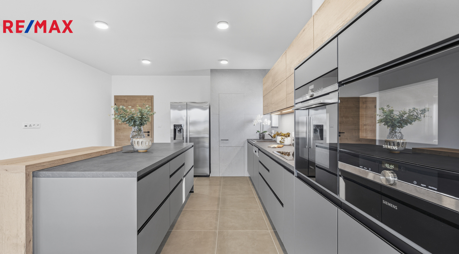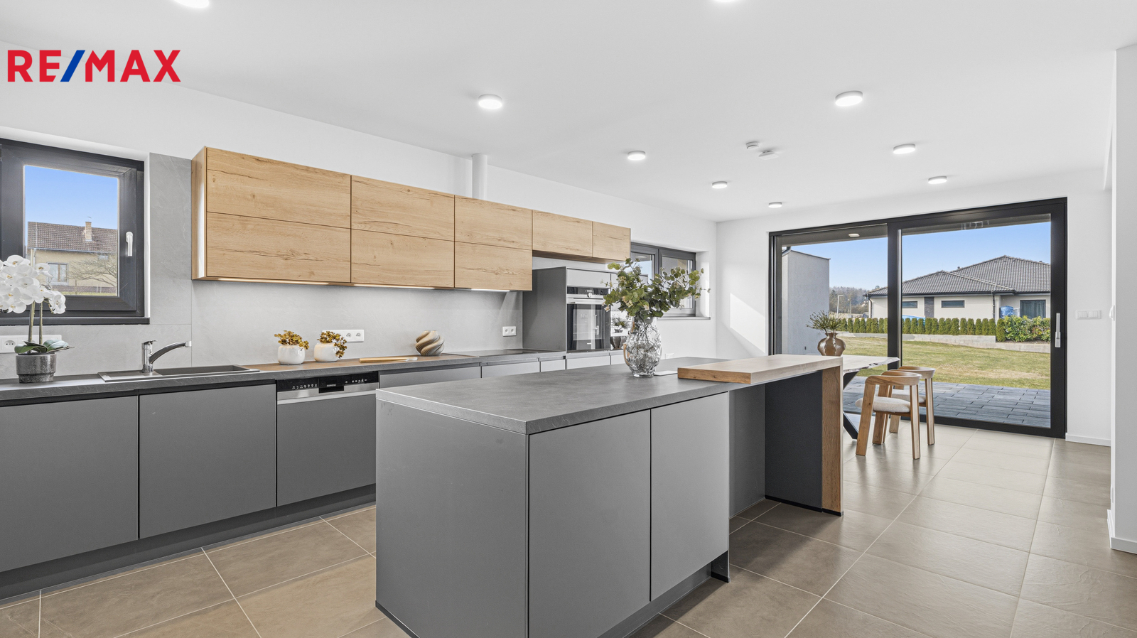 Dominantou domu je světlý a prostorný obývací pokoj a samostatná kuchyně s kuchyňskou linkou v elegantním designu, vybavenou kvalitními spotřebiči Siemens. Součástí kuchyně je také praktický ostrůvek, americká lednice a spíž poskytující dostatek úložného prostoru. Komfort bydlení dále doplňují vestavěné skříně, tři koupelny a čtyři toalety. K dispozici je také pochozí půda vhodná pro uskladnění sezónních věcí.