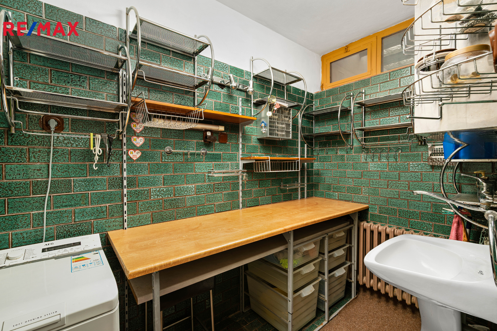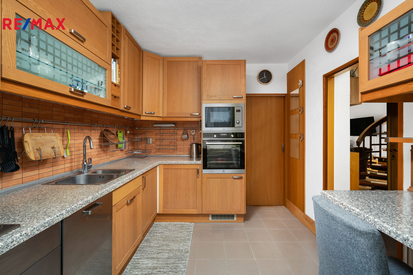 Kuchyň je vybavena vestavěnými spotřebiči – lednicí, troubou, myčkou, mikrovlnnou troubou a plynovým sporákem.