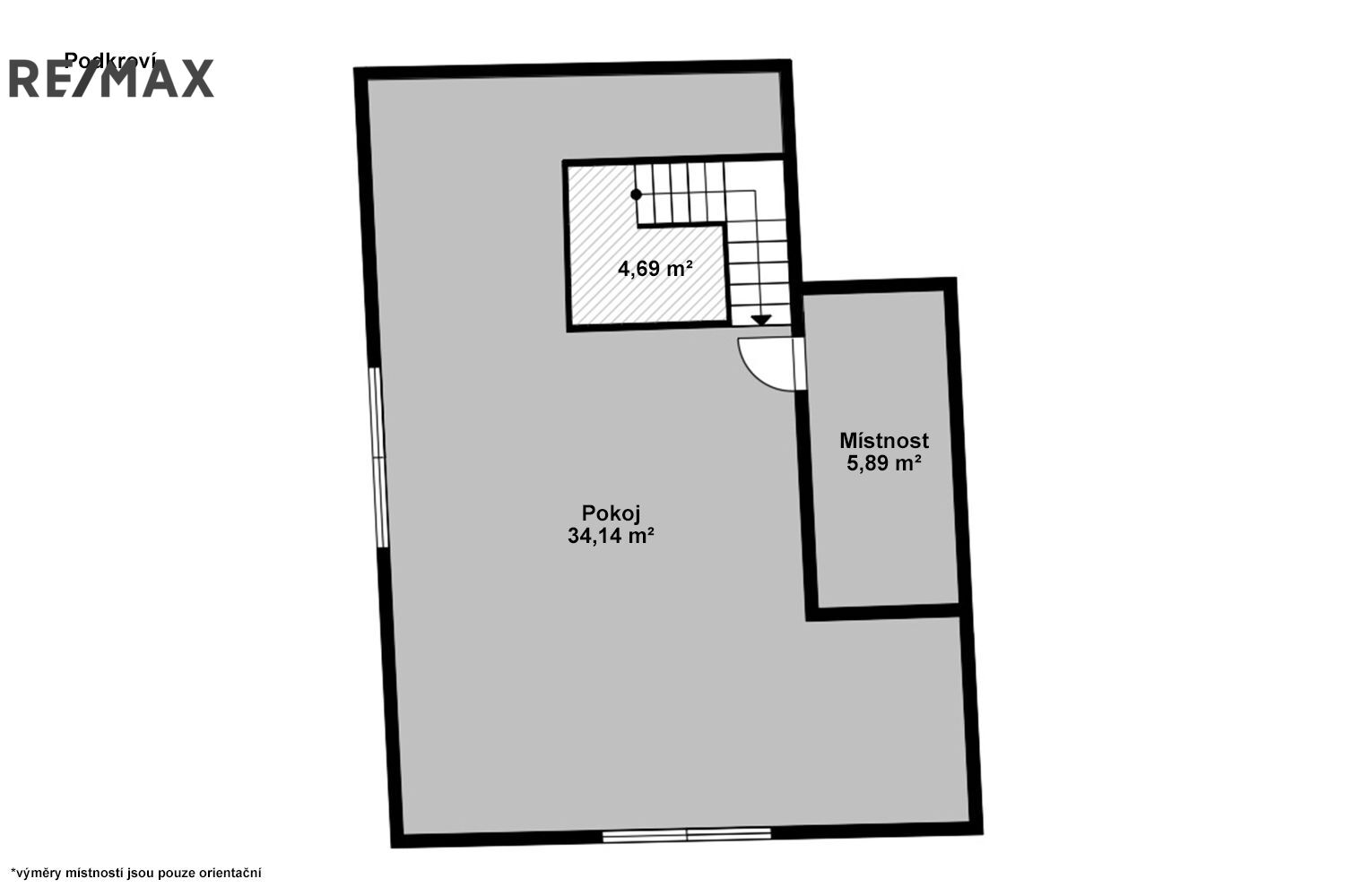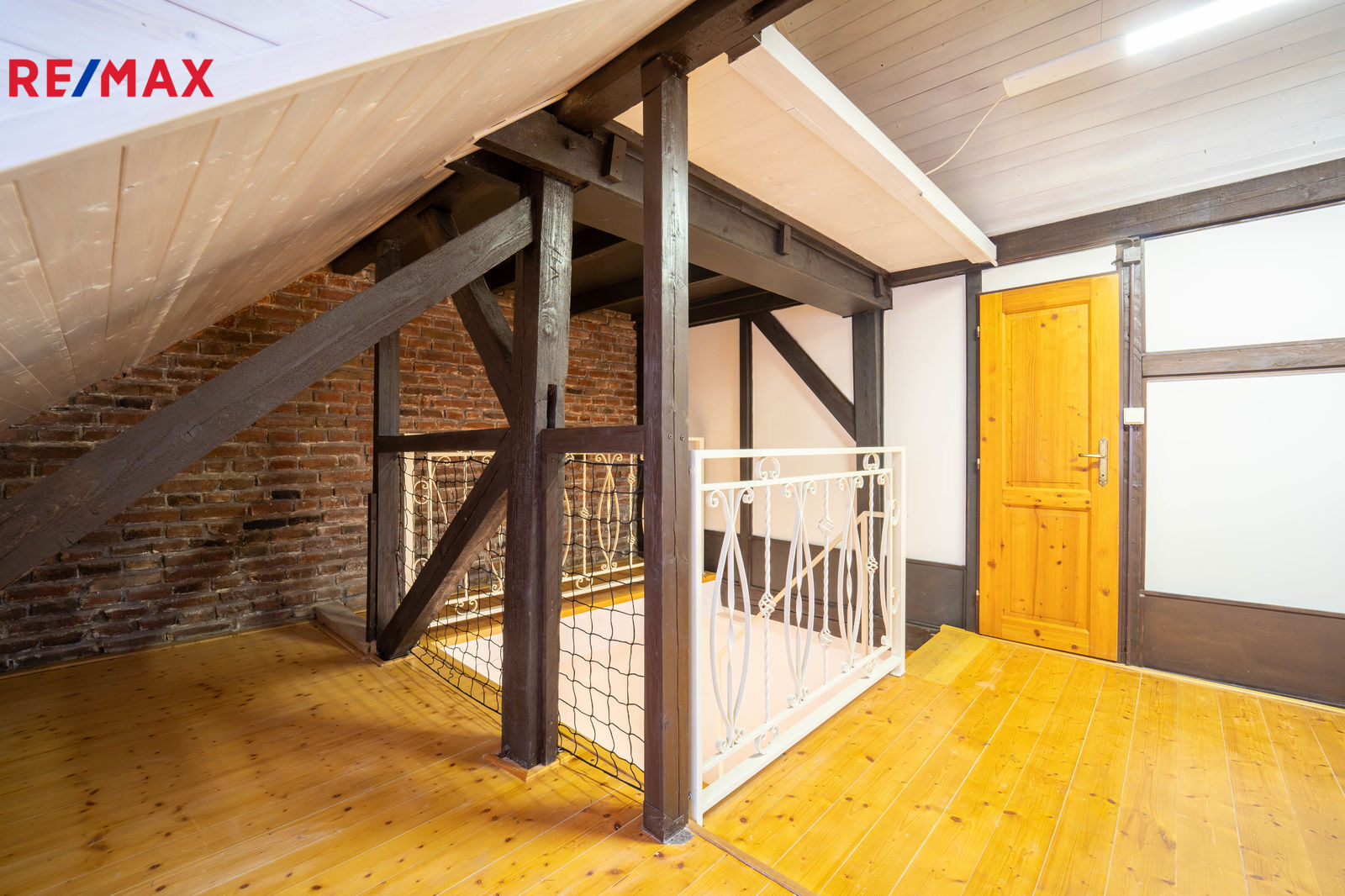Dům se skládá z přízemí o celkové ploše 47, 5 m2, které dříve sloužilo jako fotoateliér. Nemovitost má dále rozlehlé patro se samostatným vstupem. Plocha patra (2. NP) je 54,5 m2 včetně zázemí (kuchyňka, koupelna se sprchovým koutem a WC, chodba a komora). Z obytného patra dále vystoupáte po schodišti do podkroví (3. NP). Podkroví je opět velká místnost o ploše 34,14 m2 a je zde dále komora (5,89 m2). Nemovitost mimo kuchyňky je bez vybavení. Dům je částečně podsklepen.