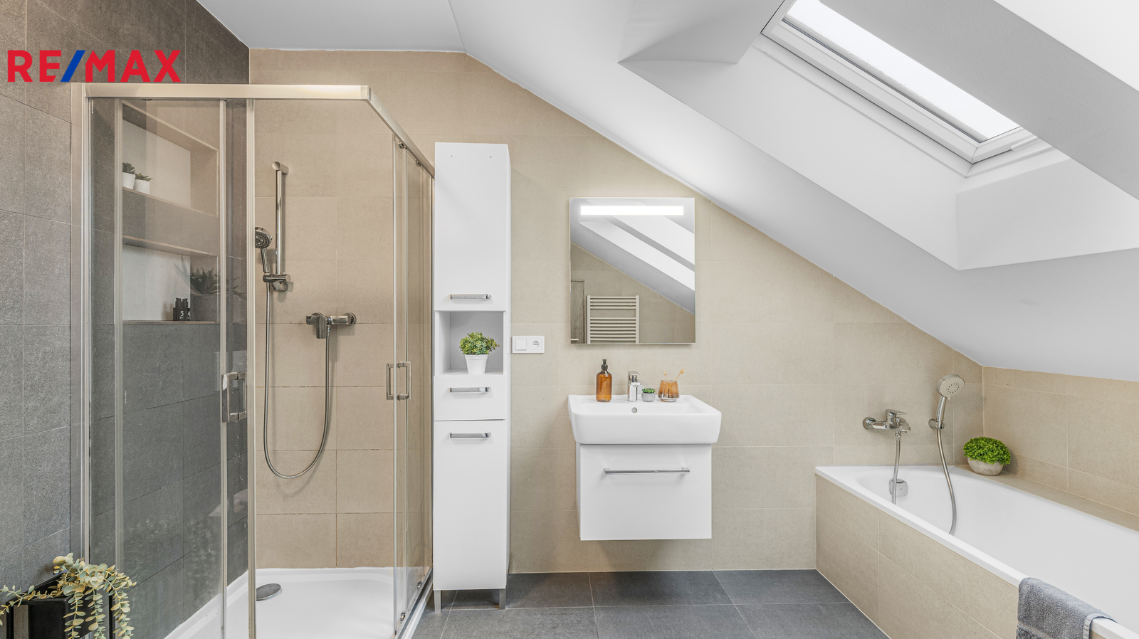 Byt je promyšleně rozdělen do tří podlaží a poskytuje dostatek prostoru i soukromí pro větší rodinu. Dominantou je obývací pokoj propojený s moderní kuchyňskou linkou, která byla vyrobena v roce 2023 a je vybavena vestavnými spotřebiči – myčkou, sporákem, digestoří, troubou a mikrovlnnou troubou. V interiéru se dále nachází koupelna s vanou i sprchovým koutem, tři toalety, praktická šatna a samostatná prádelna. Samozřejmostí jsou plovoucí podlahy a plastová okna. Z ložnice ve 3. podlaží je vstup na balkón orientovaný do zahrady.