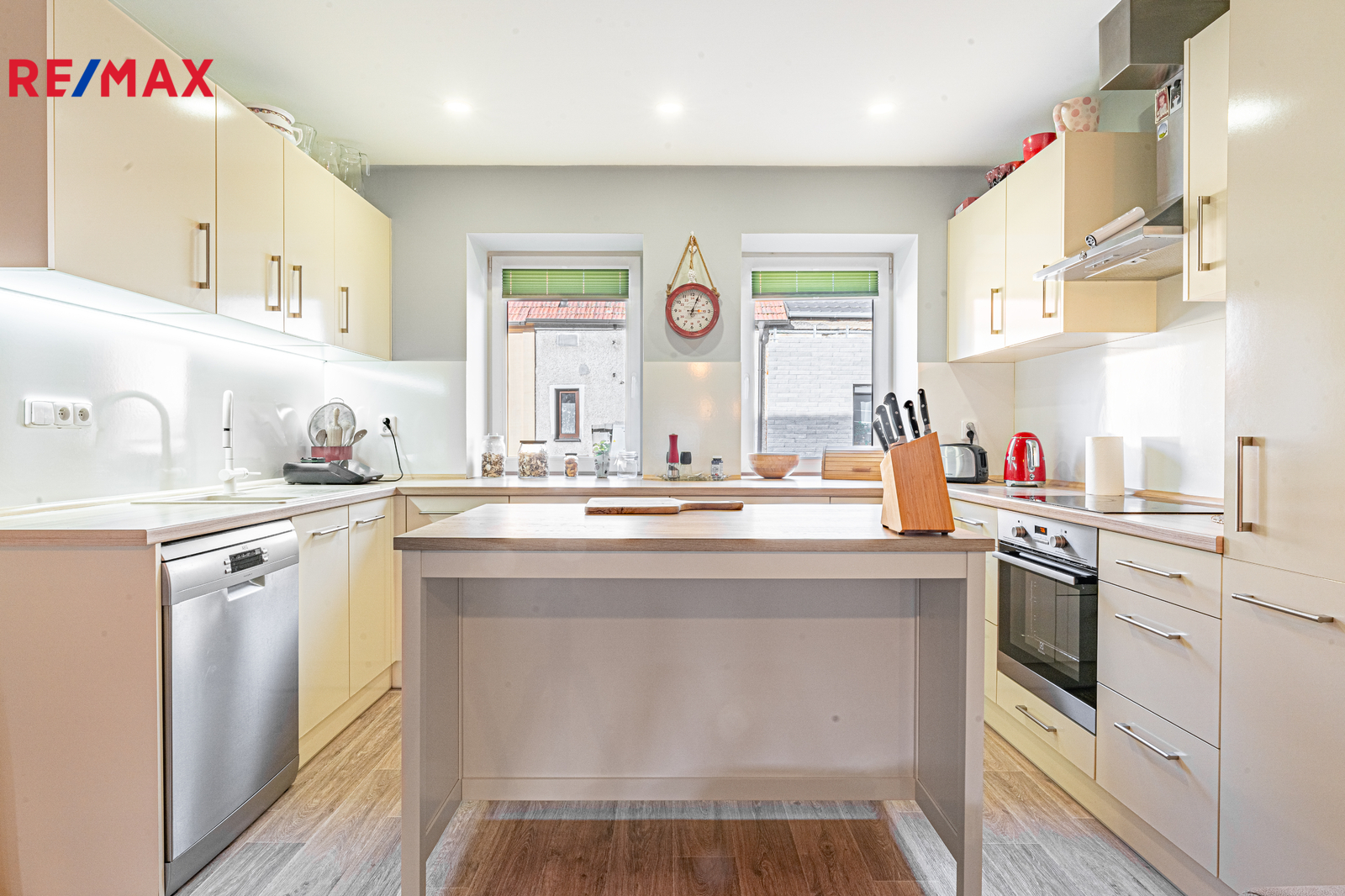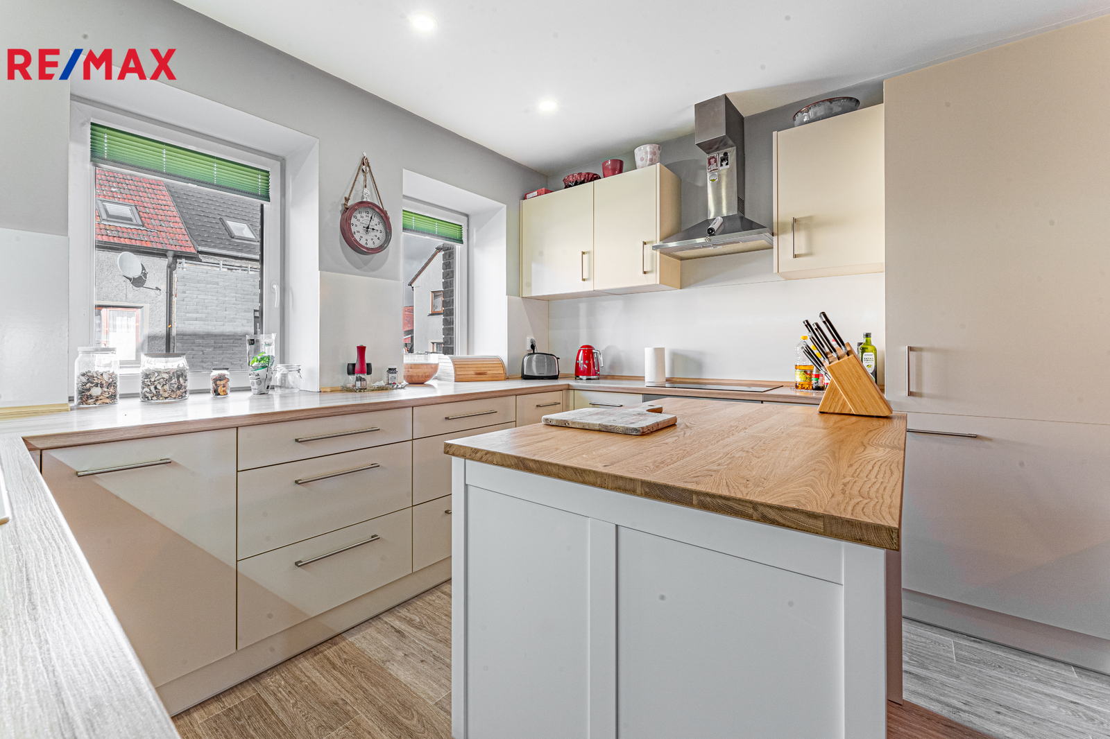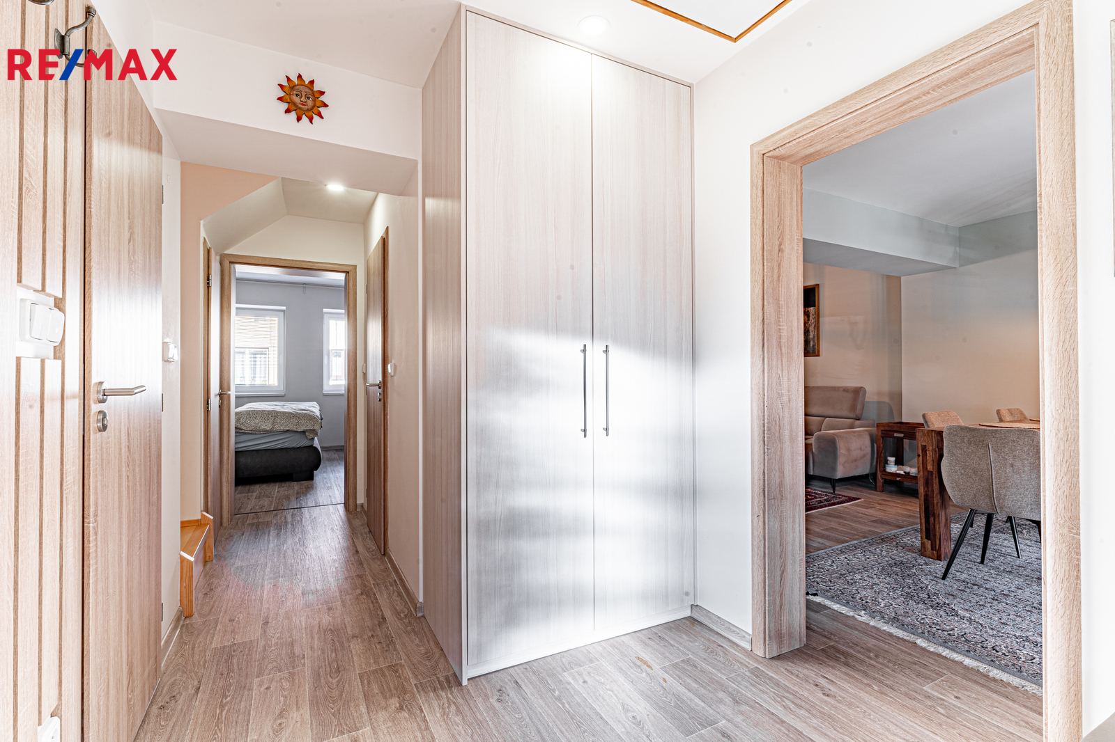 Přízemí: Srdcem domu je prosvětlený obývací pokoj s kuchyní ve tvaru „U“. Ostrůvek s velkou pracovní plochou je ideální místo pro společné snídaně nebo večerní skleničku, zatímco vaříte. Dále zde najdete ložnici, koupelnu a chodbu, která je centrálním bodem – do žádného pokoje nemusíte procházet přes jiný, což zajišťuje naprosté soukromí.