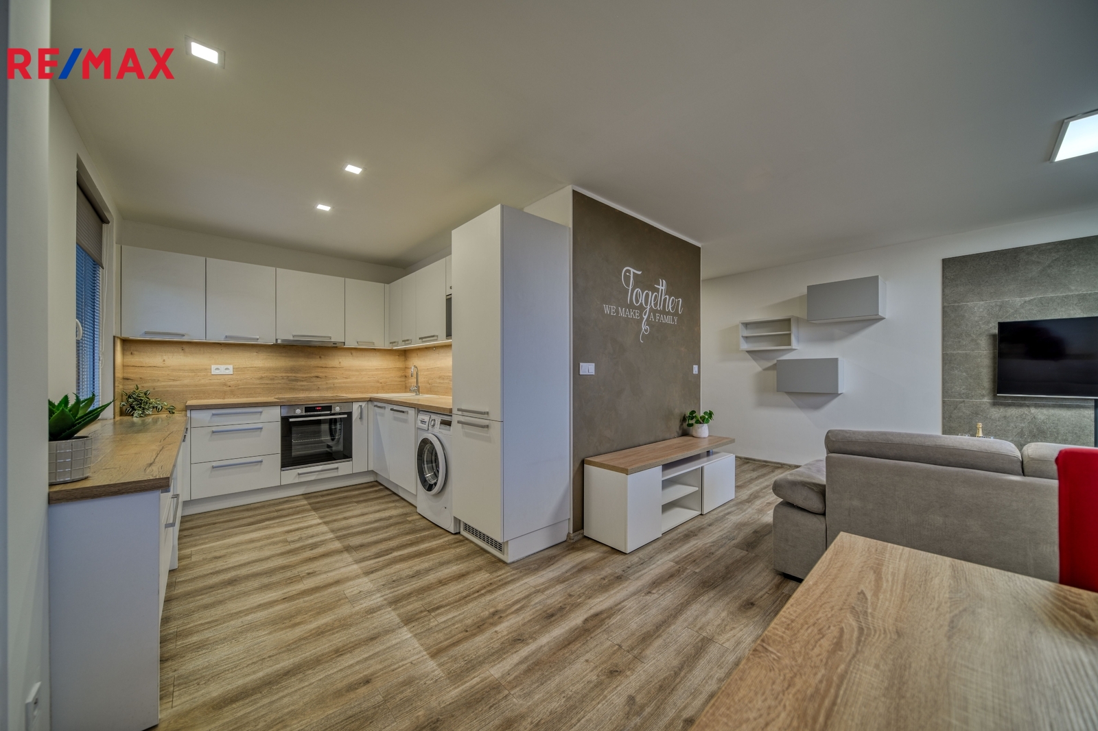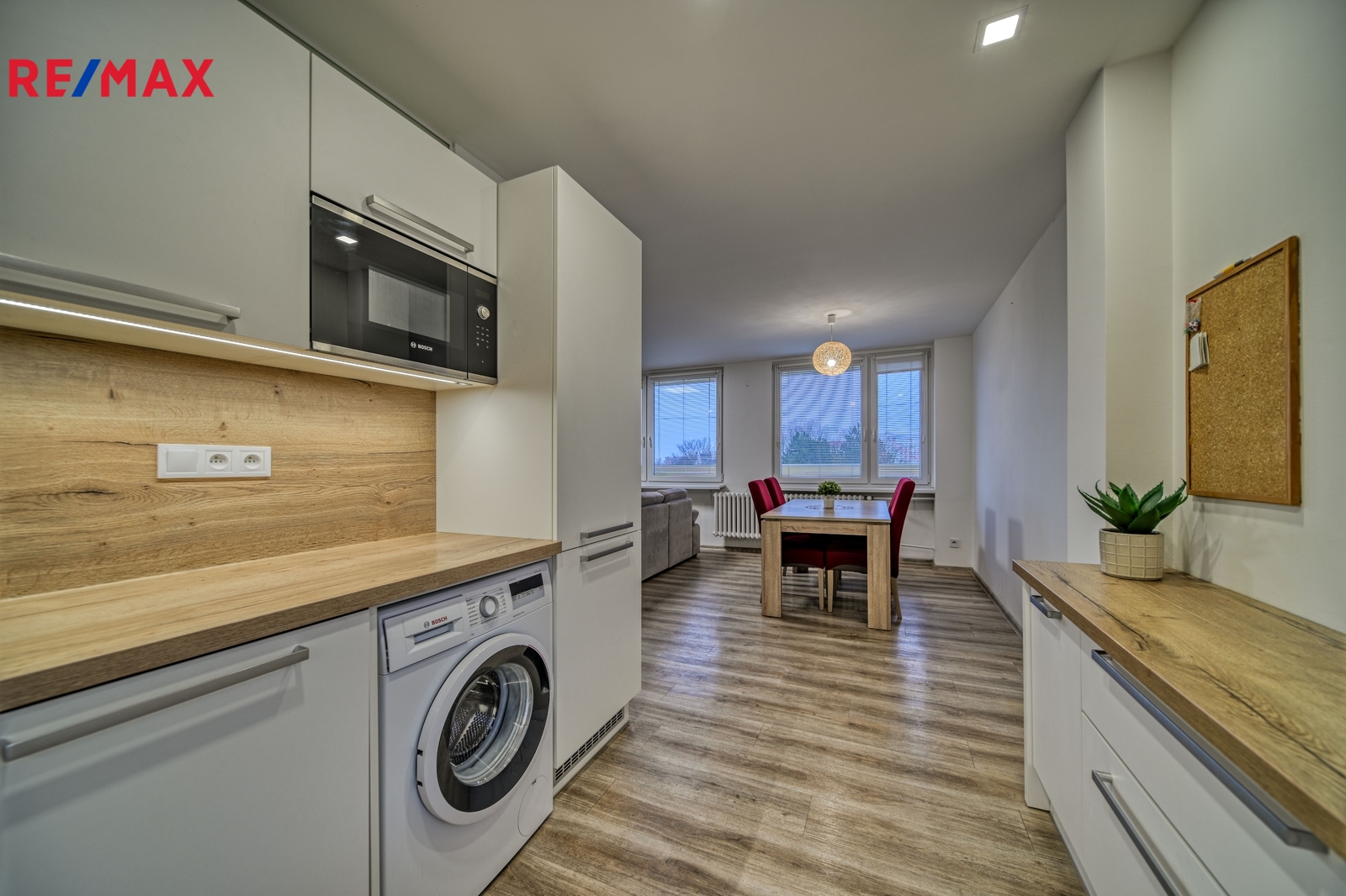 Byt disponuje prostorným obývacím pokojem navazujícím na plně vybavenou kuchyňskou linku s vestavěnou varnou deskou, troubou, digestoří, myčkou a mikrovlnnou troubou. Dále je zde lednice s mrazákem a pračka.