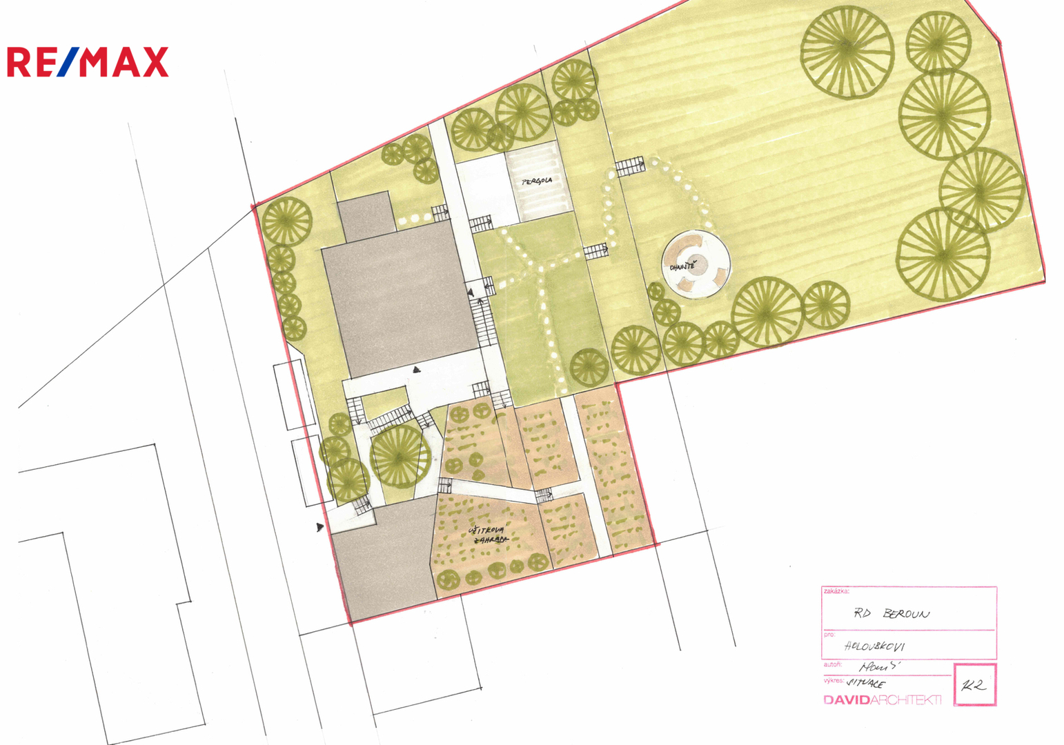 Původně svažitý pozemek byl upraven do rovinatých kaskád, na nichž se nachází i vinohrad. K dispozici je rovněž prostorná garáž s pochozí střechou, která nabízí další možnosti využití. Horní část pozemku je ideální například pro dětské hřiště či jiné volnočasové aktivity a navíc poskytuje přímý vstup do přilehlé, nedotčené přírody.