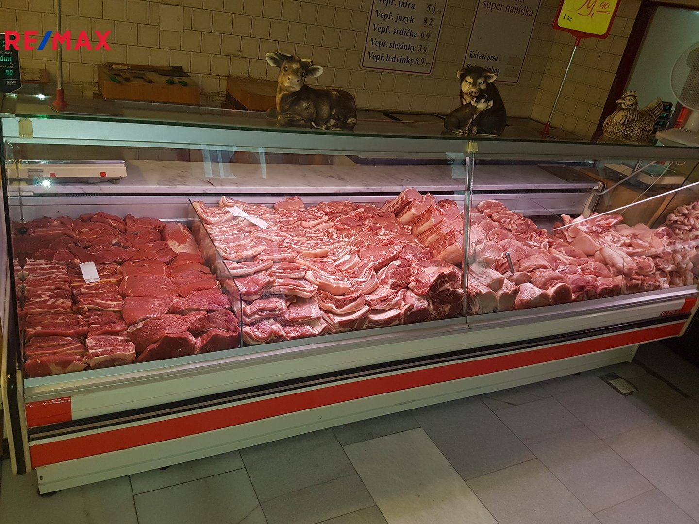 Samotná prodejna 1.NP (zastavěná plocha 283,90 m2, užitná plocha 220 m2) je nyní koncipována jako provozovna-prodejna maso-uzeniny s technickým zázemím pro vlastní provoz, skladování a činnost. Celý prostor je kompletně chlazený, a to již od nákladové rampy. Certifikovaná provozovna pro bourárenskou (červeného a bílého masa) a výrobní činnost vč. skladování. Prodejna je kompletně vybavena vč. skladově-pokladního systému, vážného systému vah do PC, datových rozvodů a kamerového systému a kompletního strojního vybavení pro výrobu a expedici masa.
