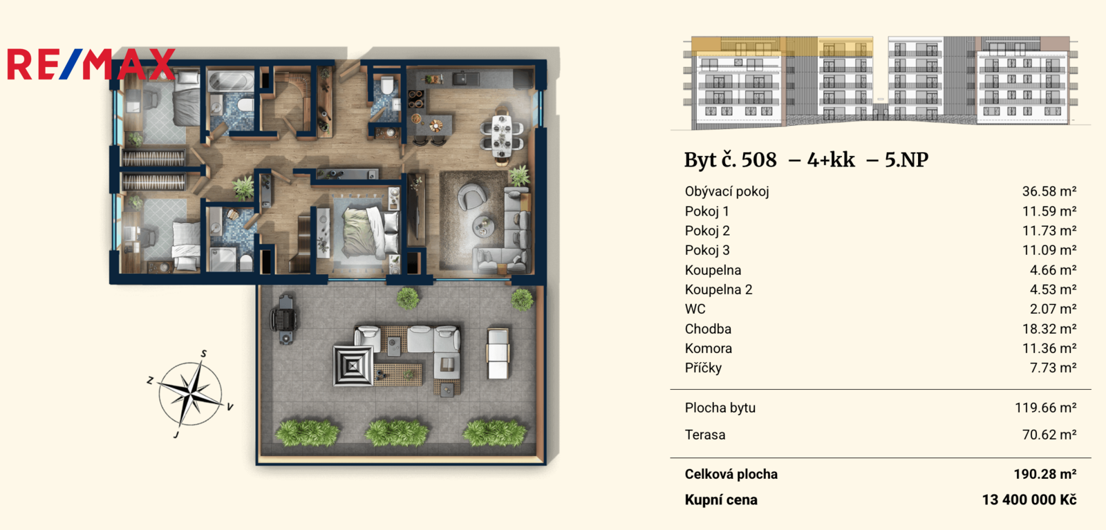 Exklusivně nabízíme nový budoucí luxusní byt o dispozici 4+KK s terasou, o celkové ploše 190 m2 , v posledním V. NP s orientací na jih. Přesné rozměry bytu: 120 m2 užitná plocha + 70 m2 terasa. Nutné dokoupit sklad o velikosti 19 m2 + 2x garážové stání v II.PP této budovy (vše vedle sebe). Tento byt nabízí bezprecedentní výhled na celou Plzeň díky své poloze a v ceně bytu je zajištěno: