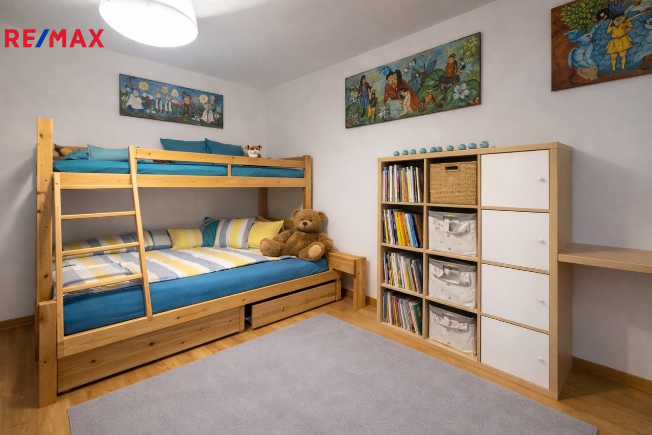 Byt nabízí velkorysé řešení vhodné pro rodiny s dětmi. Prostorný obývací pokoj s balkónem, velký dětský pokoj rozdělený na denní a noční odpočinkovou zónu. Prostorná chodba s dostatečným úložným prostorem a ložnice rodičů. K bytu náleží balkon o ploše 7 m² a terasa, které poskytují bezpečný venkovní prostor pro hru i odpočinek, dále prostorný sklep pro uskladnění dětských kol a vybavení. V domě je bezbariérový přístup do 1.patra a do sklepních prostor, což zajišťuje pohodlí při dopravě kočárků i manipulaci s věcmi k uskladnění. Prostor nad plošinou může být v budoucnu využit pro výtah.