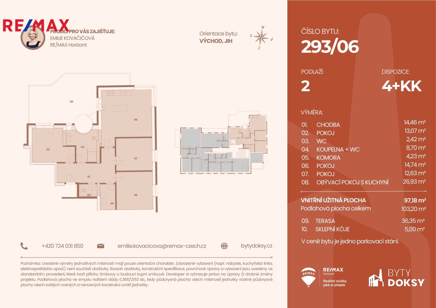 Výměry podle prohlášení vlastníka: 103,20 m² + balkon 36,35 m² + sklep 5,00 m² + parkovací stání
