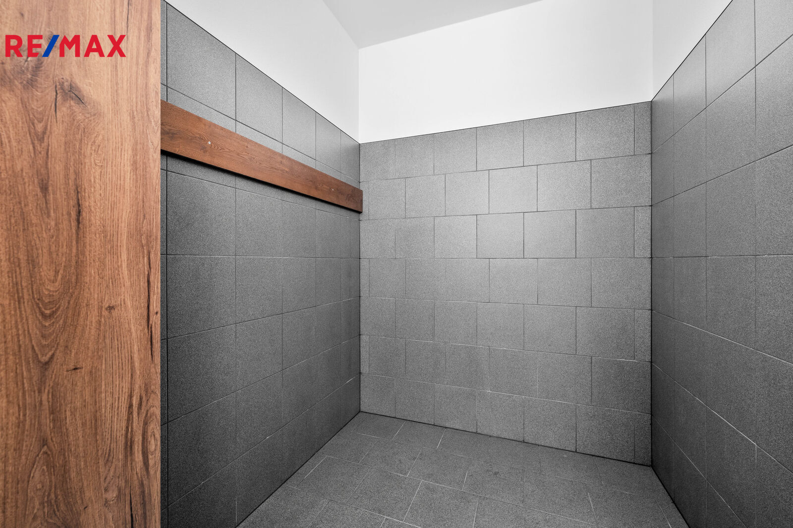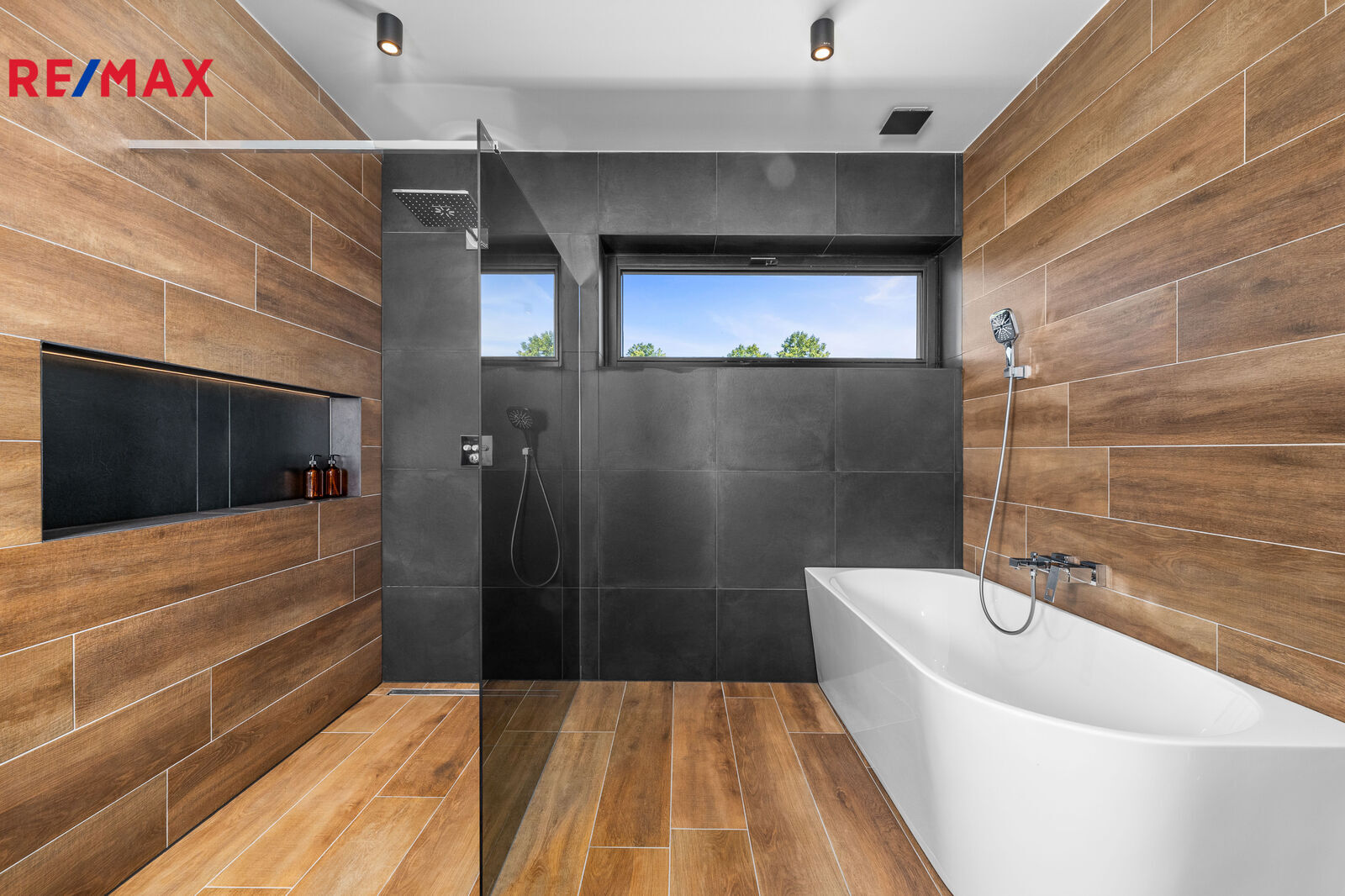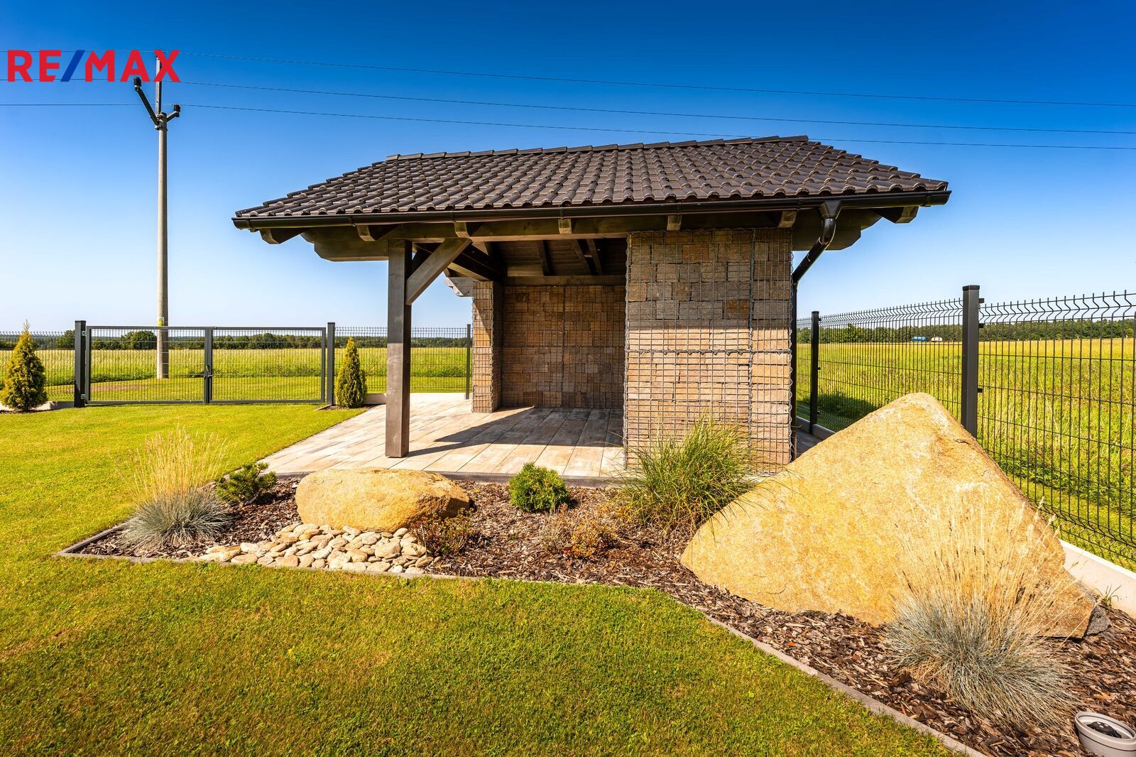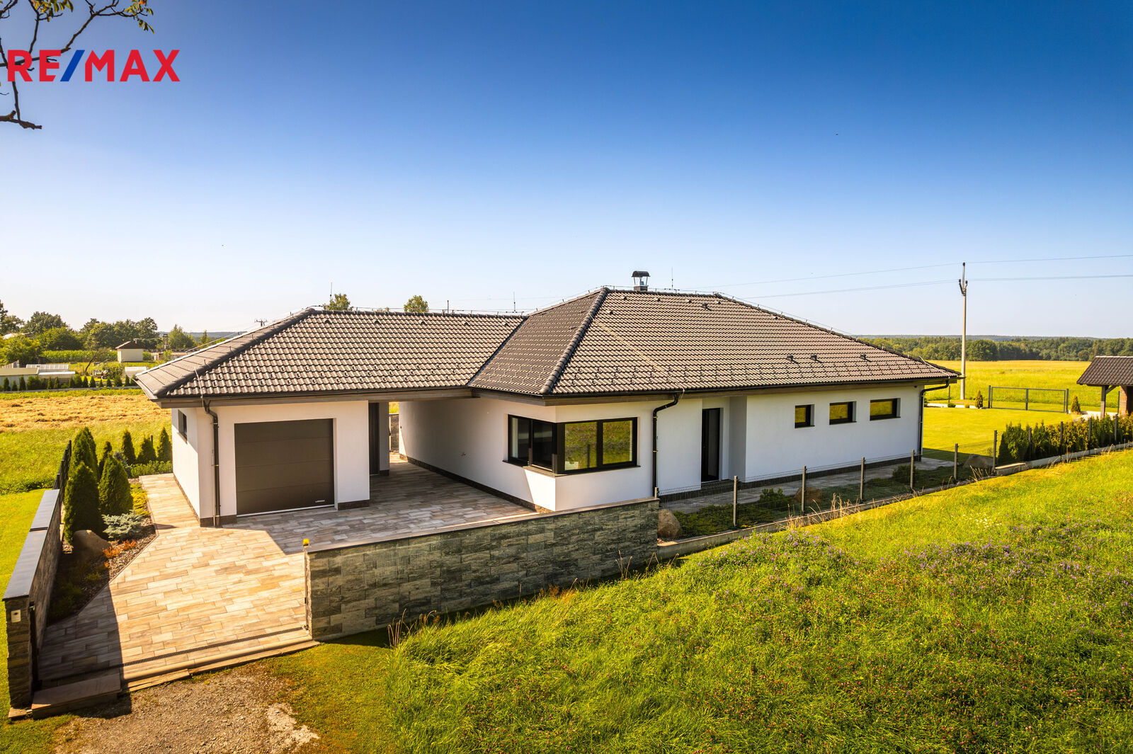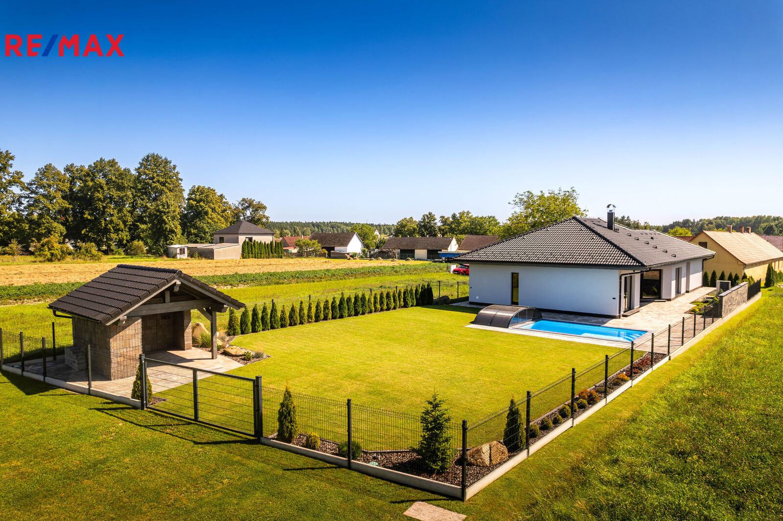 Součástí pozemku o celkové výměře 912 m2 je samostatný, nepodsklepený rodinný dům typu bungalov se samostatnou garáží se skladem o celkové zastavěné ploše 192 m2. Prostor mezi garáží a domem je zastřešen a vznikl zde tak prostor pro parkování dalšího vozu. Součástí nemovitosti je také zastřešená pergola umístěná v zadní části zahrady a krytý venkovní bazén navazující na vydlážděnou terasu obklopující celý dům.