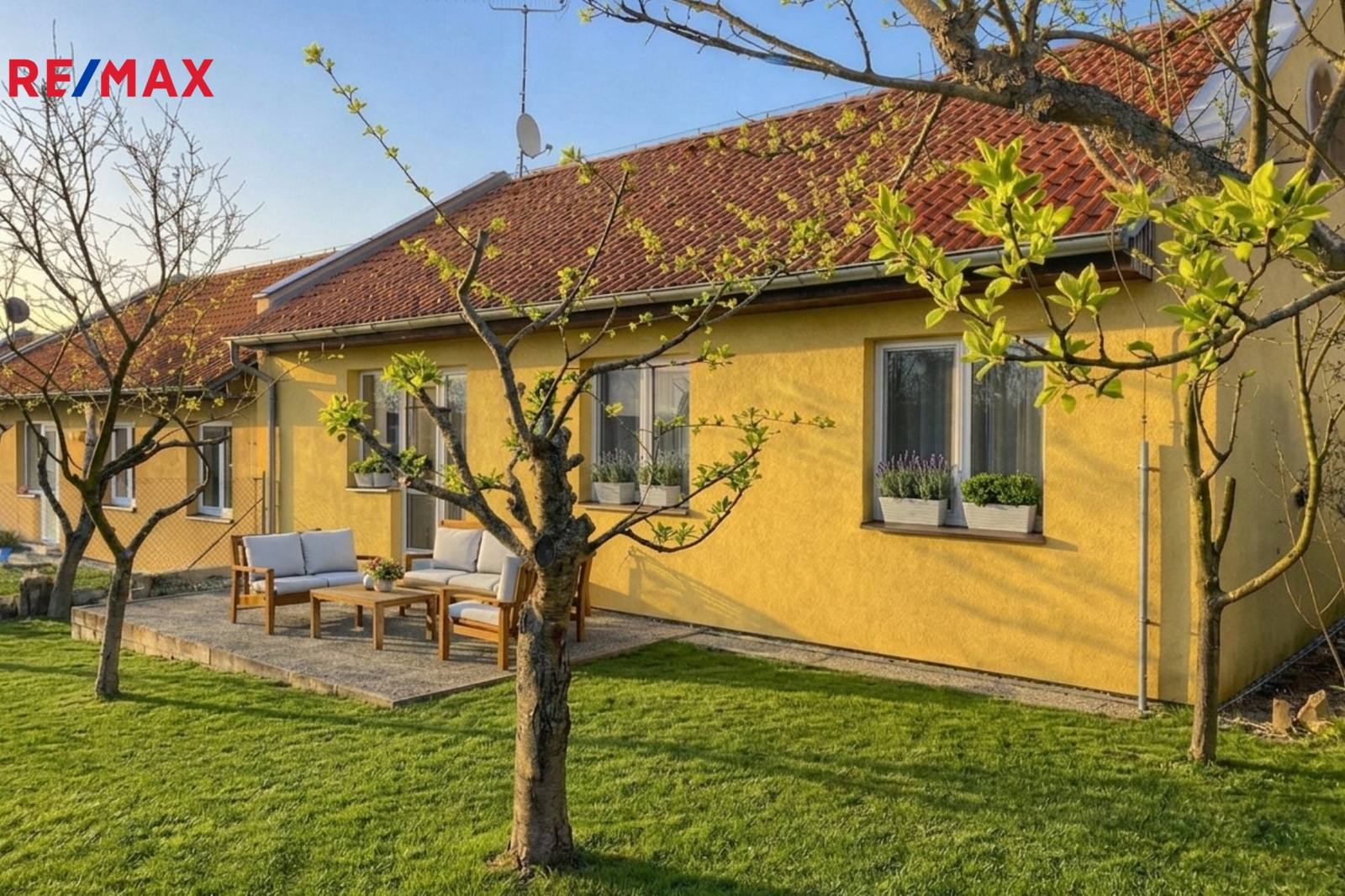 Vstup do domu je orientován na východ, terasa a zahrada na západ – ideální pro slunné odpolední posezení.