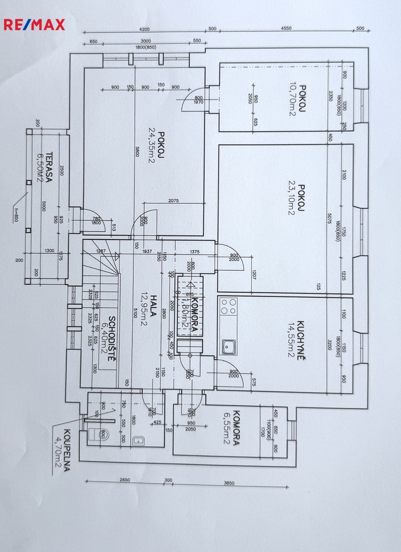 Pokoje jsou o velikosti cca 24,35m2, 23,10m2, 10,70 m2 + kuchyně 14,55m2 + hala 12,95m2+ koupelna s toaletou 4,70m2 (+ dvě šatny).