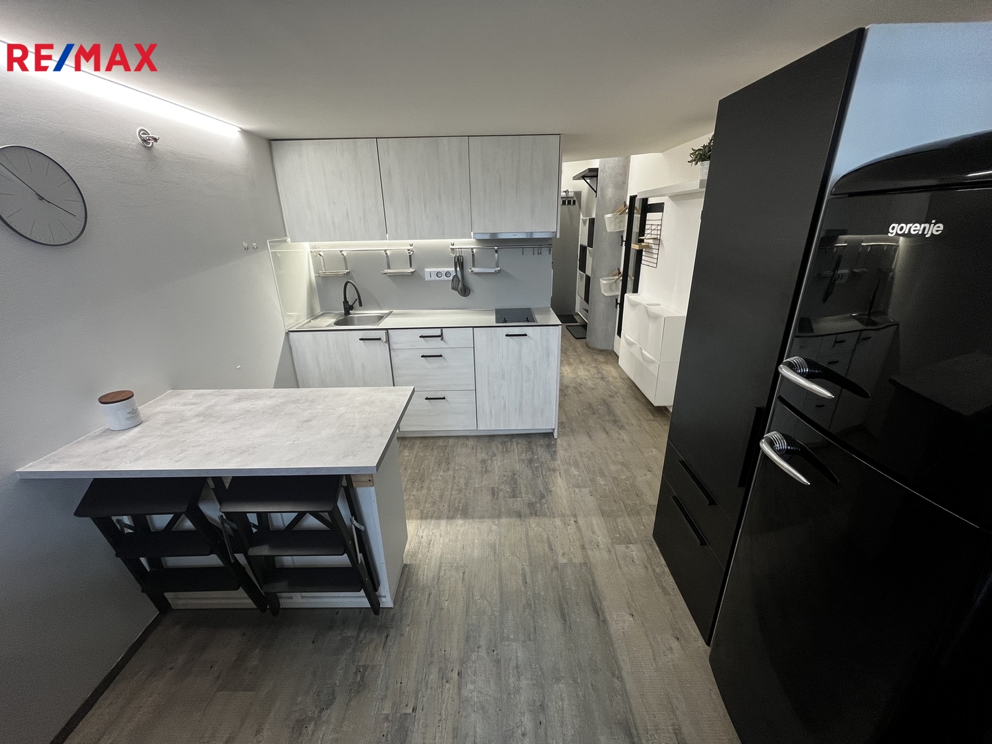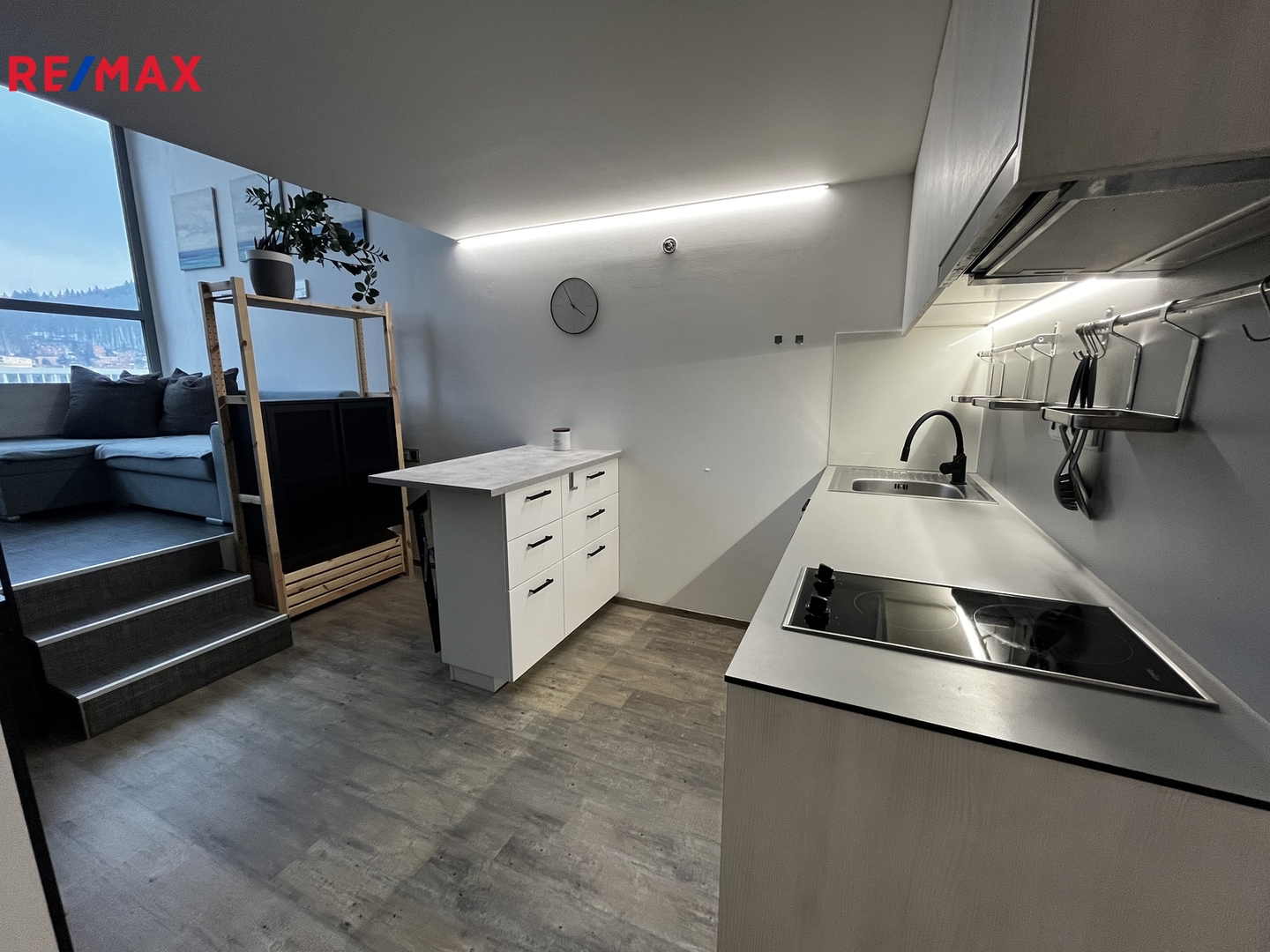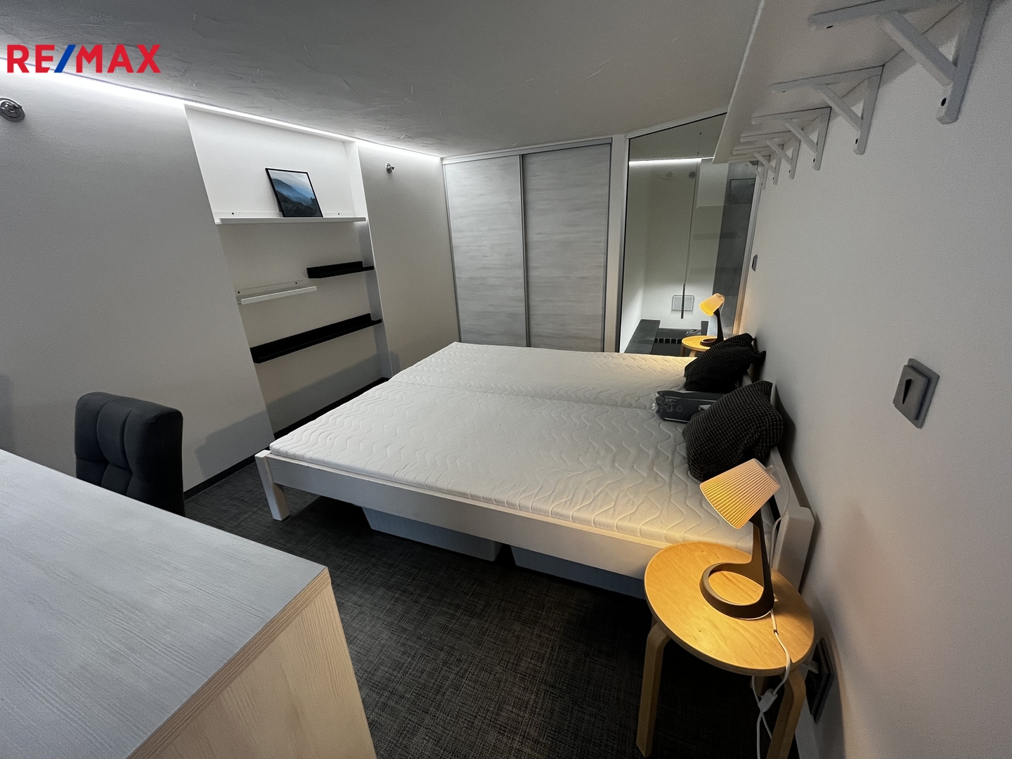 Byt se nachází v 9. patře a je plně vybavený, stačí si přinést osobní věci a začít bydlet. Otevřený moderní interiér zahrnuje kuchyňský a jídelní kout navazující na obývací část s pohovkou a televizí. Po schodišti se vstupuje do ložnice s postelí a prostornou vestavěnou skříní.